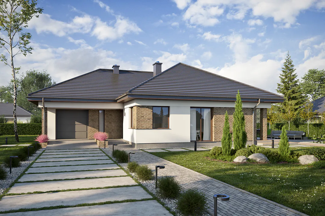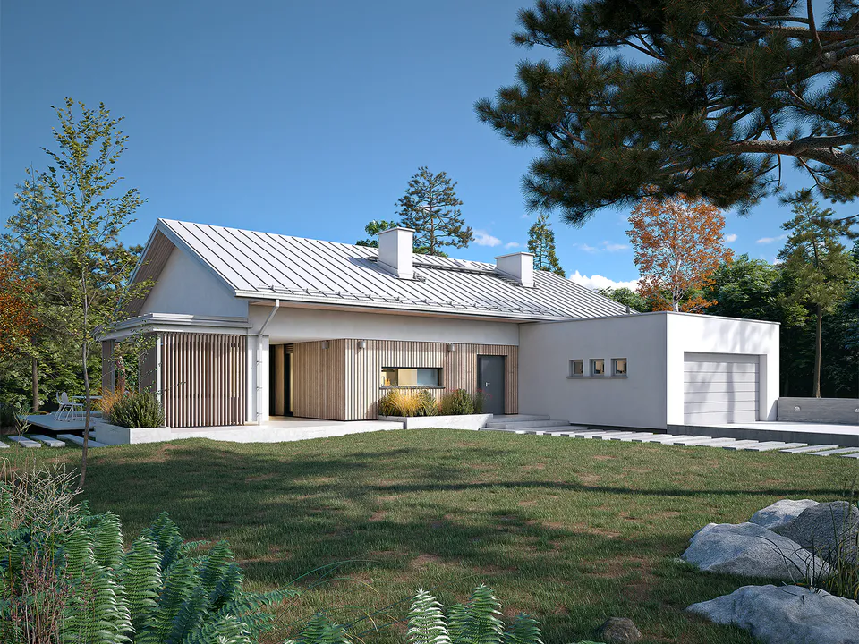 Проект одноэтажного дома с гаражом и террасой.