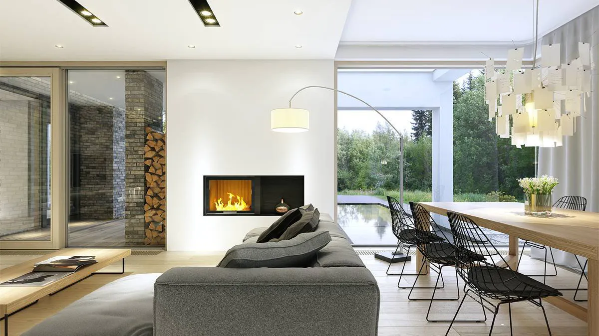 В проекте предусмотрен навес для автомобиля, выдержанный в том же минималистическом стиле и частично крытая терраса. Большие окна со стороны дневной зоны обеспечивают хорошее естественное освещение внутрь дома и создают ощущение простора.