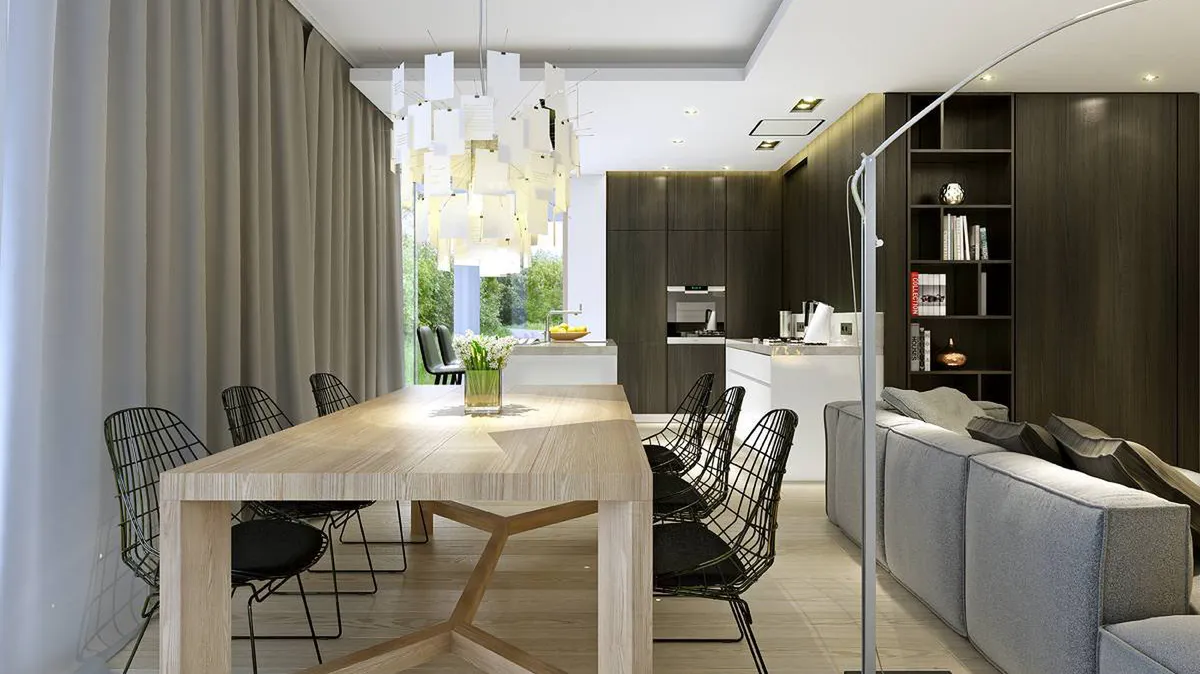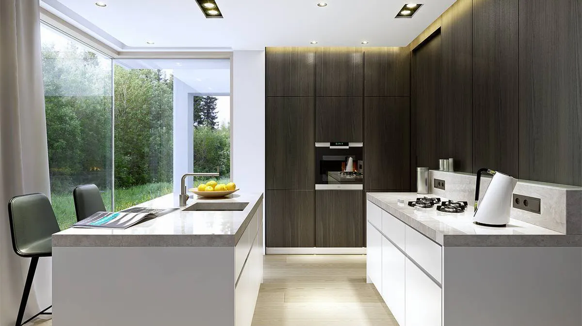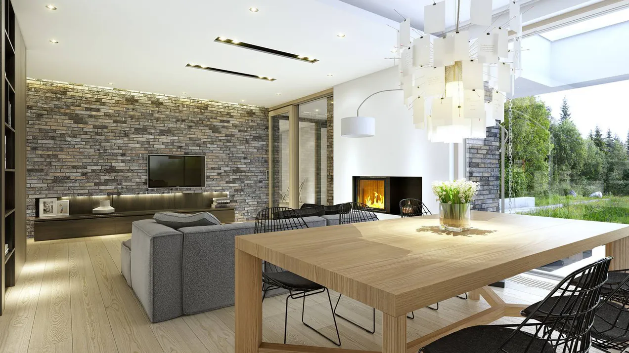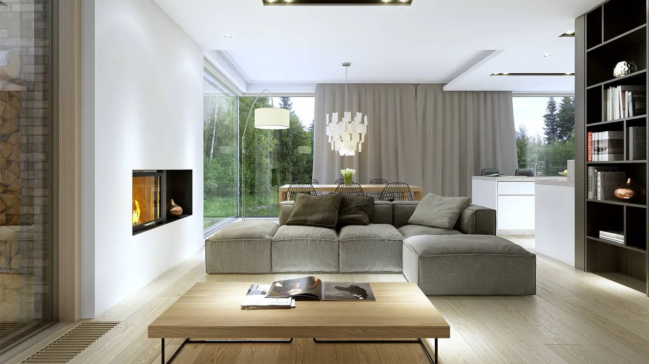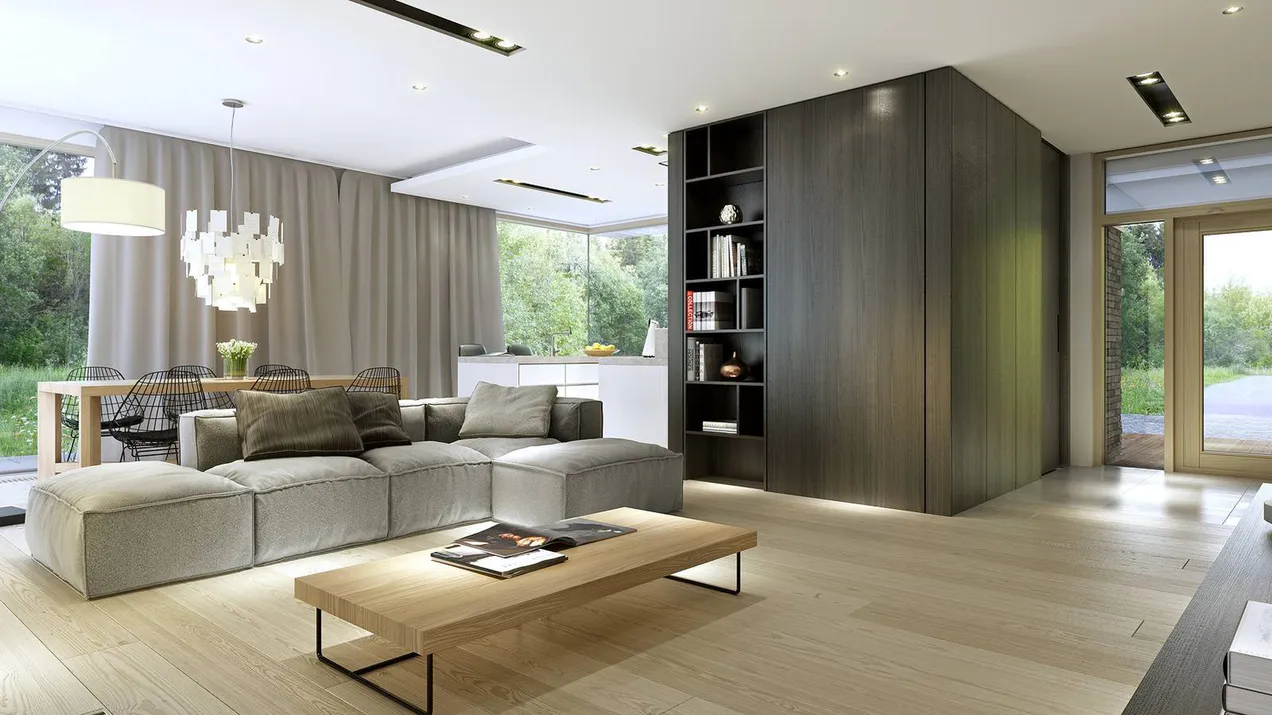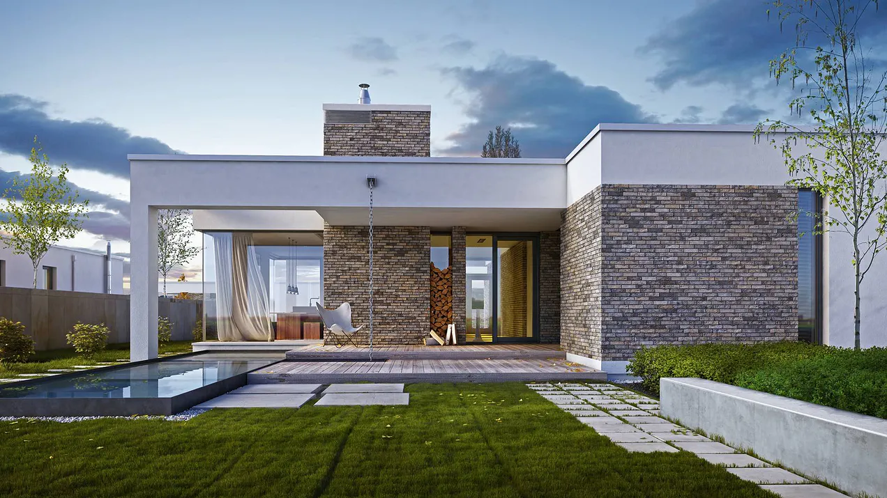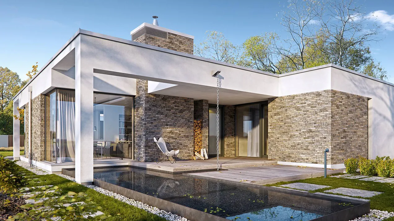 Проект представляет собой современный одноэтажный дом с плоской крышей, выполненный в минималистическом архитектурном стиле с применением светлых тонов и геометрических форм. Фасад покрыт белой штукатуркой, часть стен покрыта серой клинкерной плиткой, что добавляет текстурный и цветовой контраст.