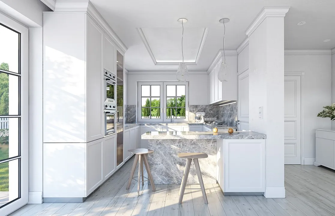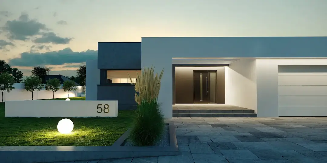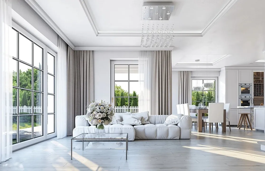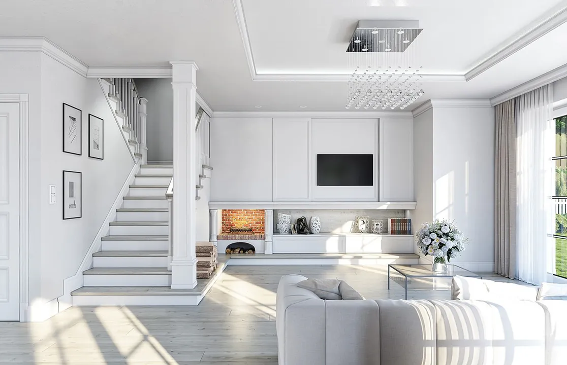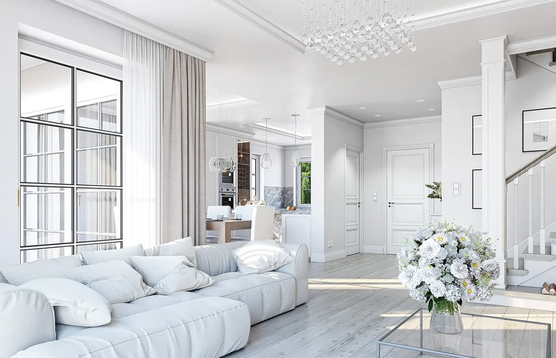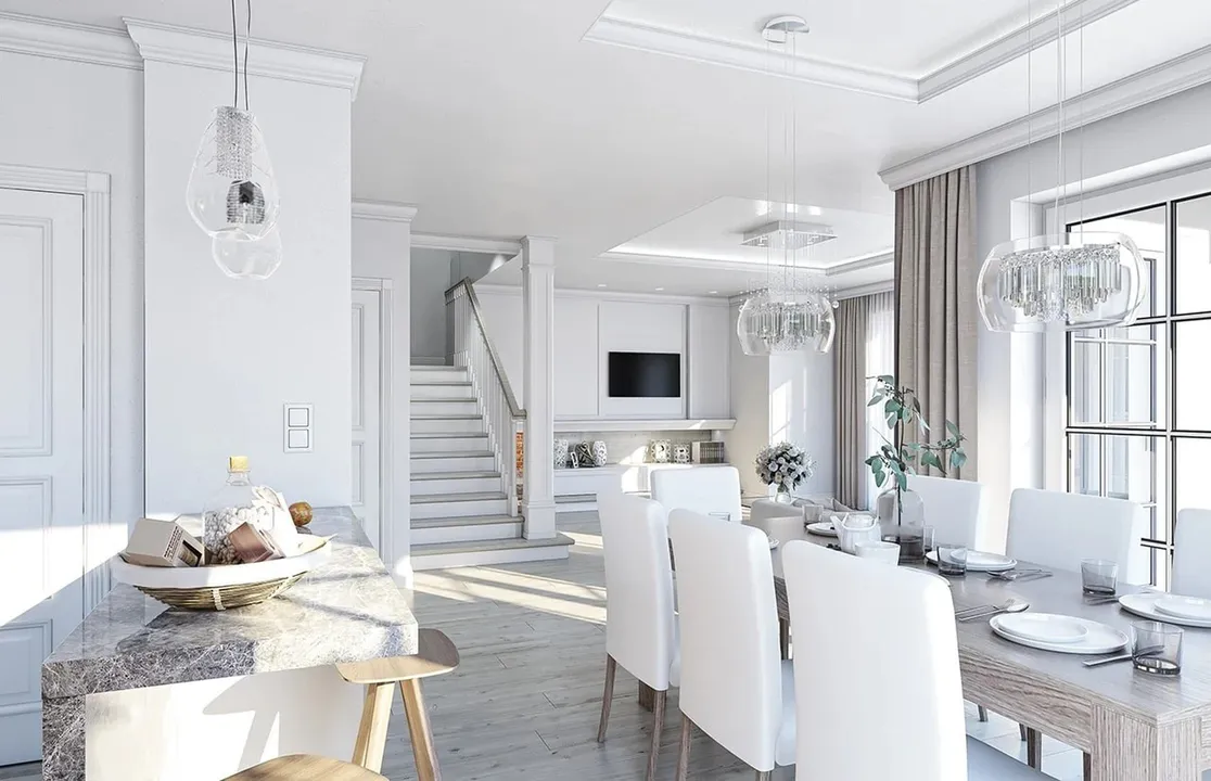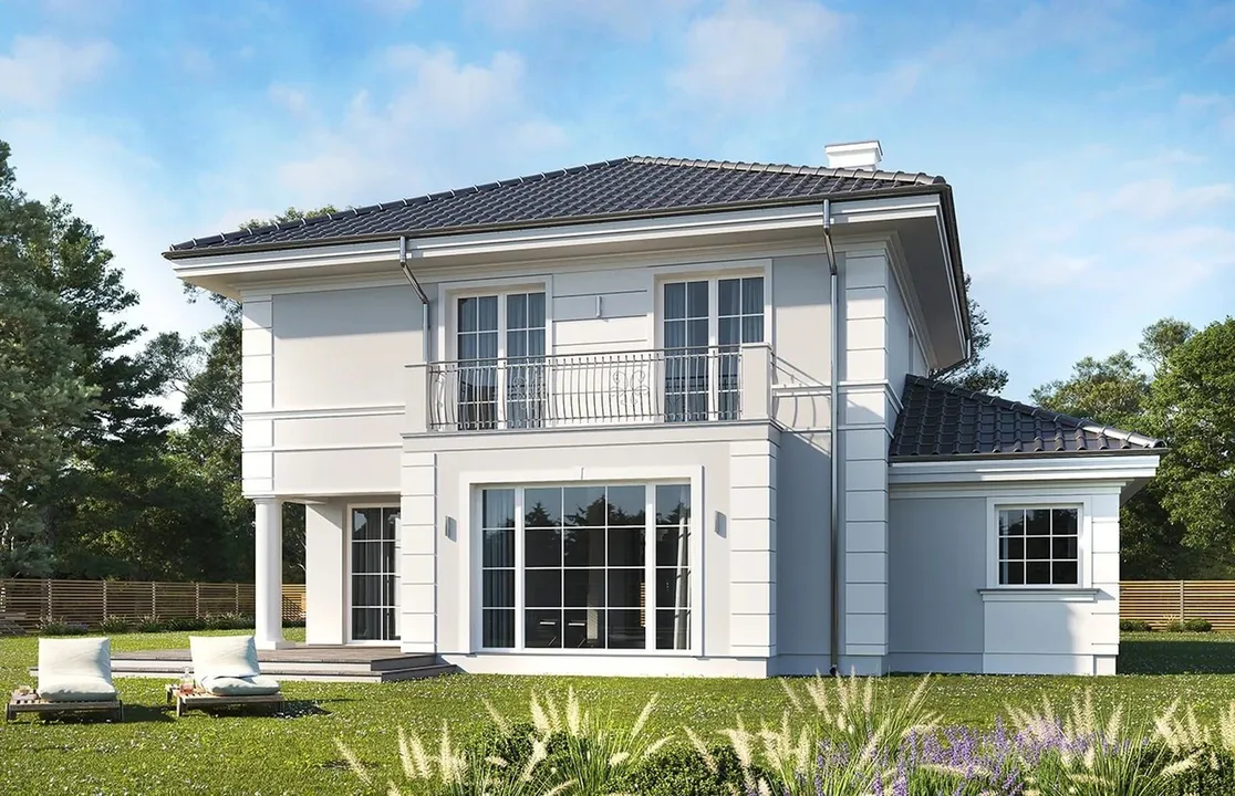 Дом окрашен белой штукатуркой, что придает ему элегантный и свежий вид. Крыша дома четырехскатная с небольшим уклоном и покрытая темно-серой плоской черепицей, что контрастирует с белым фасадом. Фасад украшают классические архитектурные детали.