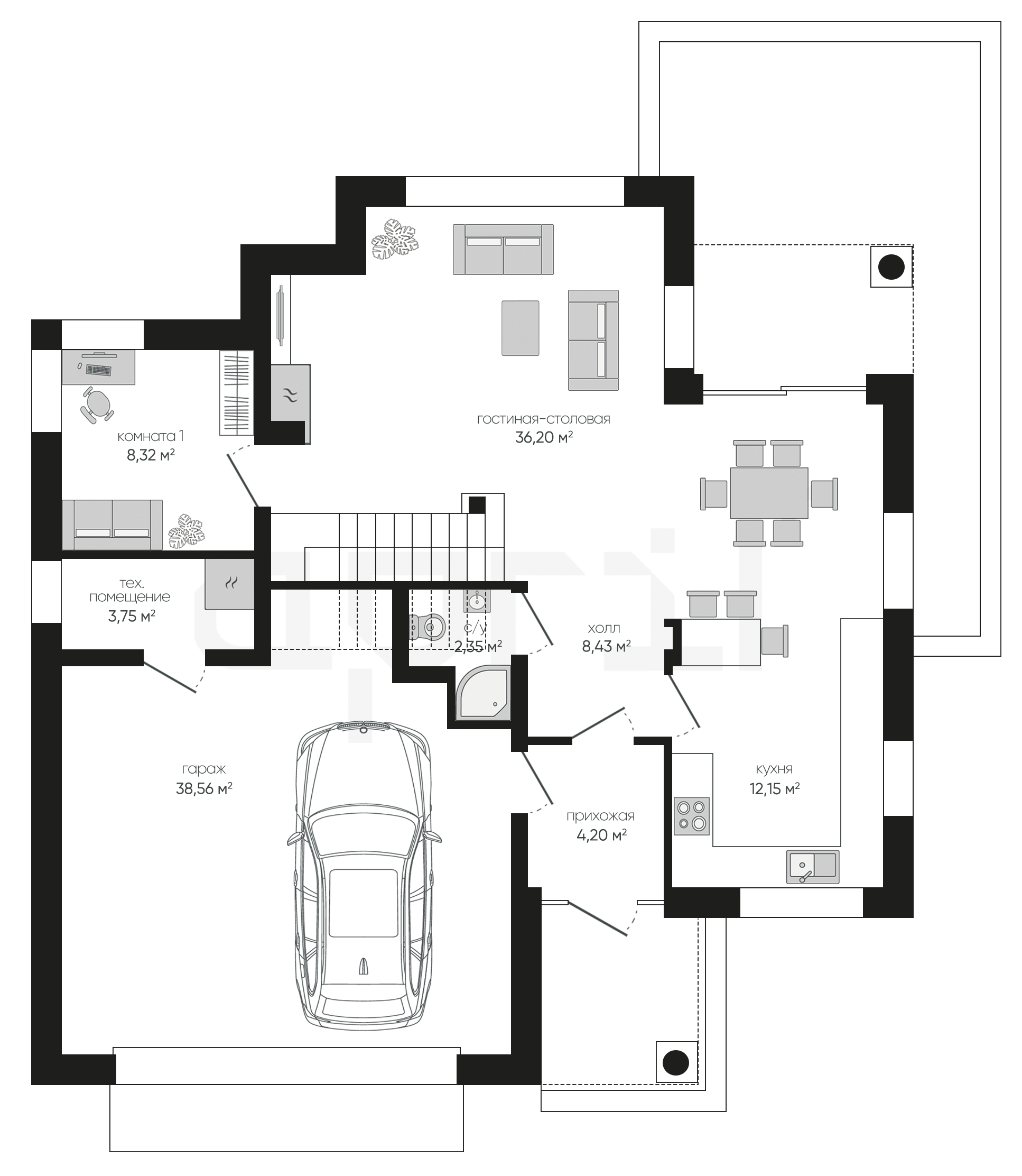 Дома 1 этаж с гаражом и террасой