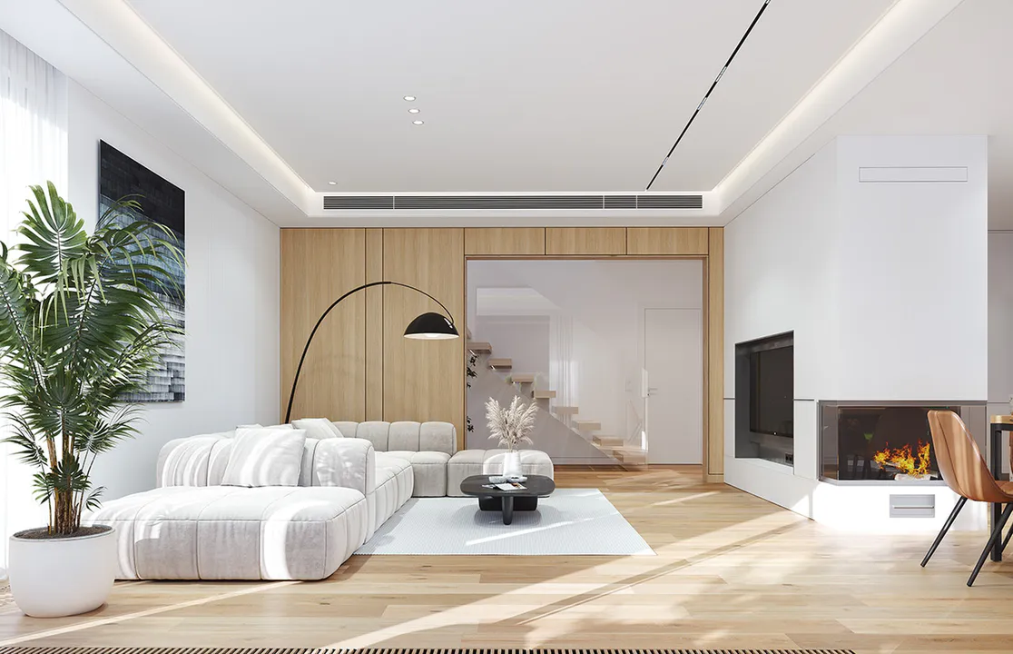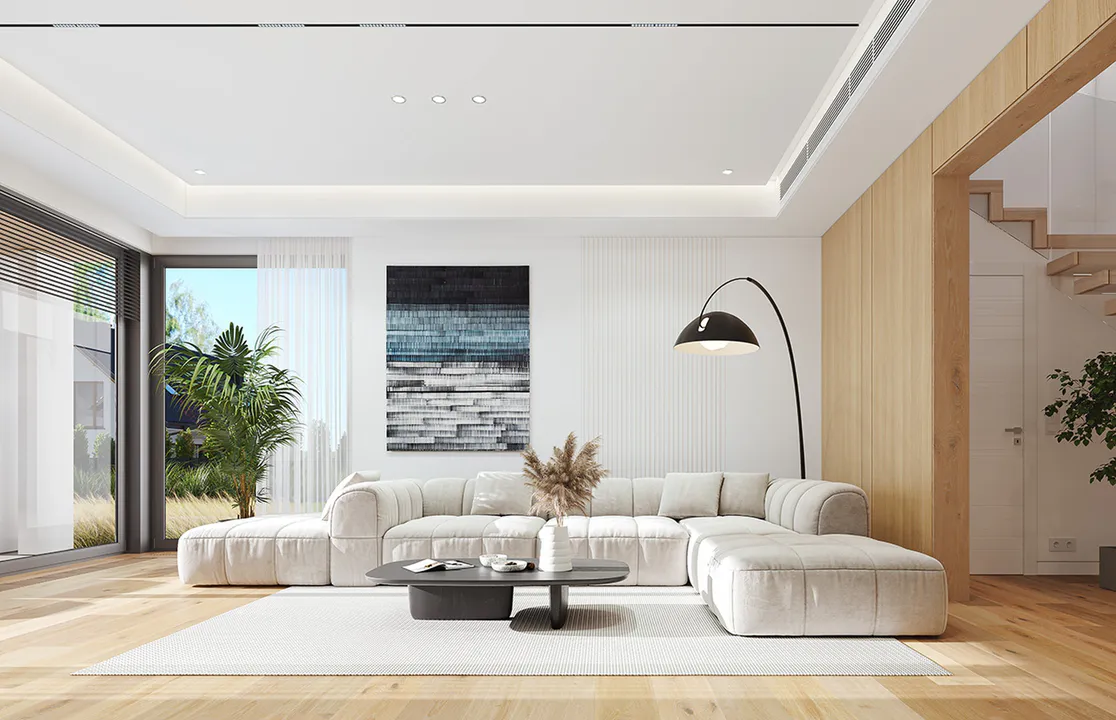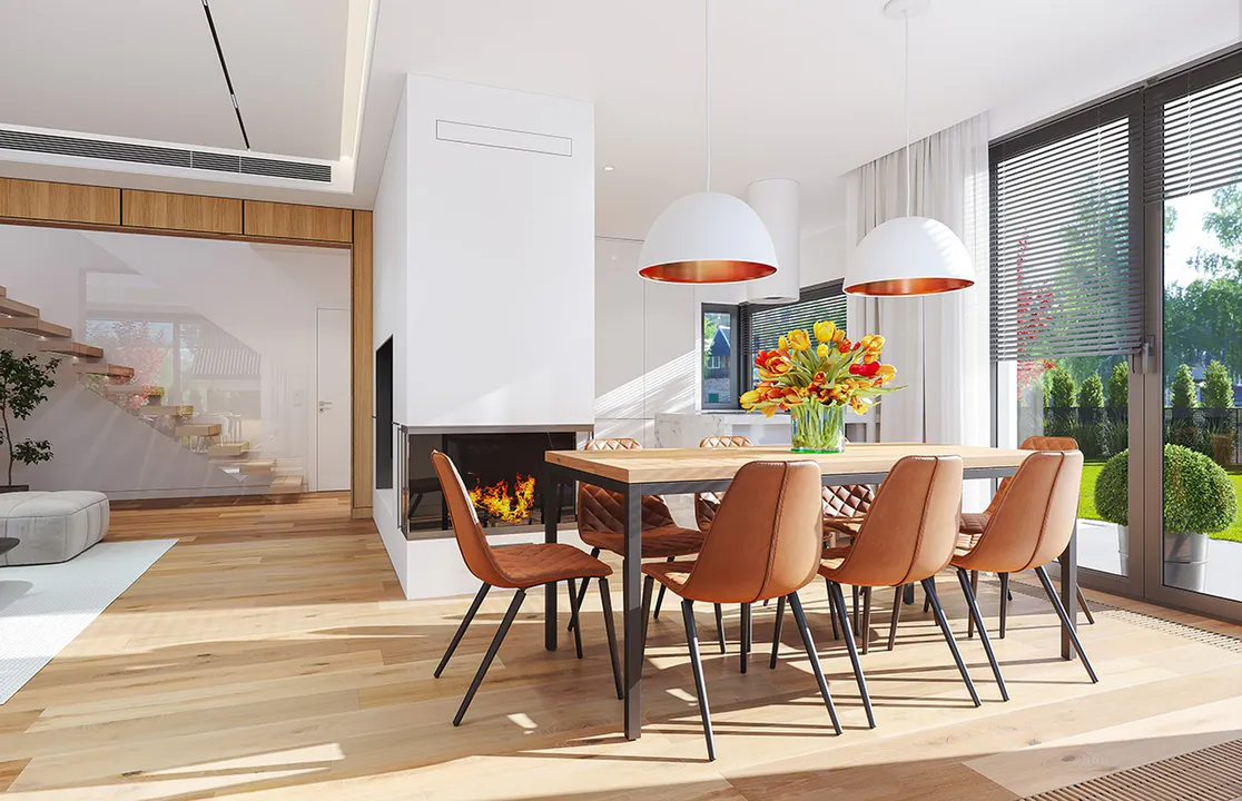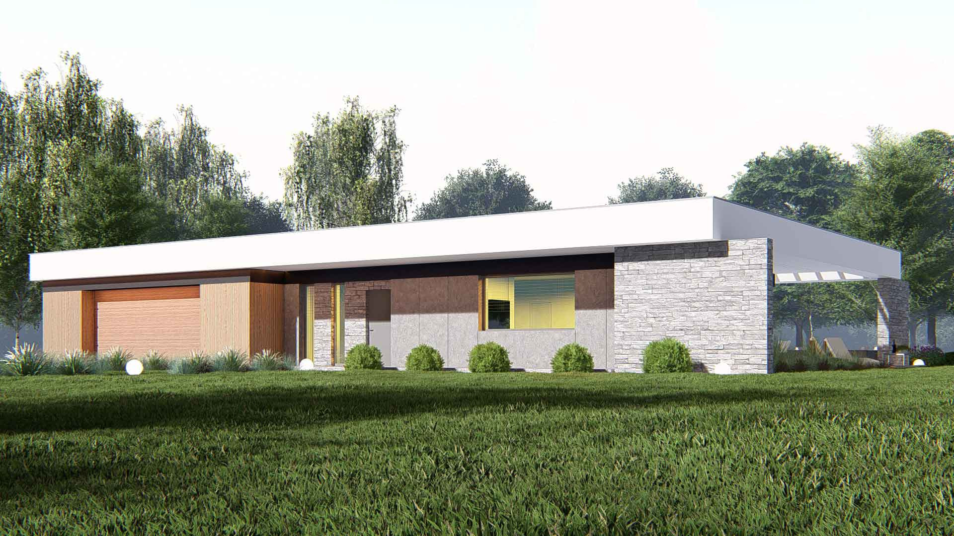 К дому пристроен гараж на две машины с террасой на крыше, доступной со второго этажа. Внутри дома планировка разделена на функциональные зоны.