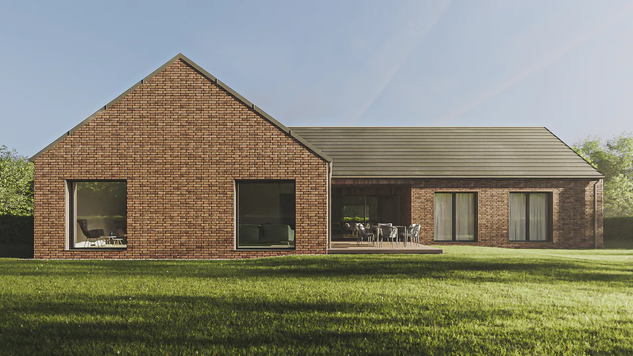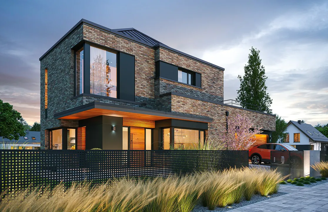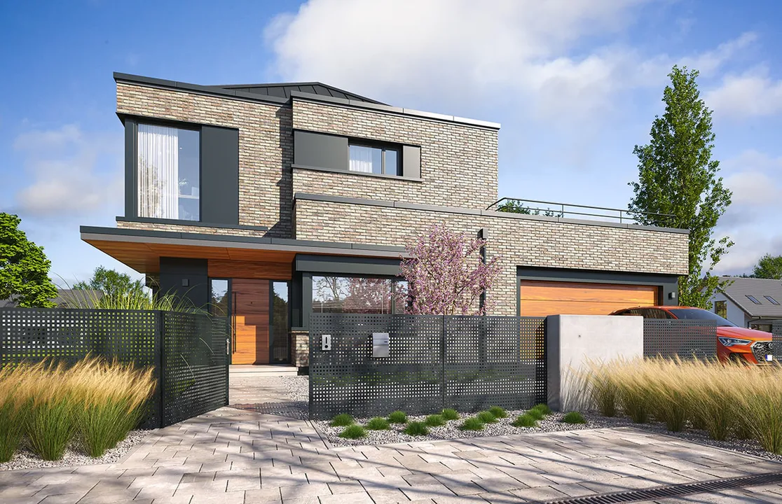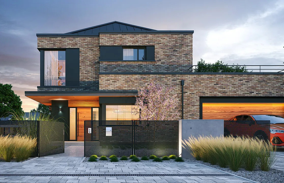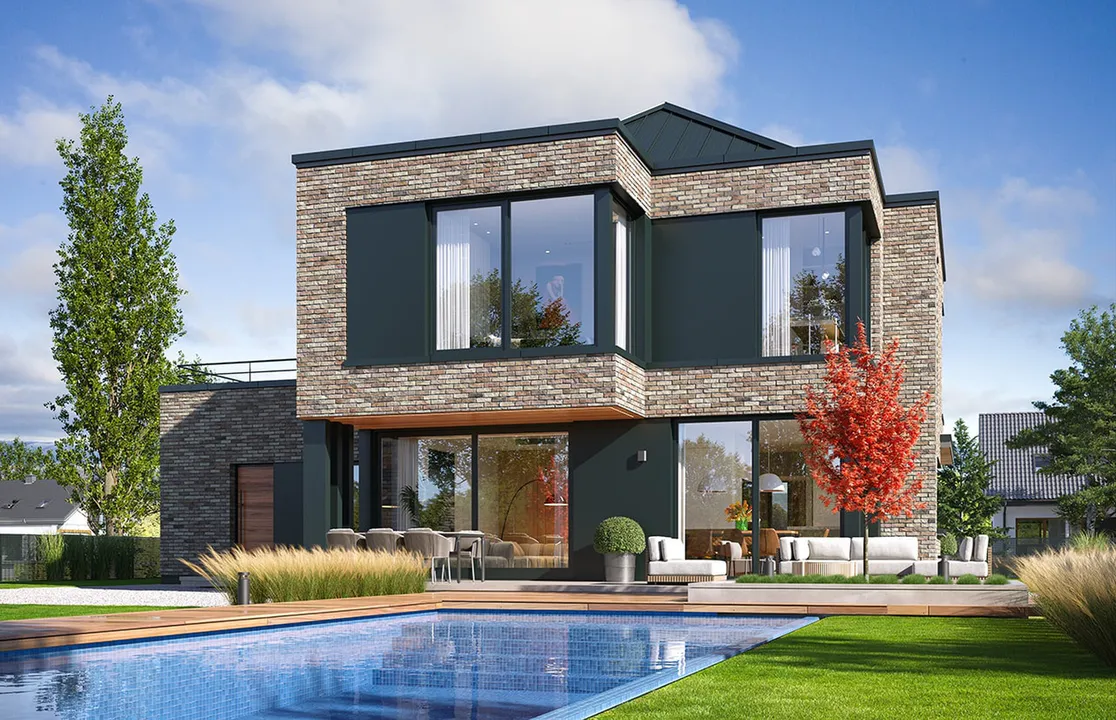 Фасады дома украшены большими остеклениями и облицовкой стен клинкером, что придает элегантность и уникальность, сочетаясь с контрастными цветами оконных рам и штукатурки.