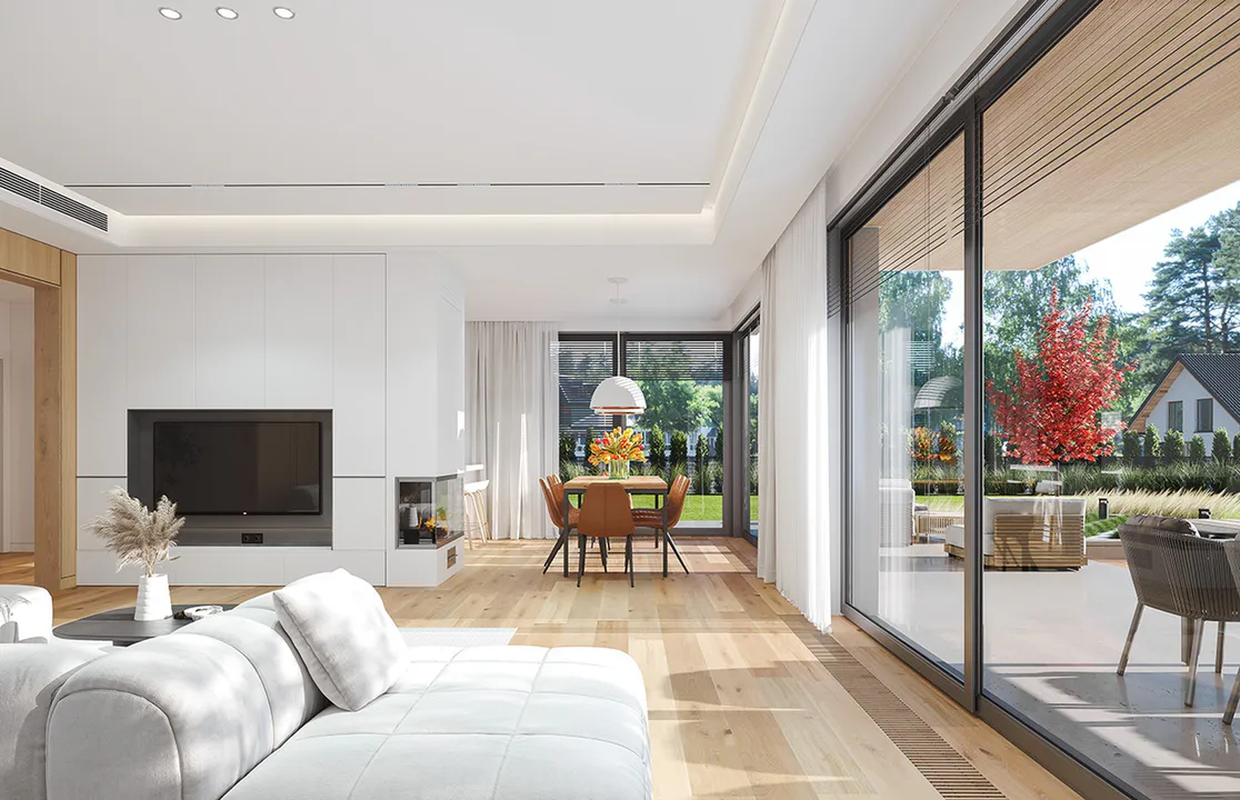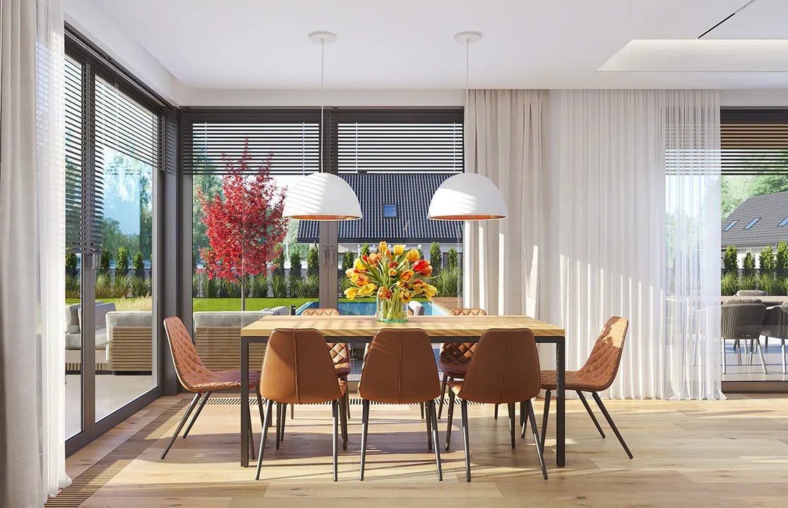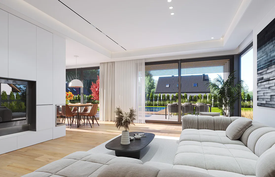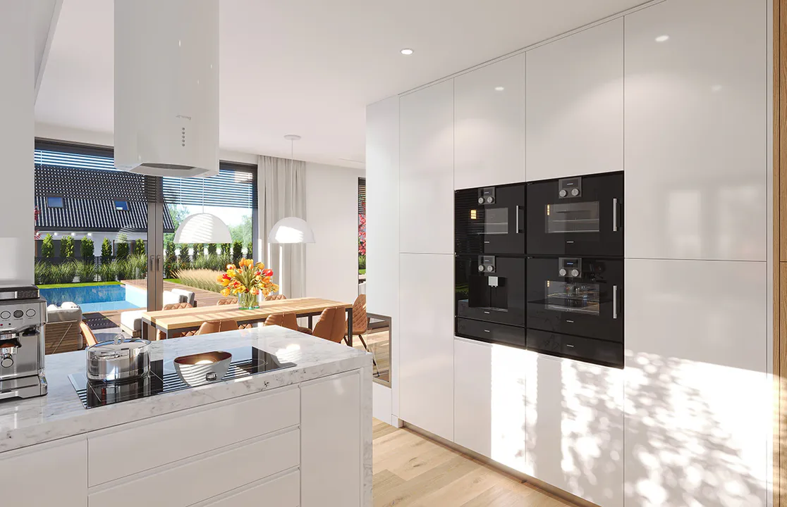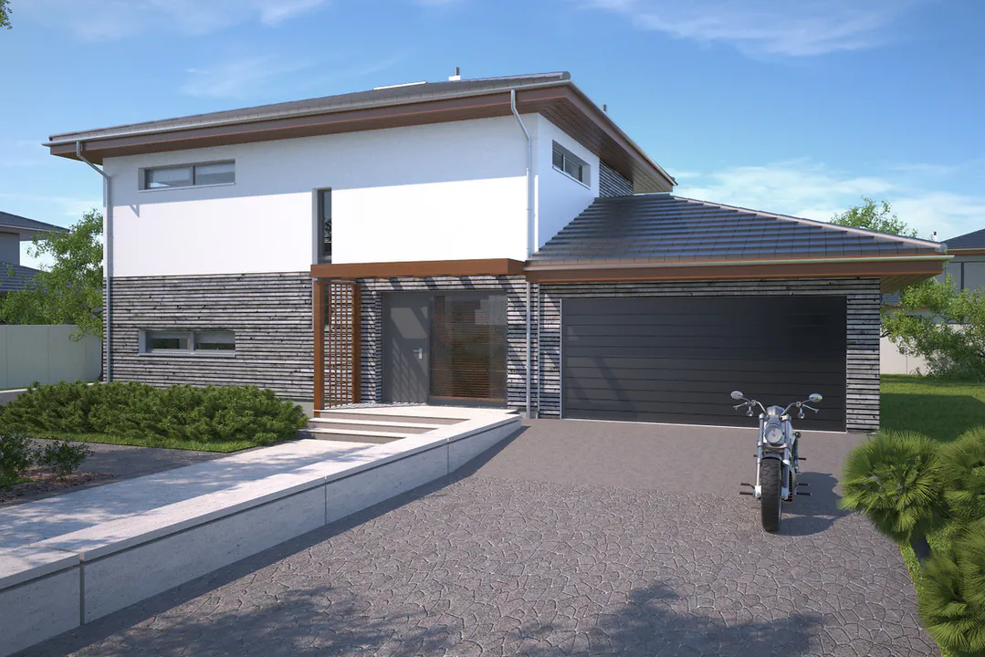 Фасады дома украшены большими остеклениями и облицовкой стен клинкером, что придает элегантность и уникальность, сочетаясь с контрастными цветами оконных рам и штукатурки.