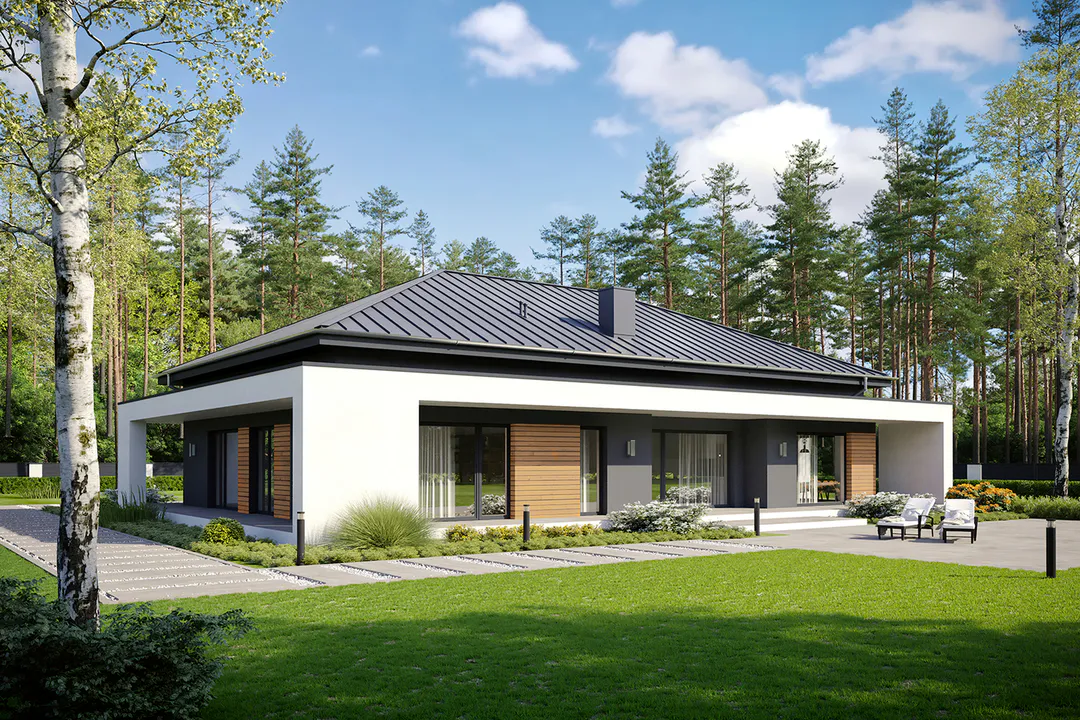Проект современного одноэтажного дома с гаражом, террасой и чердаком свободного назначения.