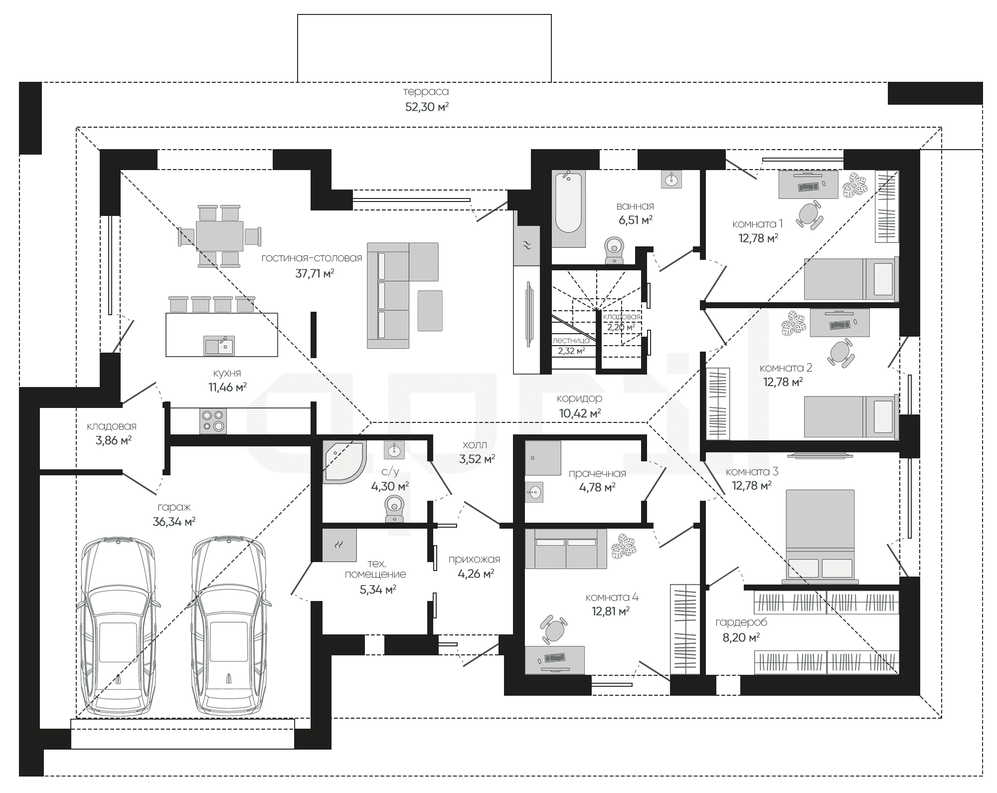 Компактная форма дома с четырехскатной крышей выглядит стильно и компактно. Проект является интересным примером современного дизайна, привлекающим внимание своей уникальностью и функциональностью.