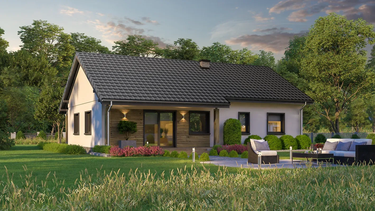 Проект одноэтажного дома без гаража с простой конструкцией.