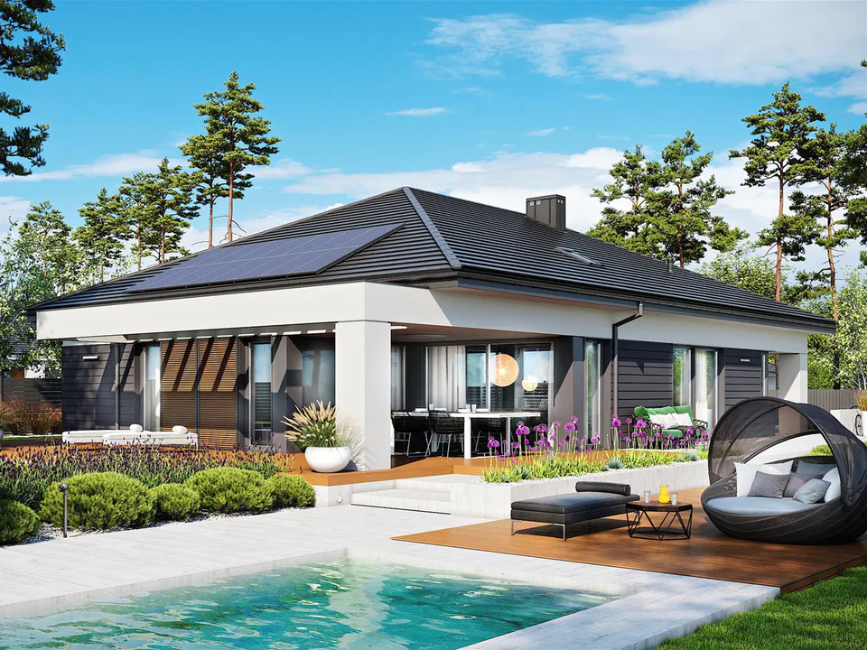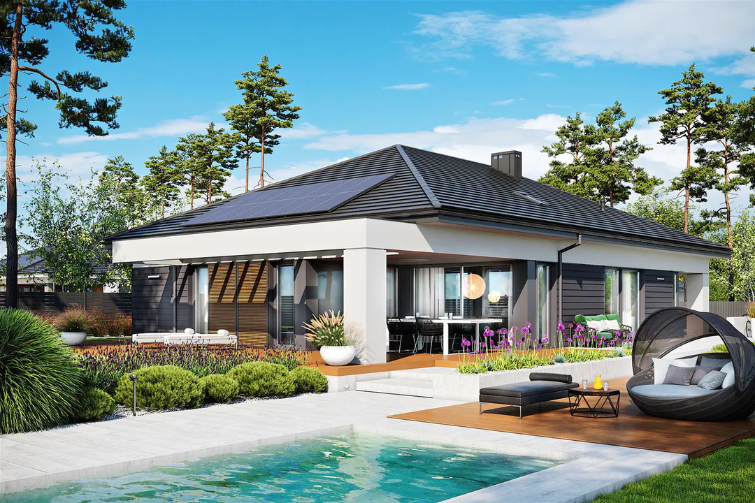 Проект одноэтажного дома в современном стиле с четырехскатной крышей. Изюминкой дома является элегантный фасад, в котором использовано современное сочетание бело-серой штукатурки и фиброцементных панелей серого цвета. Впечатляющий снаружи и еще более интересный внутри.