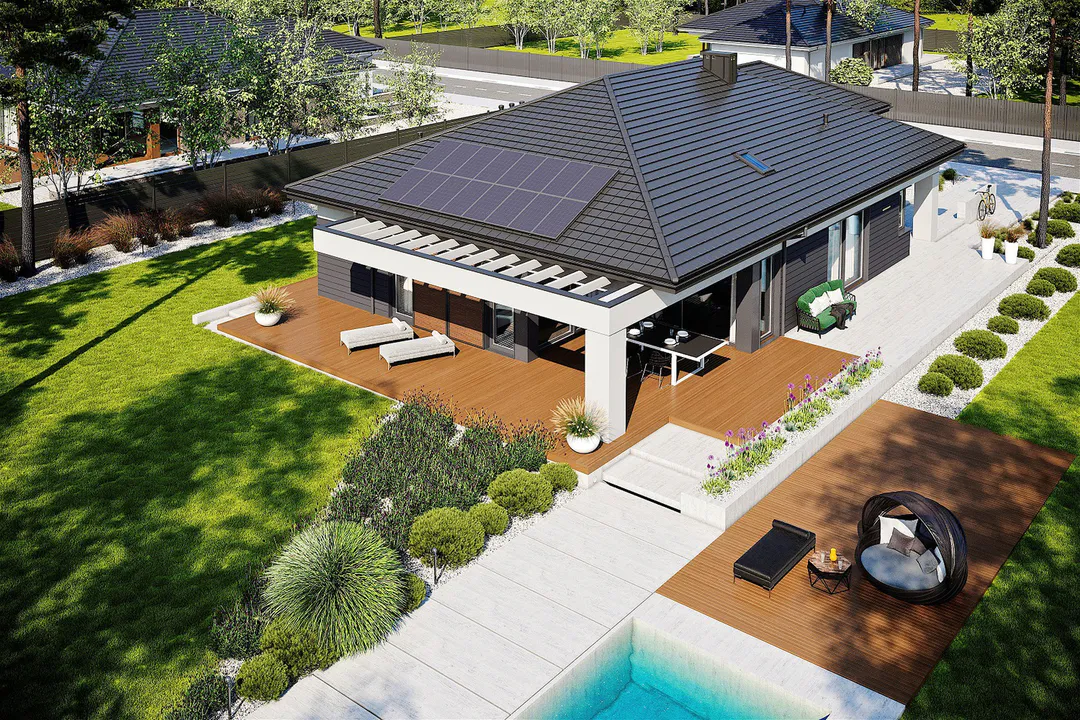 Проект с интегрированным гаражом и крытой террасой рассчитан на семью из 4-5 человек. Дом поделён на открытую дневную зону и приватное пространство для отдыха.