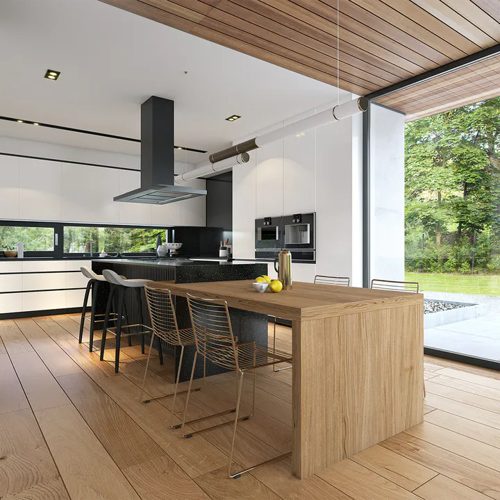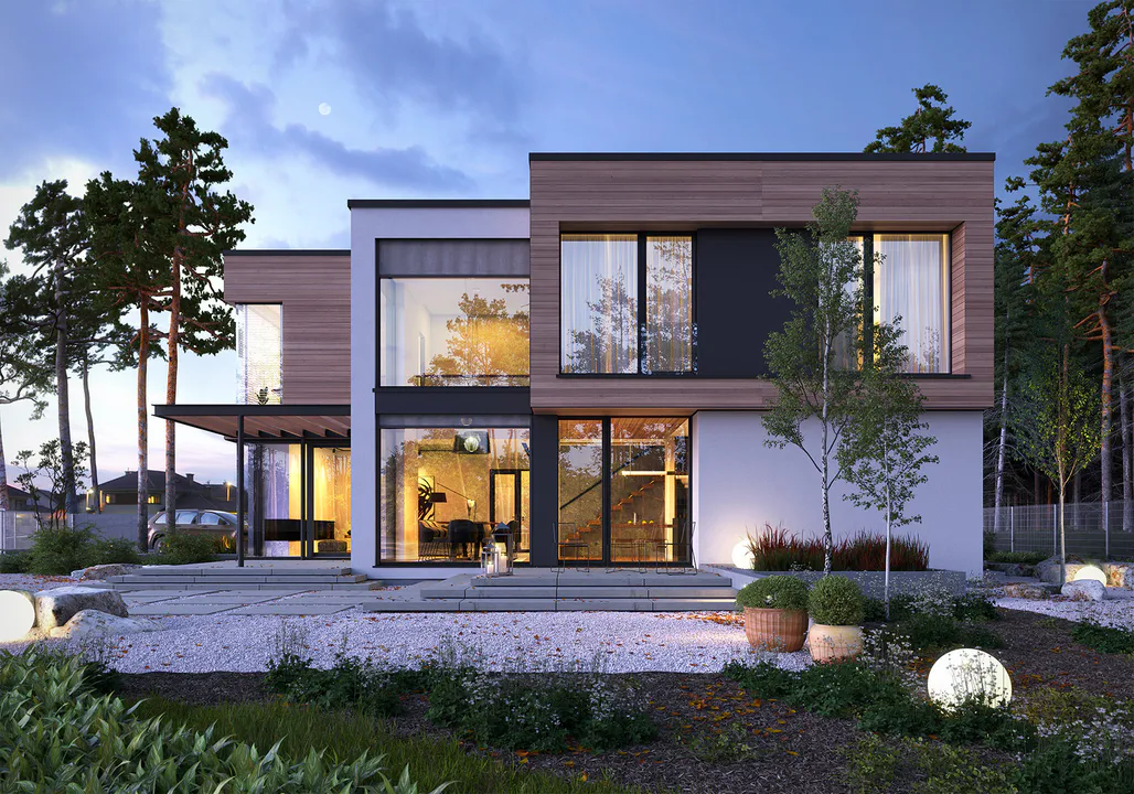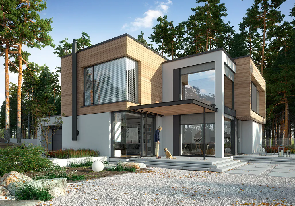 Проект современного двухэтажного дома в стиле хайтек с плоской крышей и большим гаражом на две машины. Помимо плоской крыши, современный стиль дома подчеркивают отделочные материалы, большое остекление и фасадный профиль из кедра.