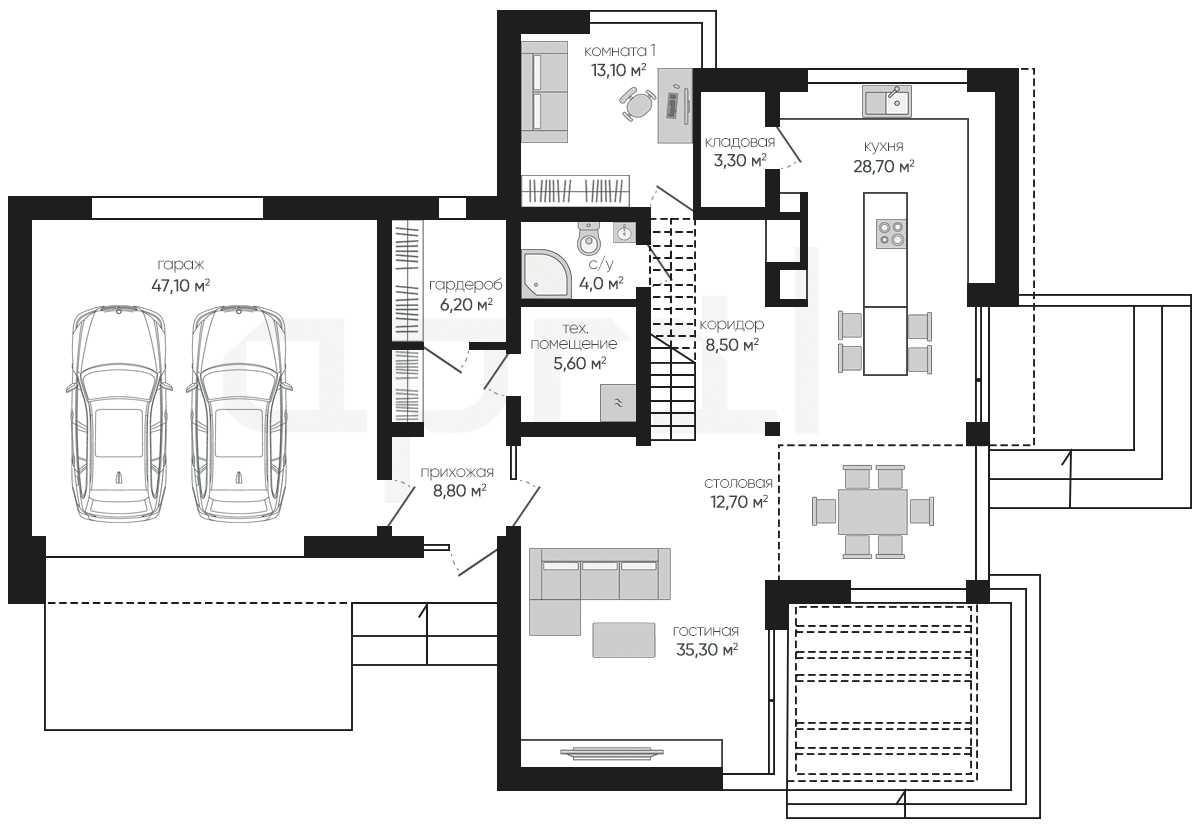 Планировочные решения этого проекта отличаются от стандартных проектов удобным разделением на большие открытые зоны с рациональным использованием пространства.