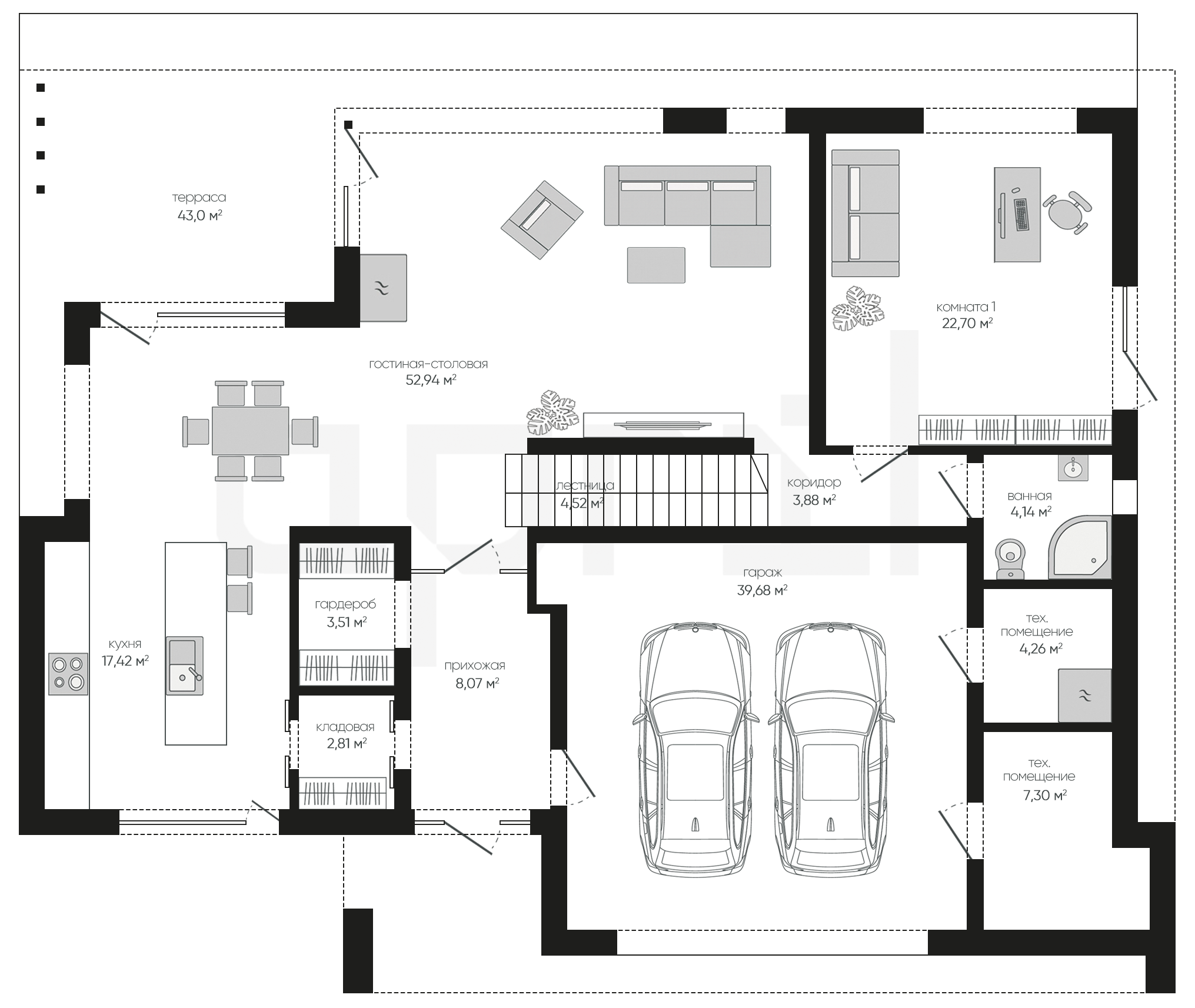 Дизайн дома не только эстетичен, но и функционален, позволяя максимально использовать естественное освещение и окружающий ландшафт. Это говорит о том, что дом гармонично впишется в современный городской или загородный ландшафт.