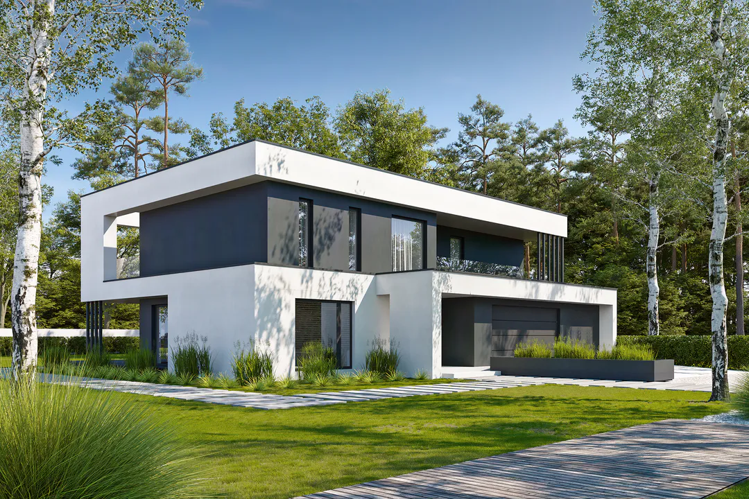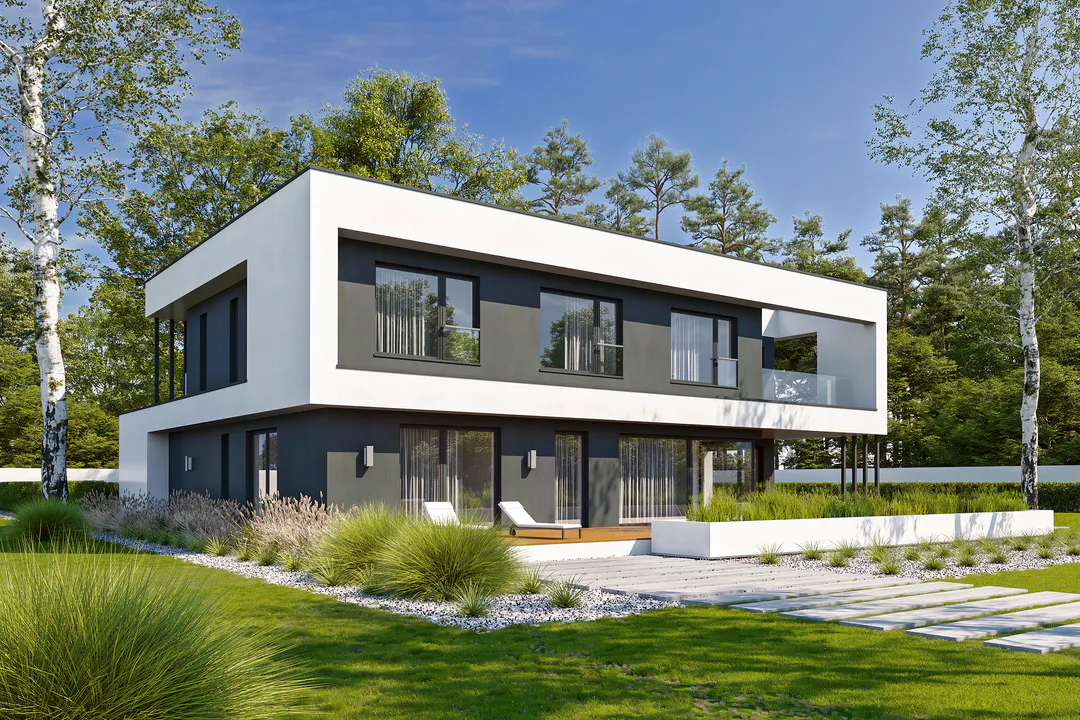 Проект двухэтажного дома с плоской крышей и уникальным современным стилем хайтек. Плоская крыша и панорамное остекление создают ощущение легкости и пространства, а бело-серый фасад, отделанный штукатуркой, придает ему контраст и стиль.