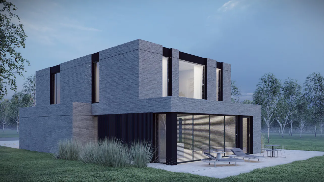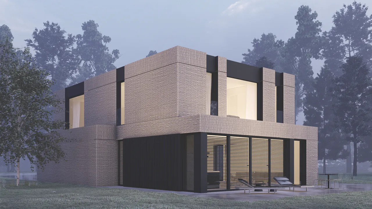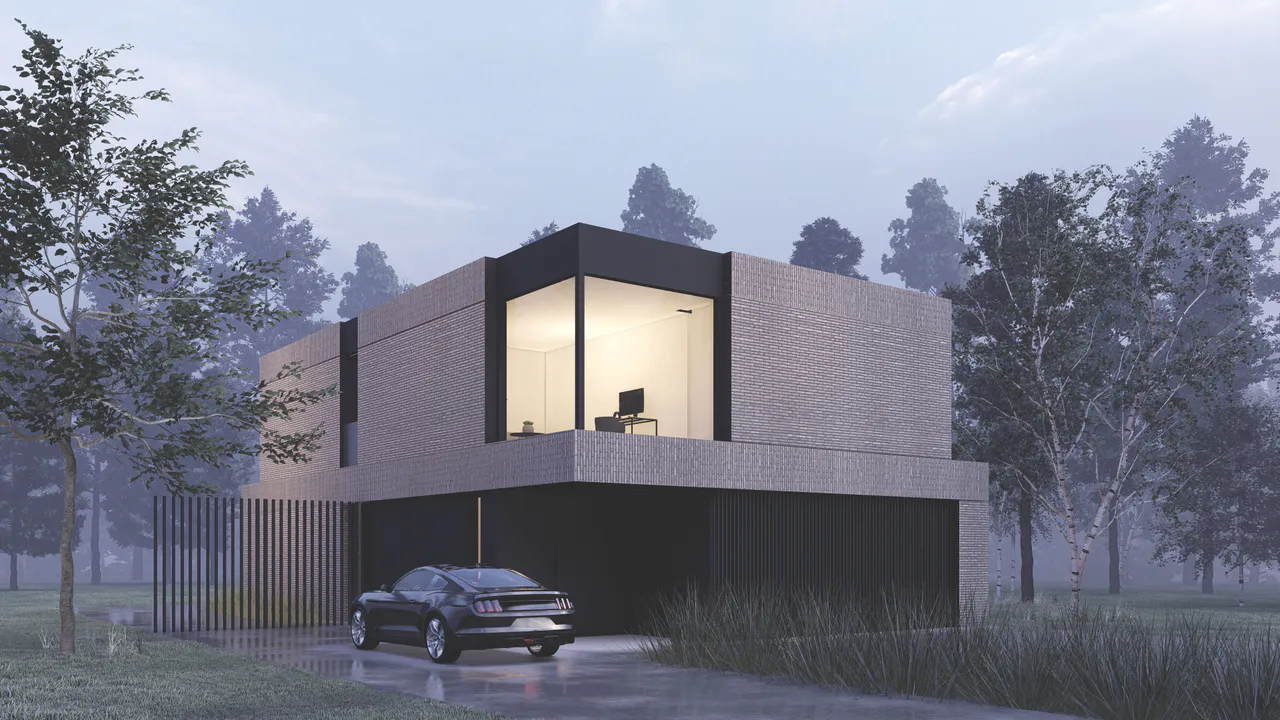 Проект дома с плоской крышей выделяется своим современным минималистичным стилем. В дизайне продумана каждая деталь, что привело к созданию современной и элегантной формы. Фасады дома отделаны клинкерной плиткой и минеральной штукатуркой.