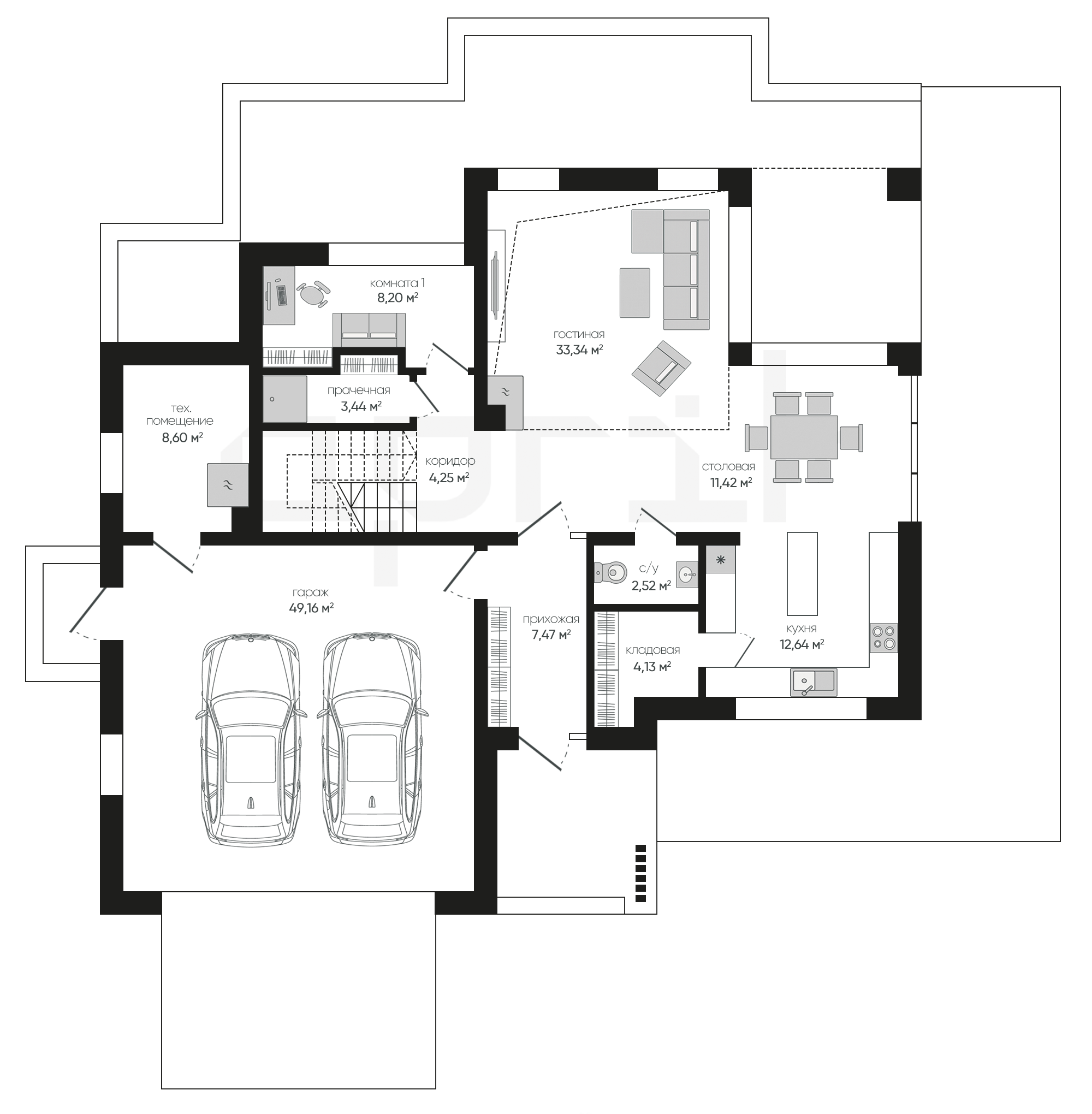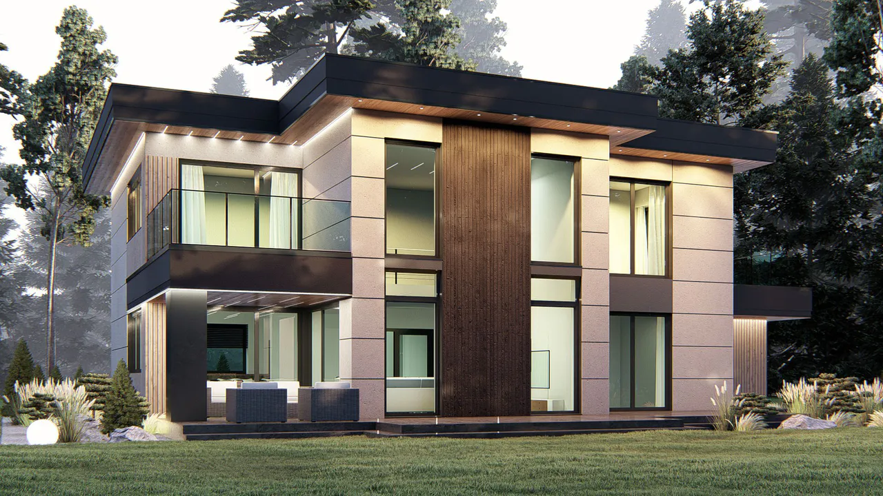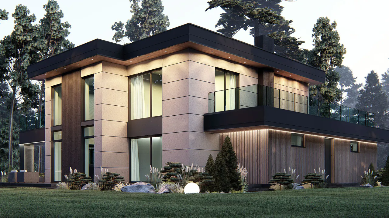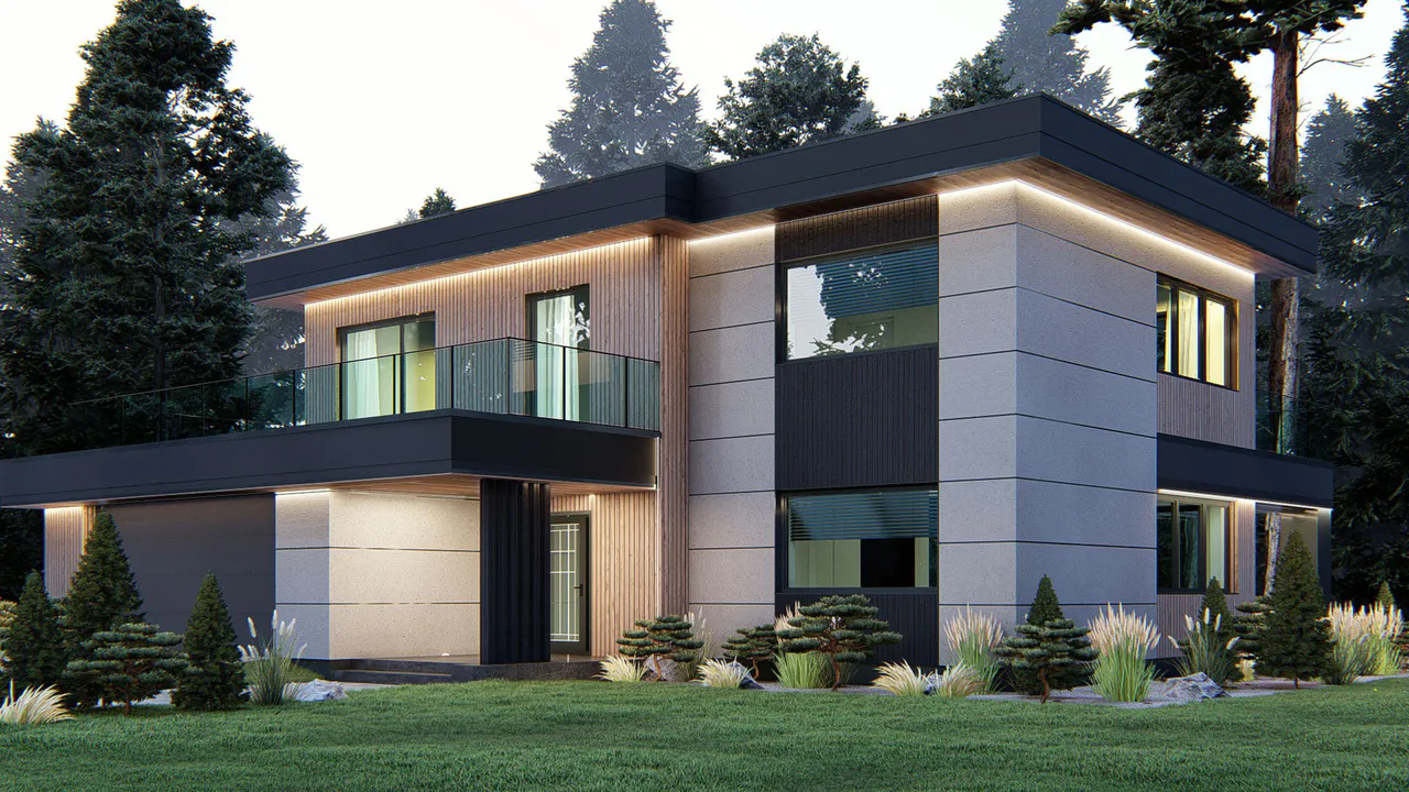 Дом обладает современным, минималистичным дизайном и отличается чистыми линиями, сочетанием материалов и функциональным пространством.
