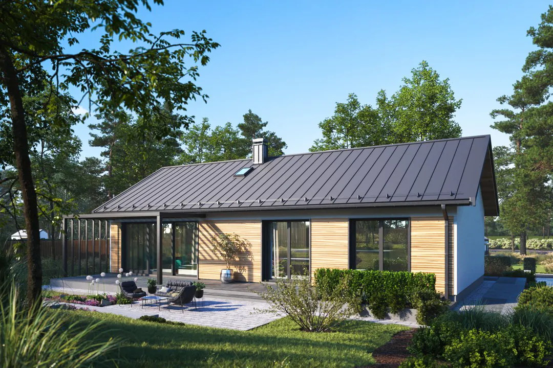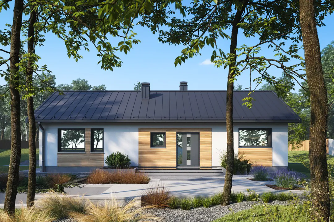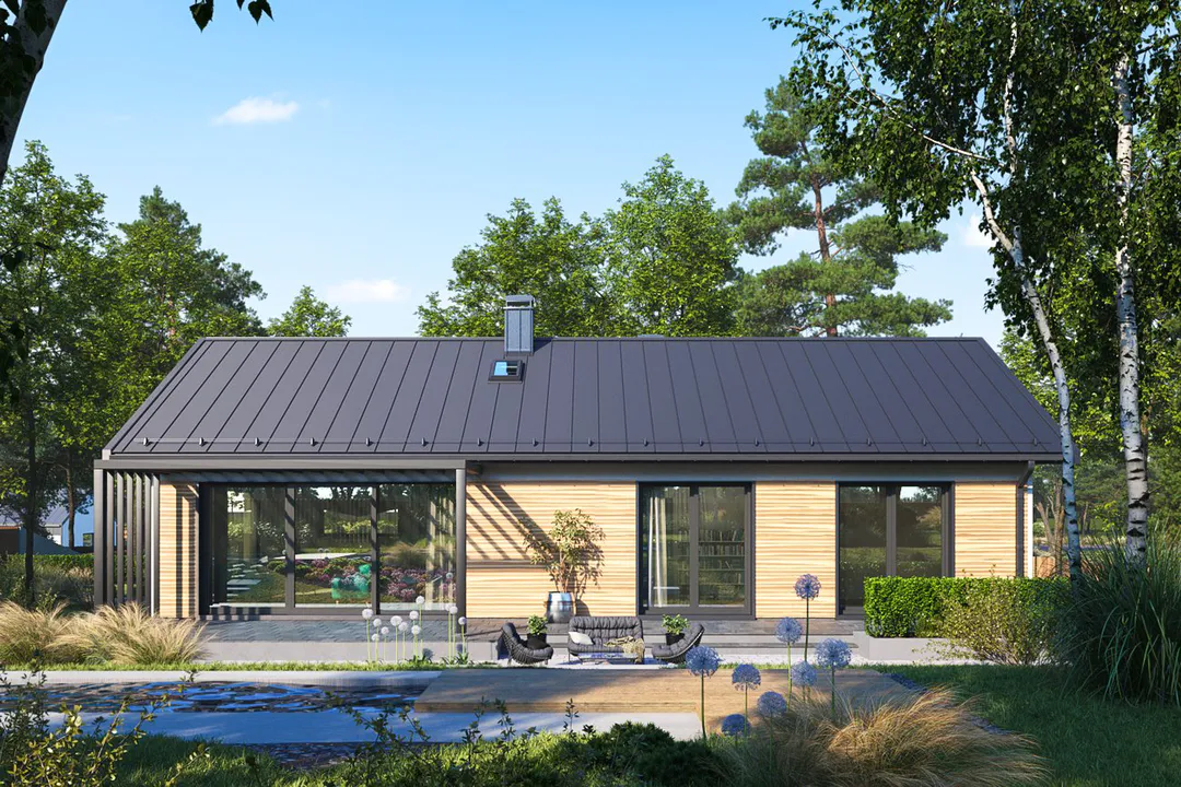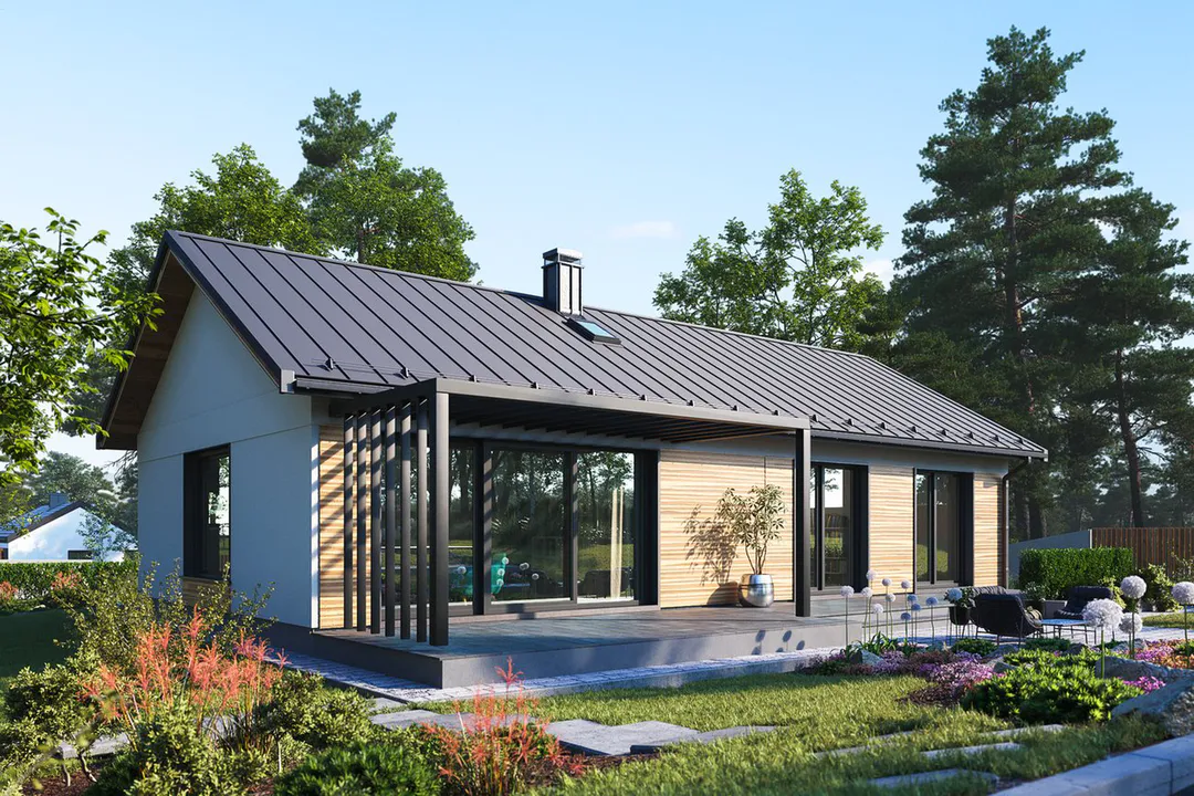 Проект одноэтажного дома с минималистичным дизайном и немного строгим в выражении фасадом. Простую форму дому подчеркивает двускатная крыша, а сад оживляет более смелое остекление и реечная конструкция.