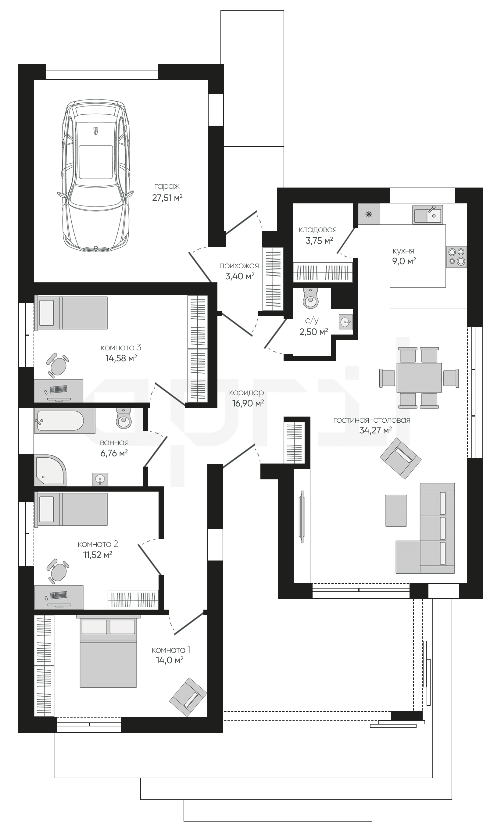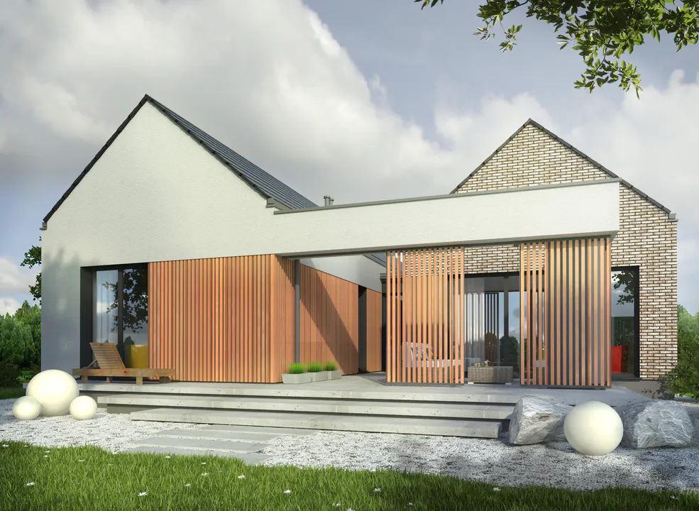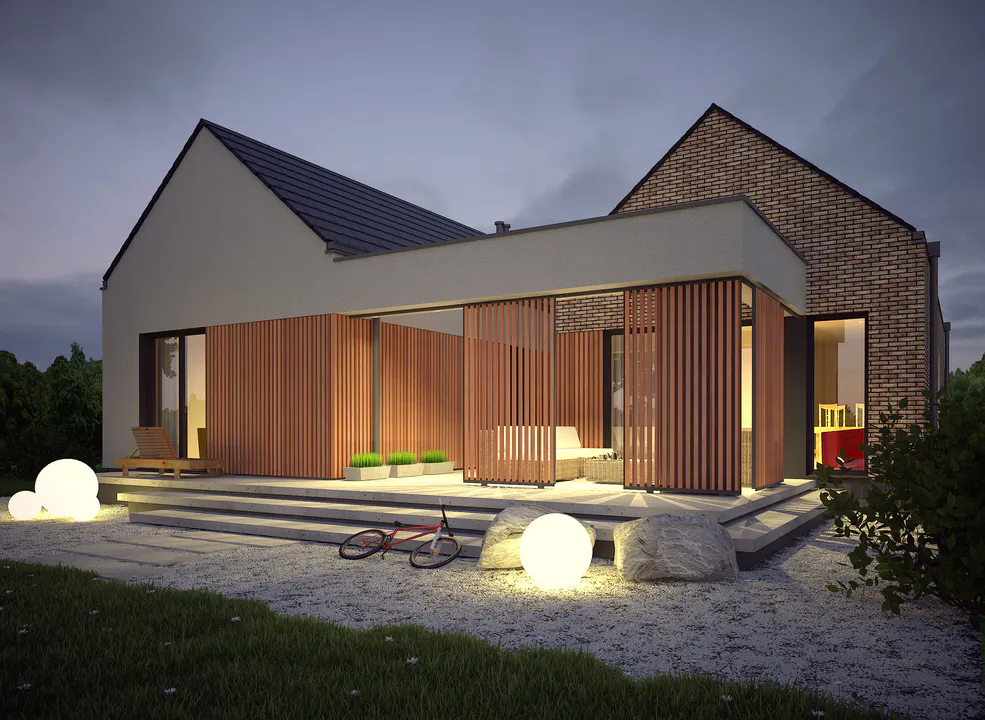 Фасад демонстрирует гармоничное сочетание материалов, фактур и цветов, что делает внешний вид дома элегантным и современным. Одна часть дома выполнена в светлых тонах в комбинировании деревянной отделкой, а другая – с имитацией кирпичной кладки, что создаёт дополнительную иллюзию.