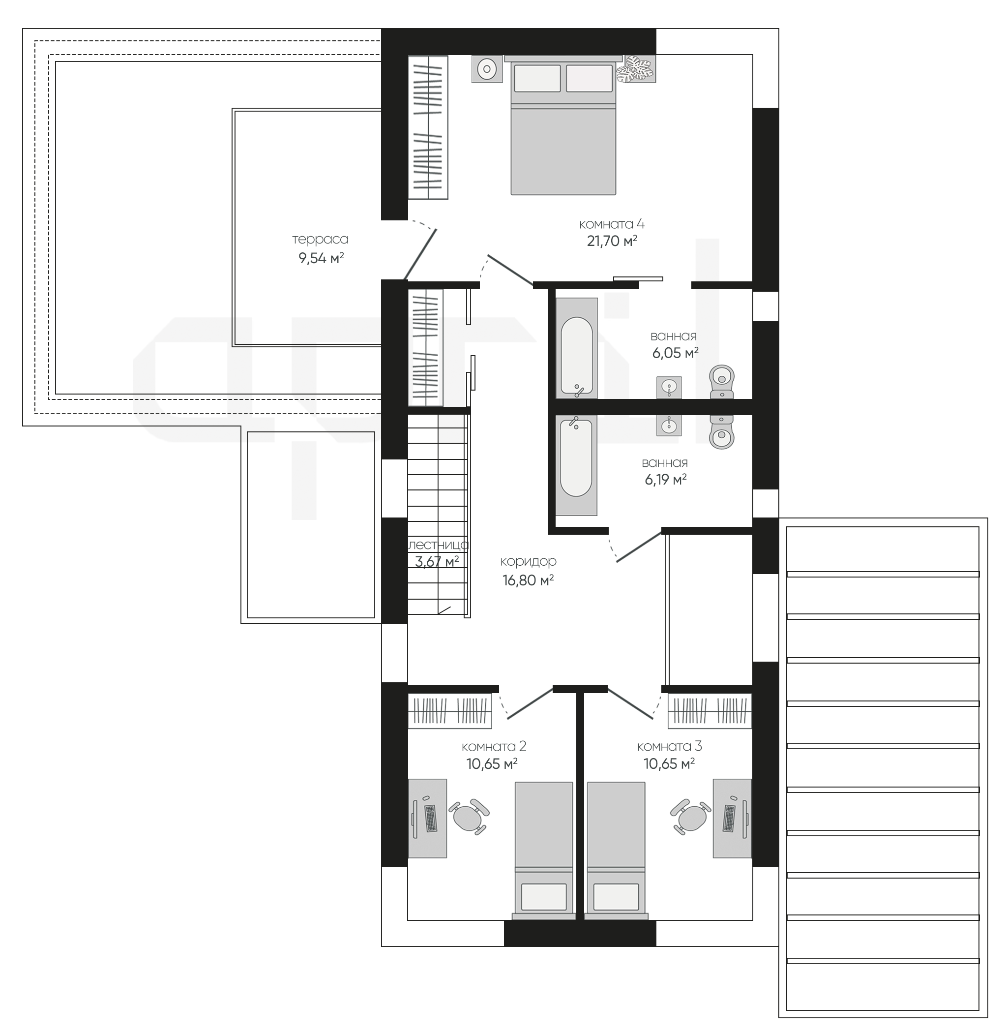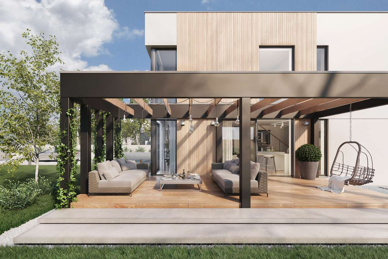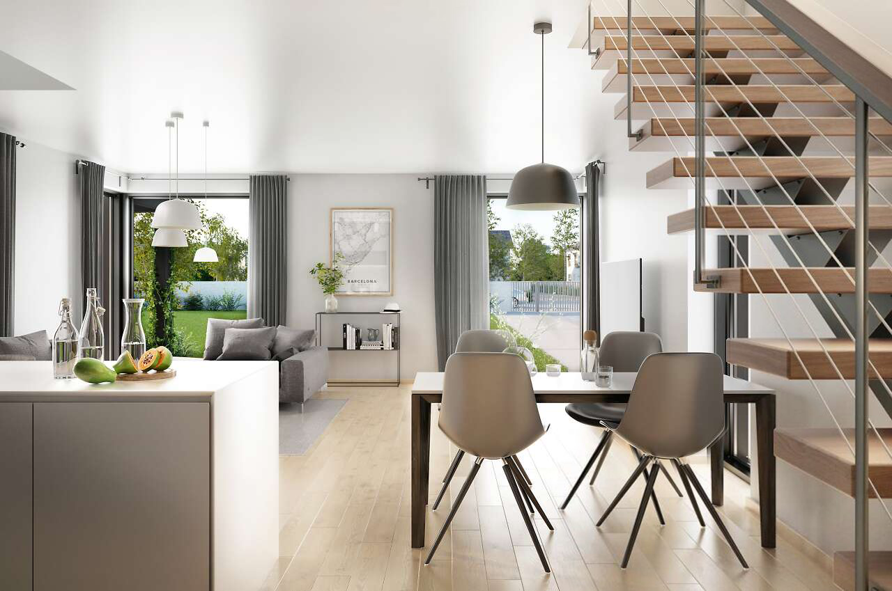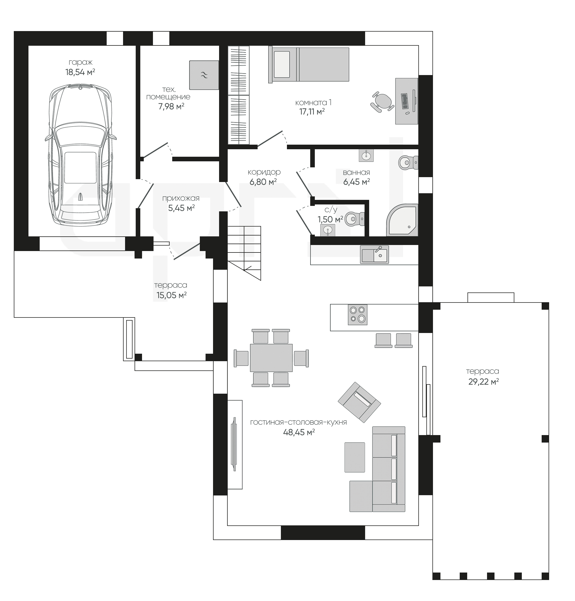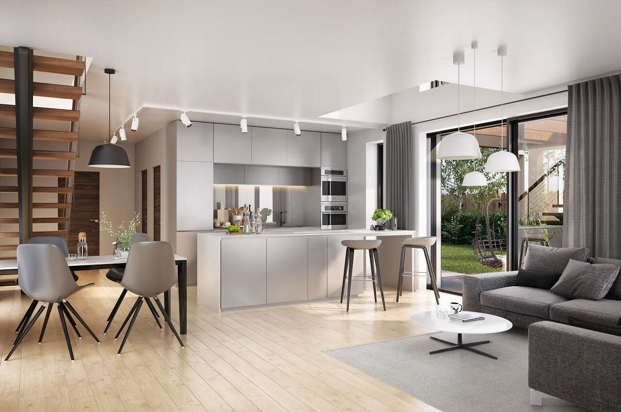 В архитектуре дома преобладают прямые линии и плоские поверхности, которые способствуют простому, но элегантному внешнему виду. Функциональная планировка предлагает комфортный дом для семьи из 4-5 человек.