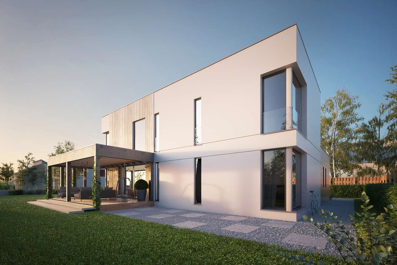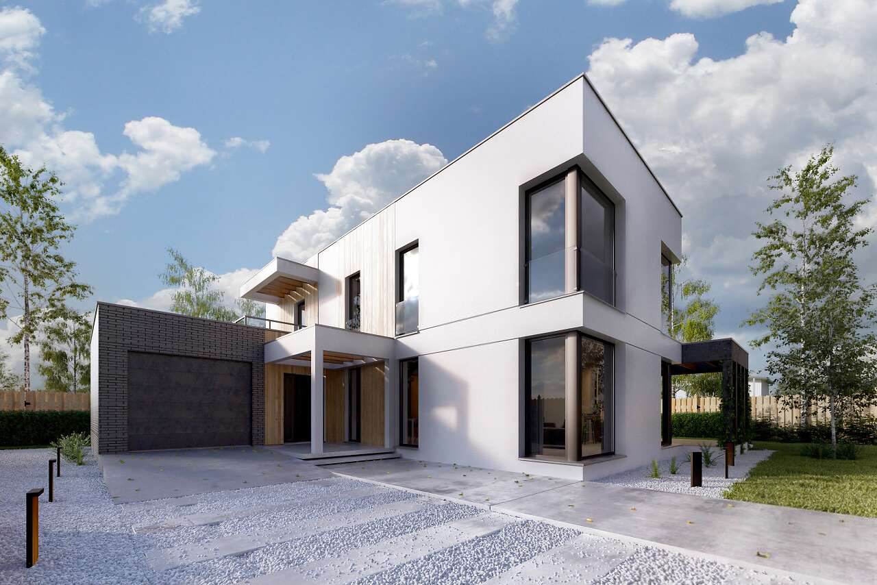 Проект представляет собой современный двухэтажный дом в стиле хайтек. Фасады дома окрашены в светлый цвет, что создает свежий и чистый вид. Входная зона и терраса украшены деревянными панелями. Гармоничность дизайна подчеркнуло большое остекление, расположенное симметрично на первом и втором этажах.