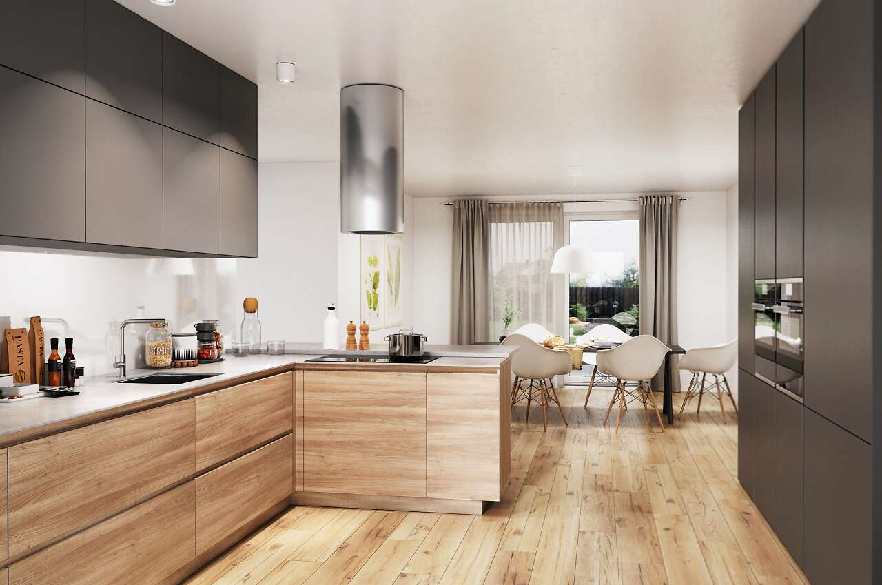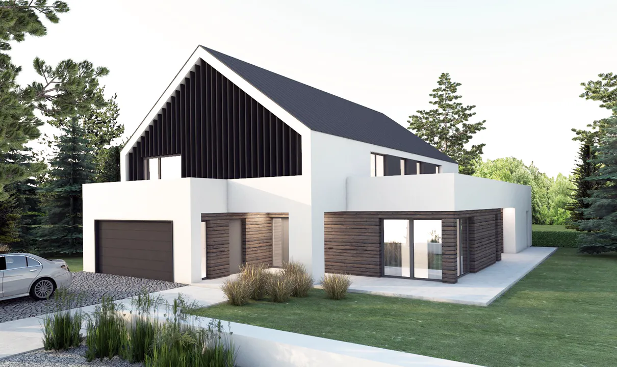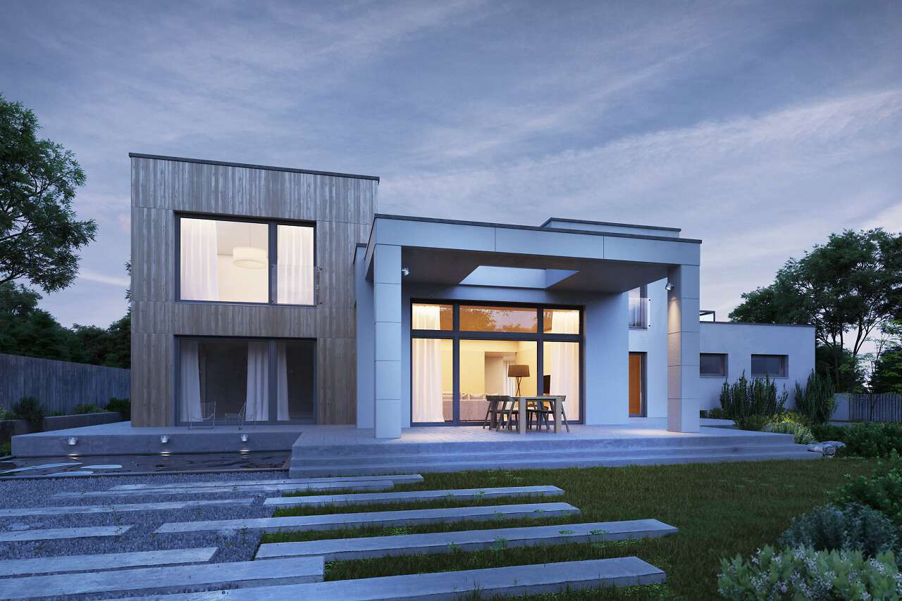Архитектура дома выполнена в минималистическом стиле с чистыми линиями и прямоугольными формами. Фасад дома комбинирует белую штукатурку и деревянные панели, что придало стильный и элегантный вид.