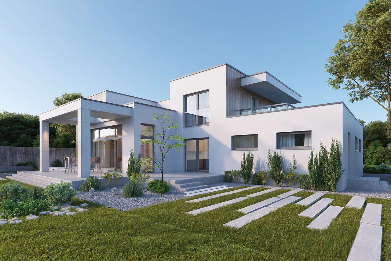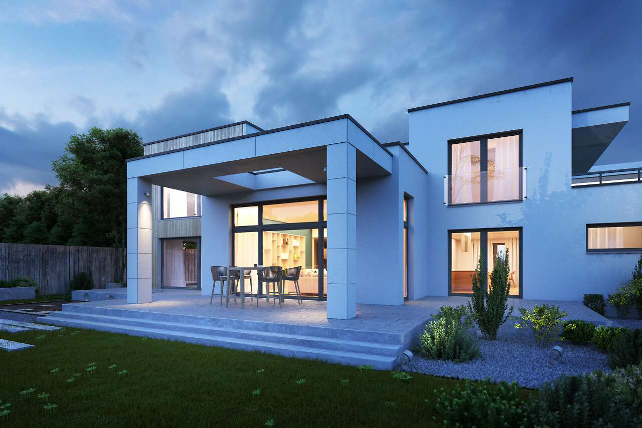Проект современного двухэтажного дома с плоской крышей, террасой, гаражом и сауной в стиле хайтек.