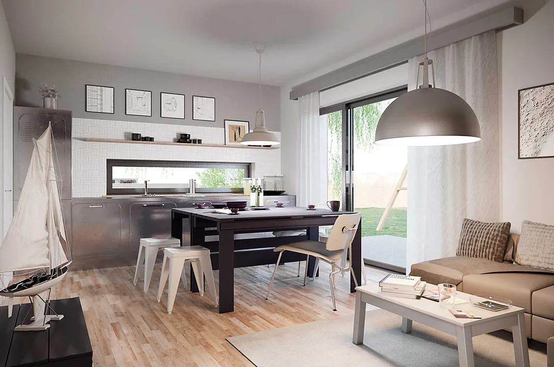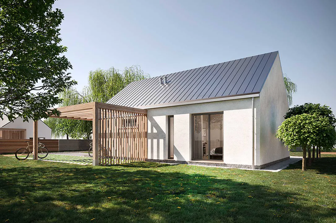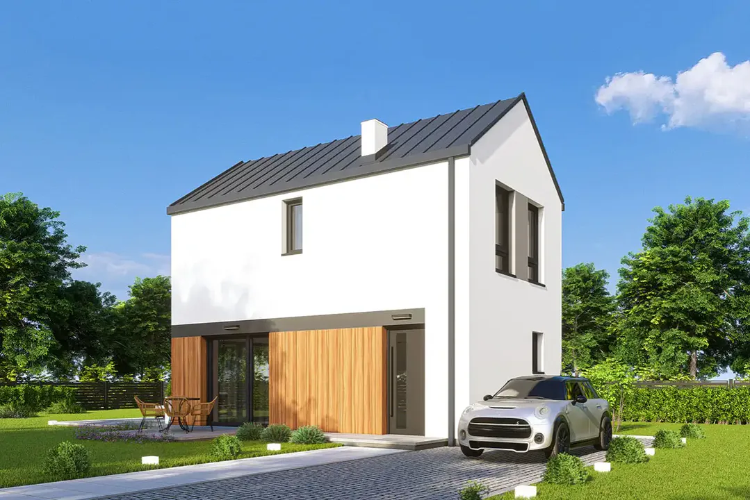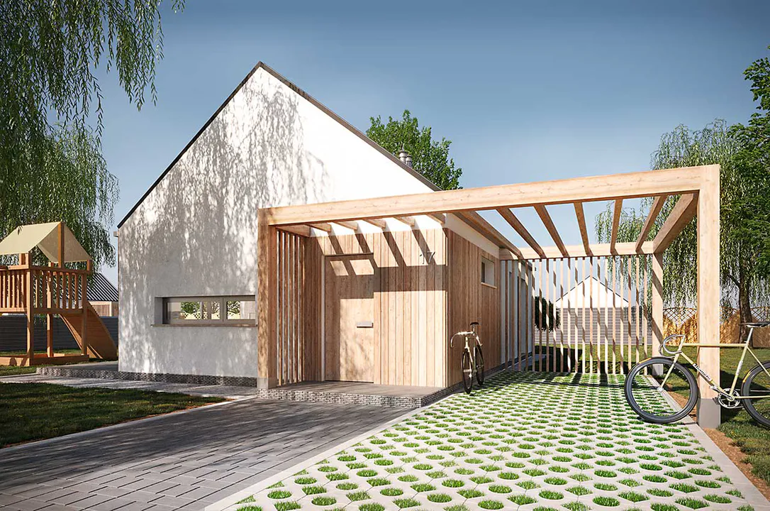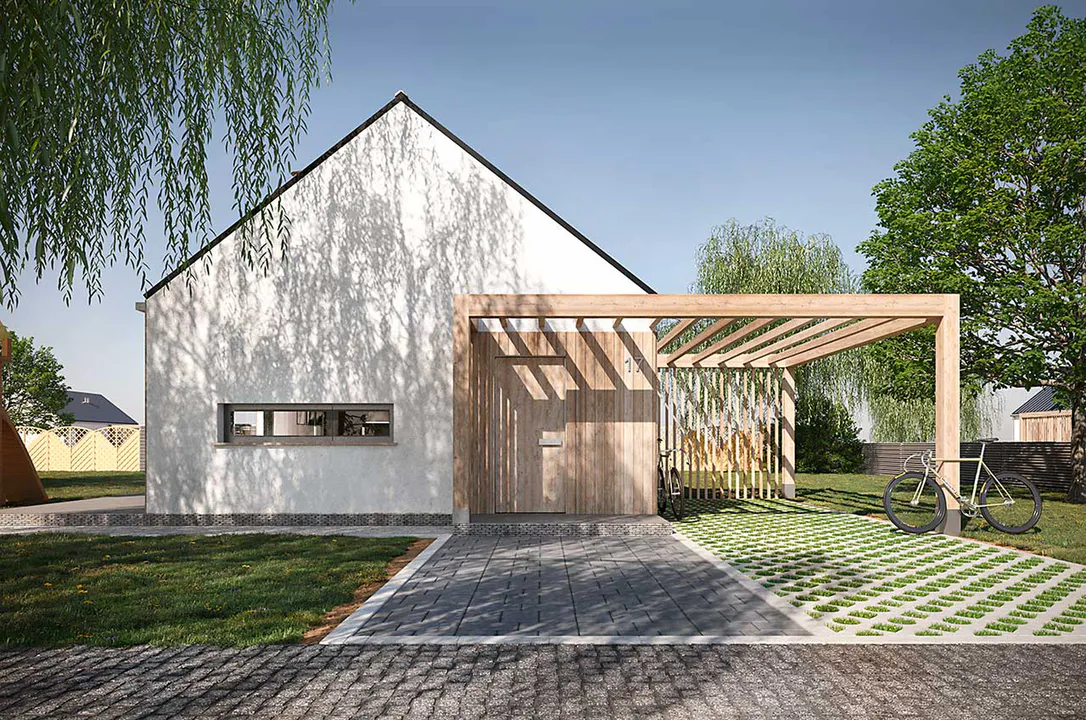 Дом простой формы с двускатной крышей. Фасад дома окрашен в белый цвет, что придает ему чистый и свежий вид. Одним из ключевых элементов дизайна является деревянный навес, который создаёт пространство для парковки. Навес состоит из простых деревянных балок, которые добавляют натуральный и уютный акцент ко всей конструкции.