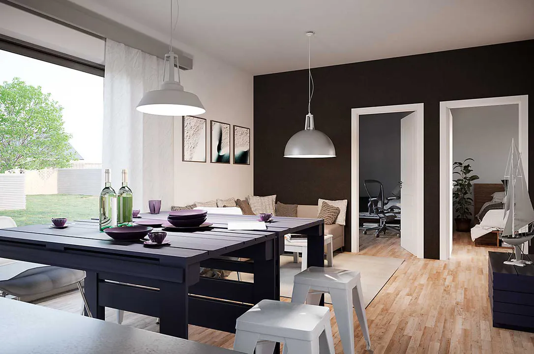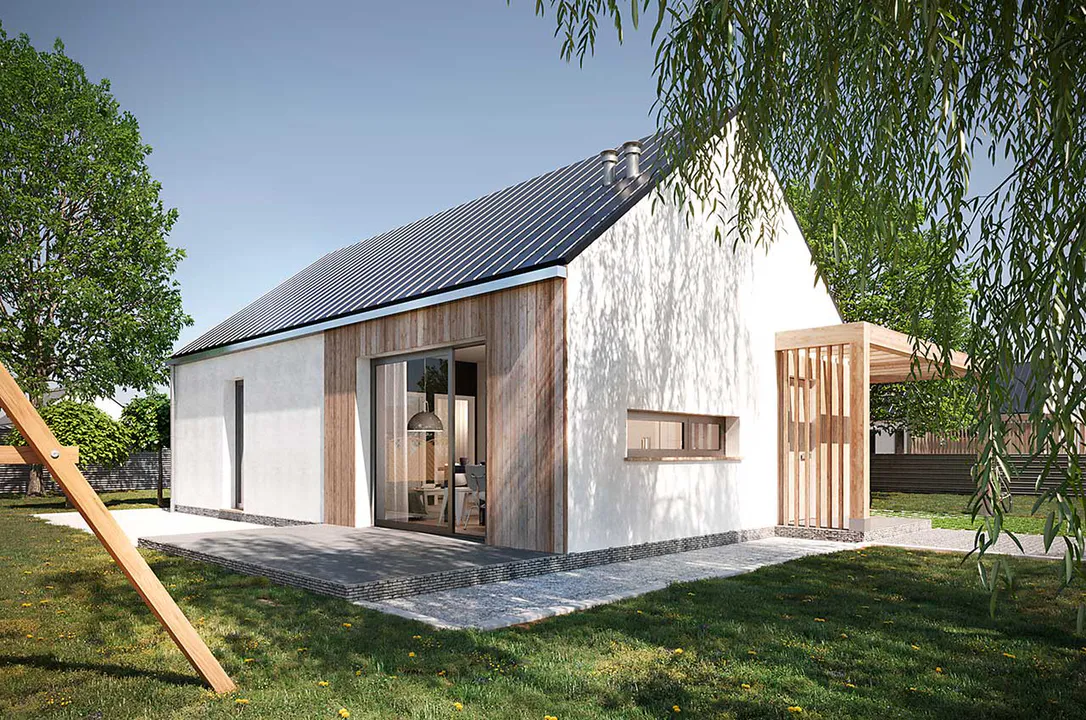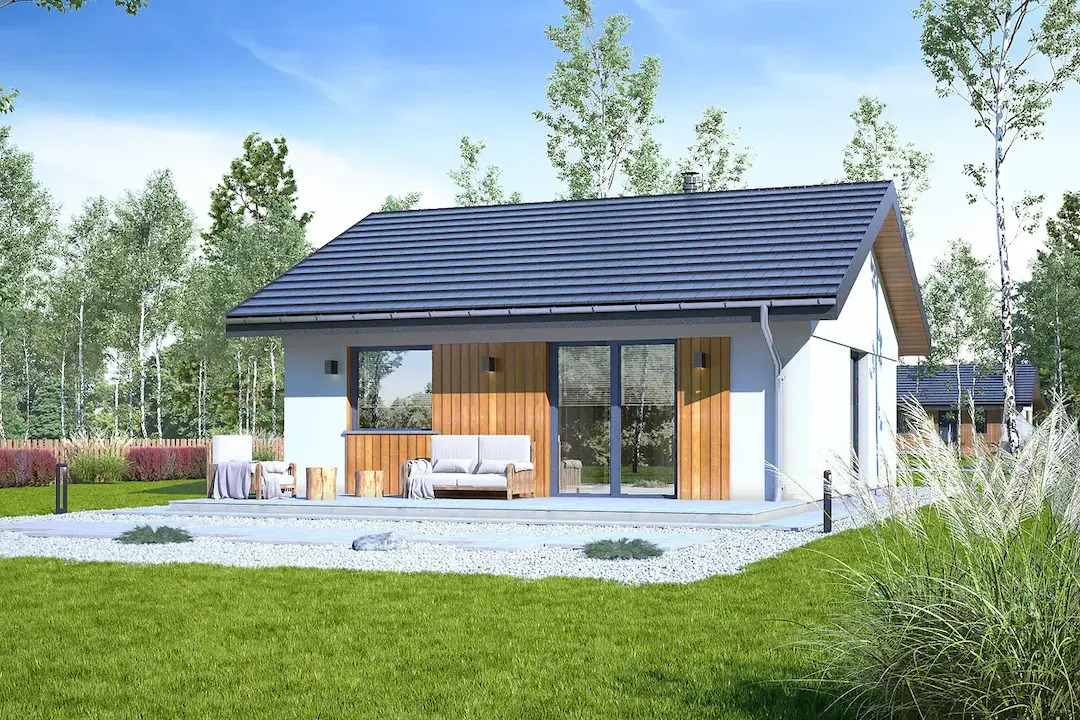 Проект представляет собой небольшой одноэтажный дом с деревянным декоративным навесом.