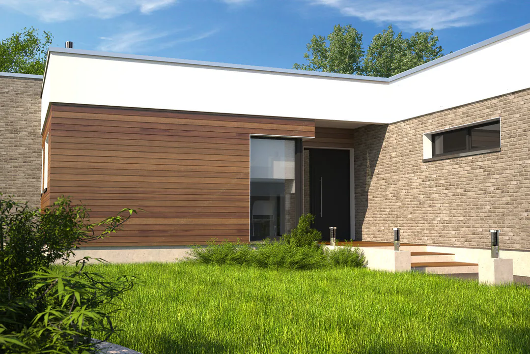 Фасад выполнен в комбинированном стиле: часть стены облицована серым кирпичом, а другая часть отделана деревянными панелями, создающими элегантный и современный вид.