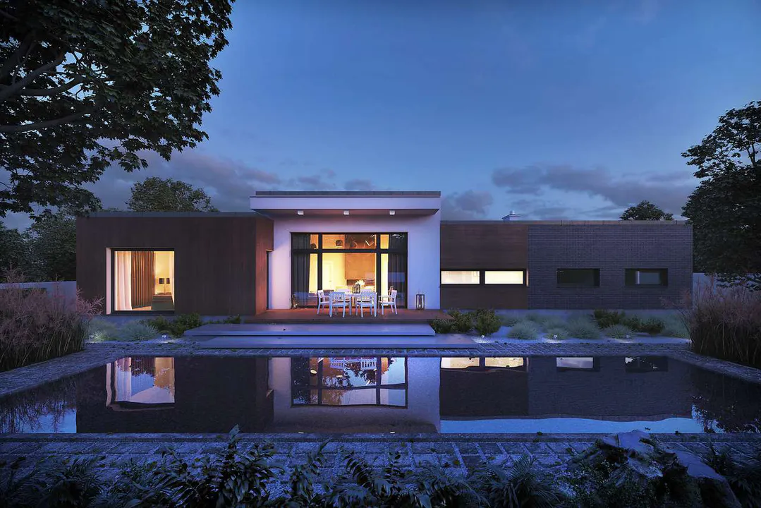Проект одноэтажного дома, выполненный в современном стиле, с плоской крышей и большим остеклением.