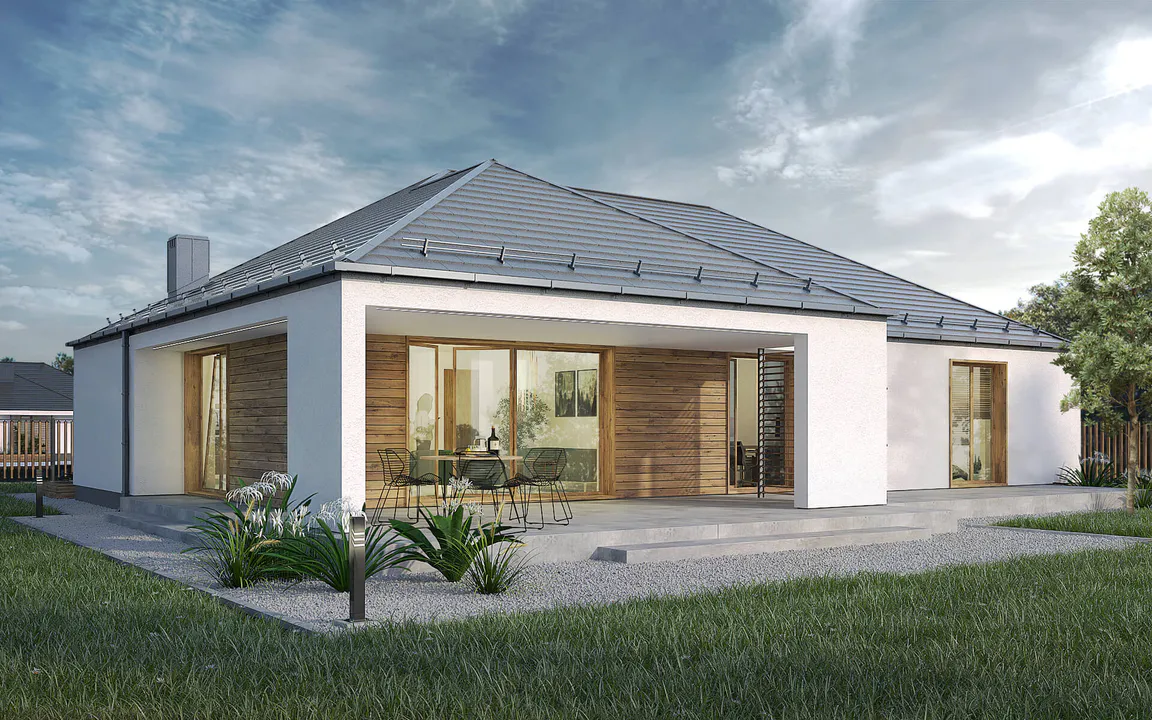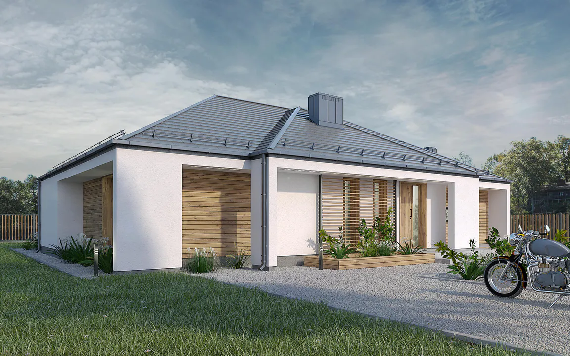 Светлый фасад с элементами деревянной отделки придает дизайну дома уют и естественность. Кровля серого цвета из керамической черепицы добавляет контраст и сдержанность. Деревянные рейки, установленные перед окнами, выполняют не только декоративную функцию, но и добавляют приватности внутреннему пространству.
