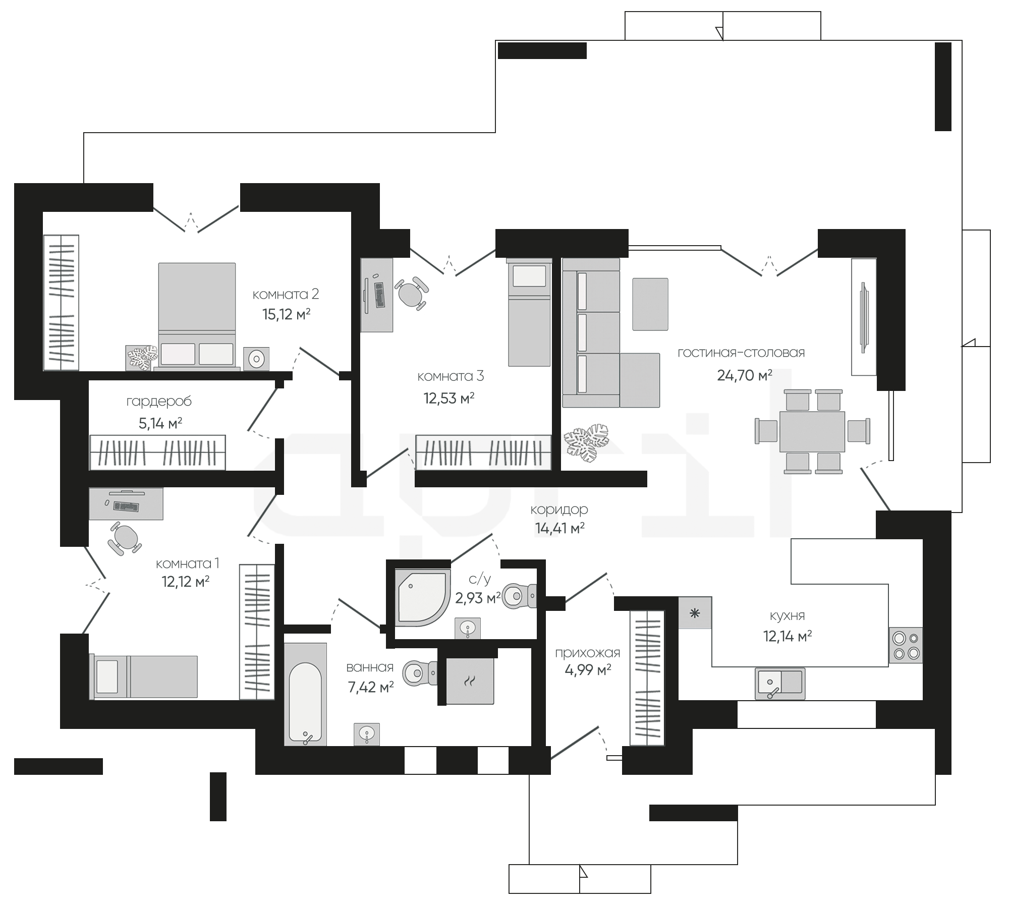 Проект небольшого одноэтажного дома имеет четкую планировку с разделением на зоны. Размеры помещений позволяют комфортно использовать пространство для различных семейных потребностей.