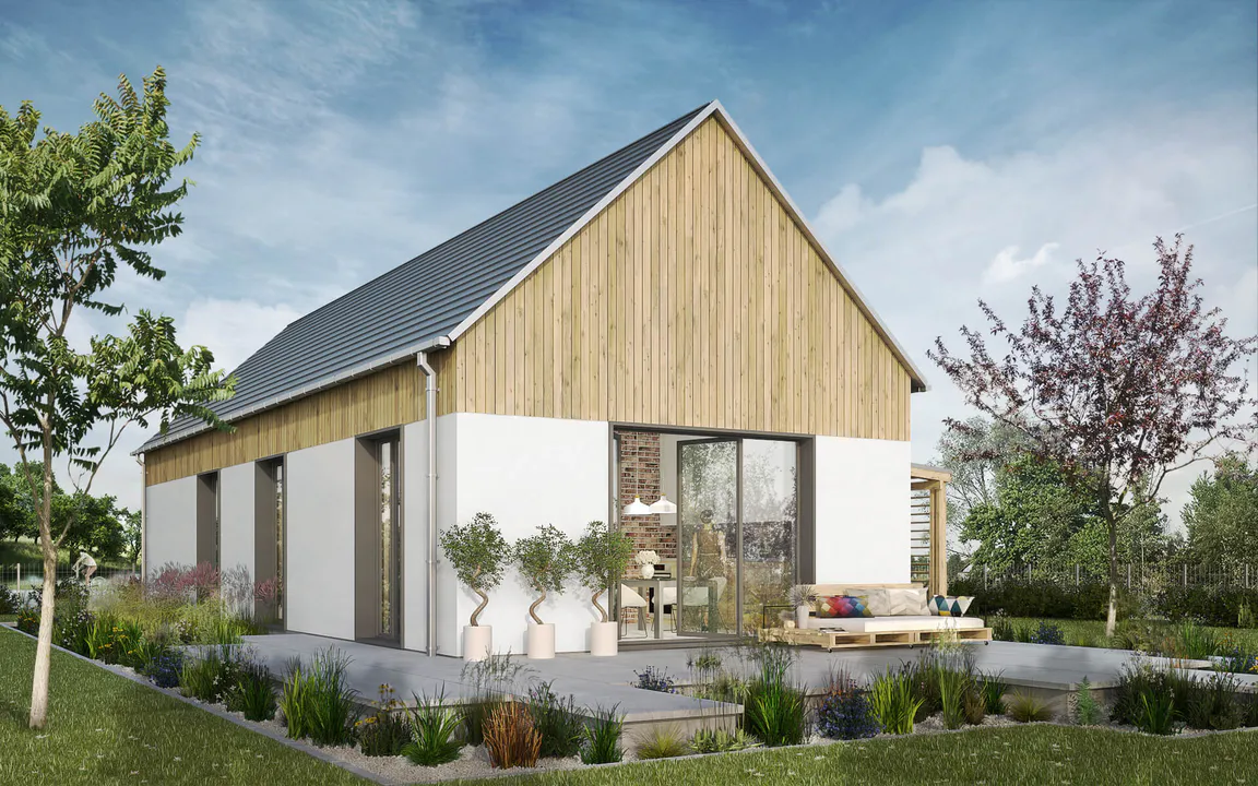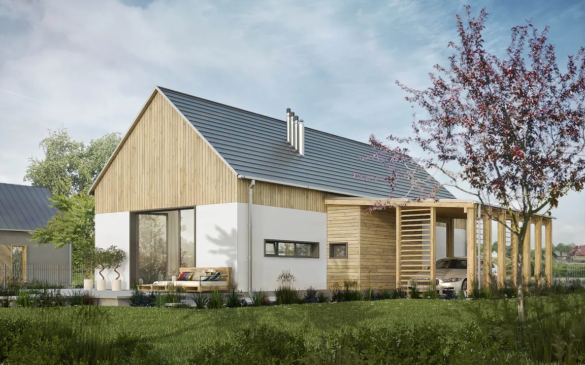 Верхняя половина фасада обшита деревянными панелями теплого оттенка, нижняя часть оштукатурена в белый цвет, что придает дому элегантный и современный вид. Крыша дома двускатная темного оттенка, создающая контраст с белыми стенами.