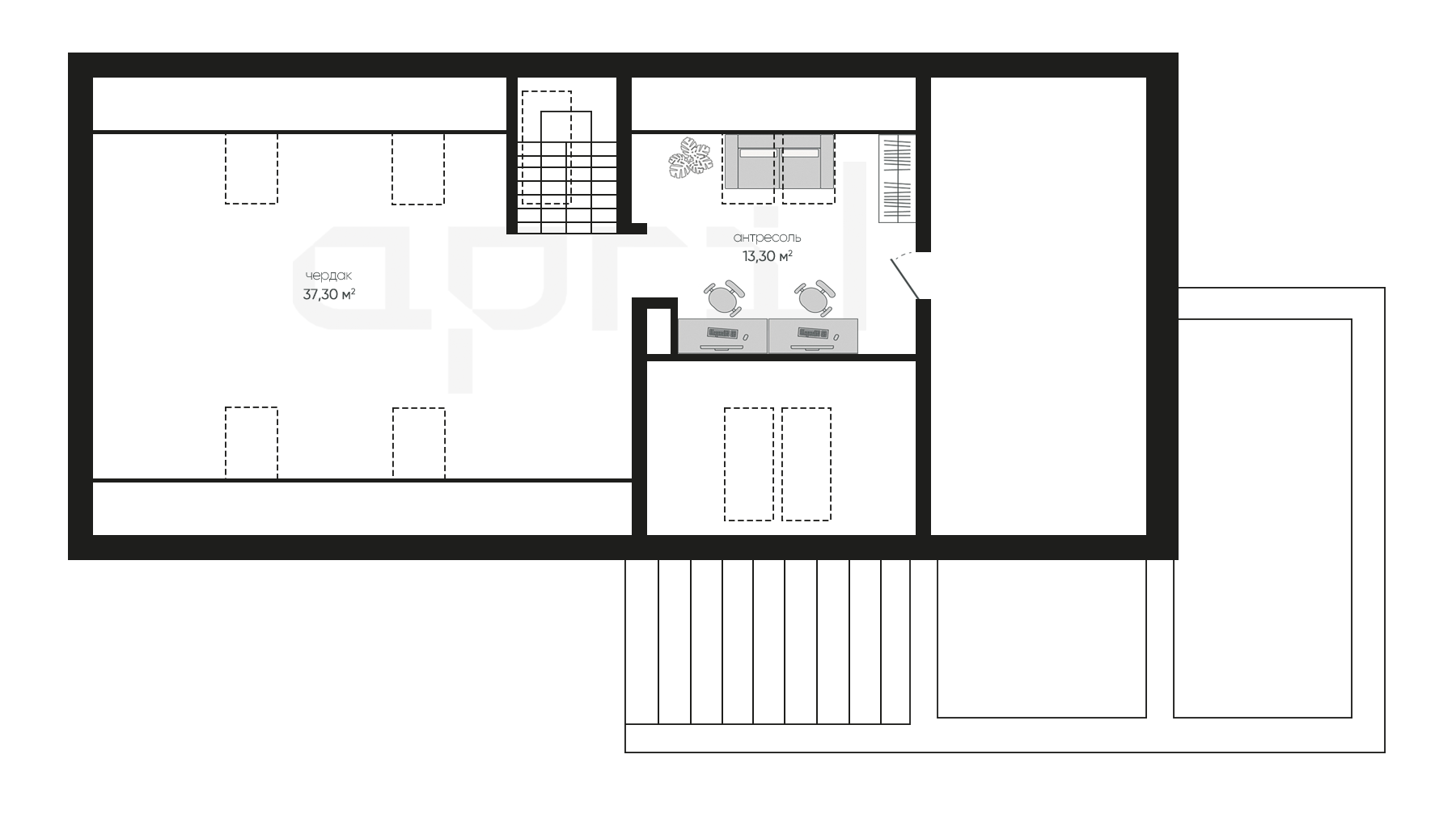 Экстерьер решен в белых и светло-серых тонах, а завершает дизайн двухскатная крыша из плоской черепицы темно-серого оттенка.