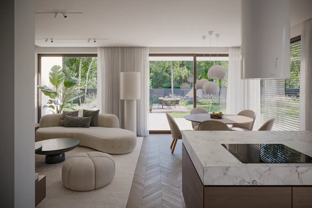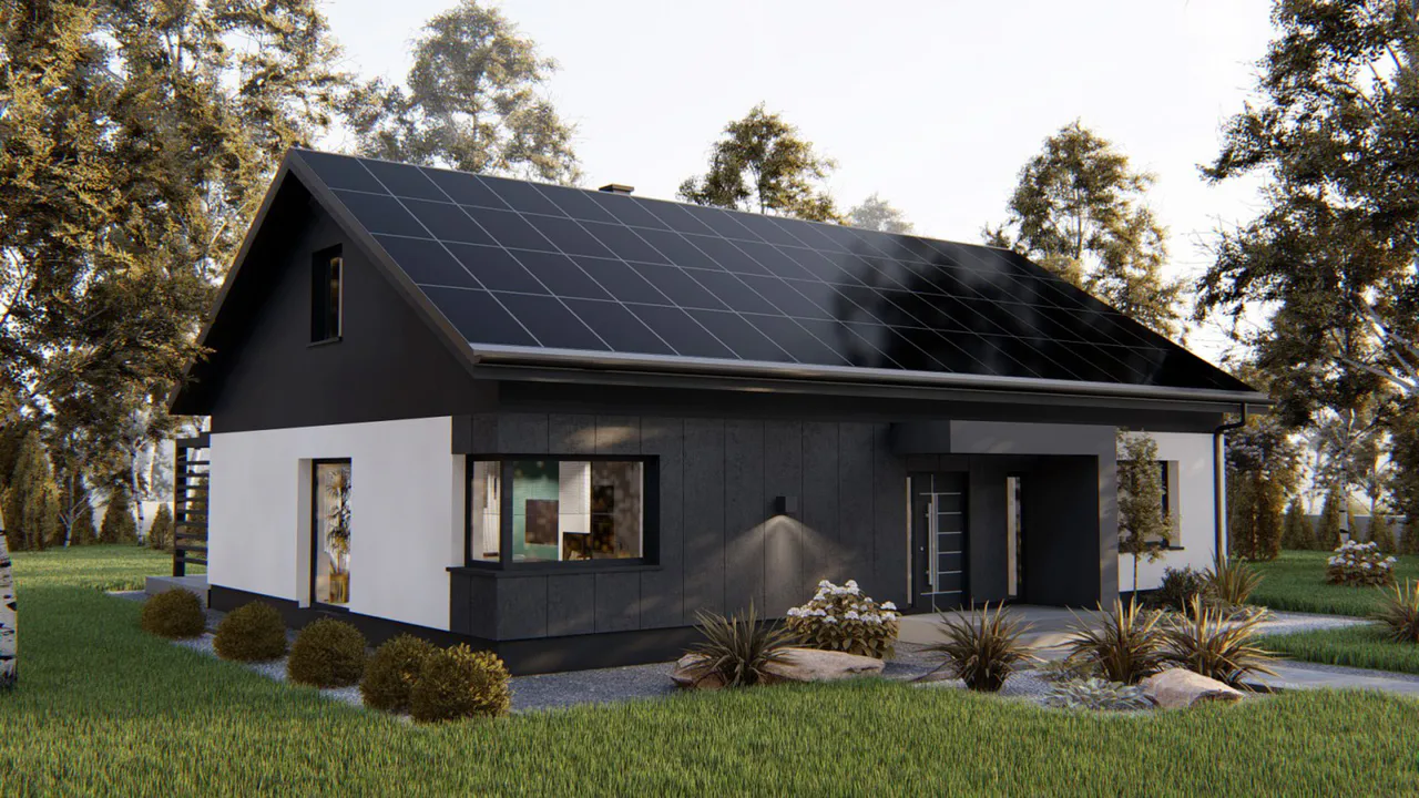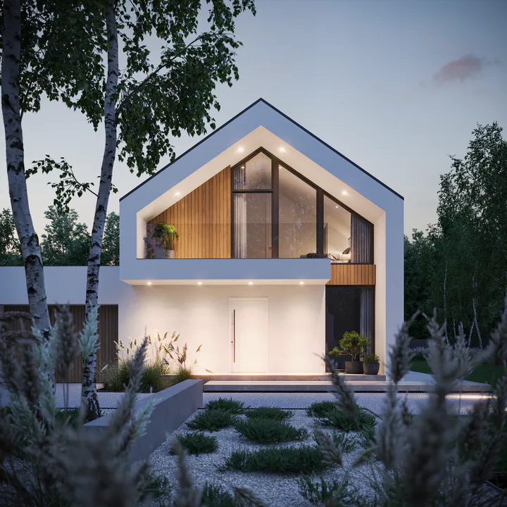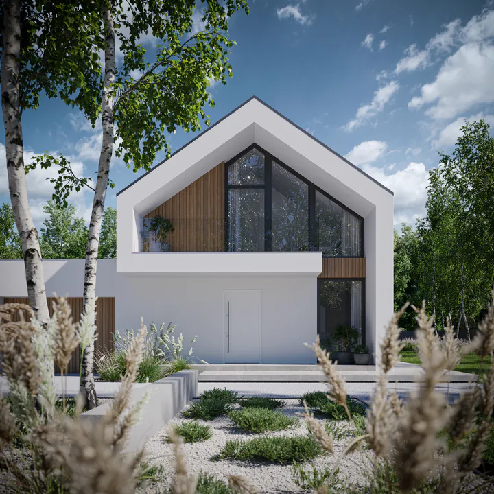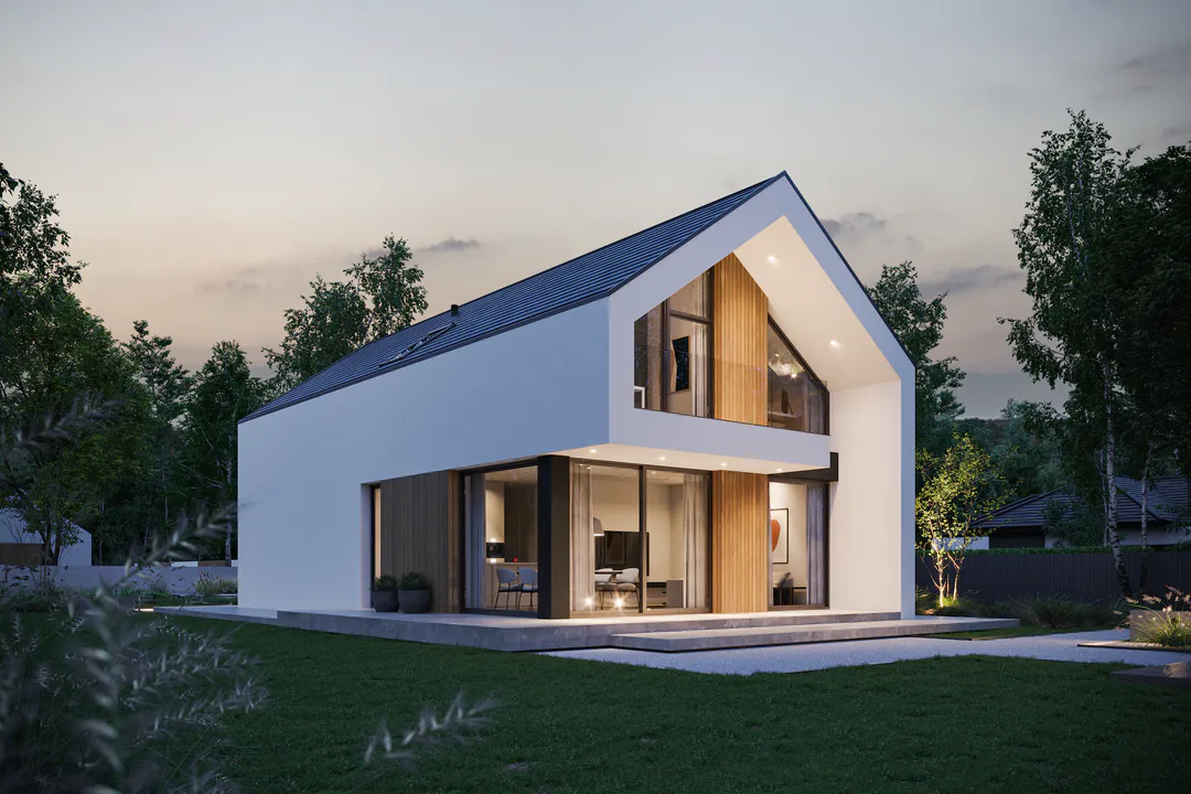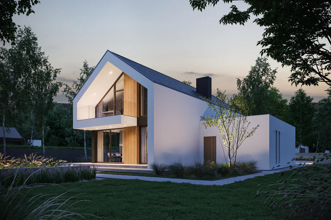 Простую форму дома украшает столь же простой фасад, оформленный с использованием белой штукатурки и натурального дерева. Задняя часть дома дополнена большим остеклением, которое позволит домочадцам наслаждаться видом ближайших окрестностей.