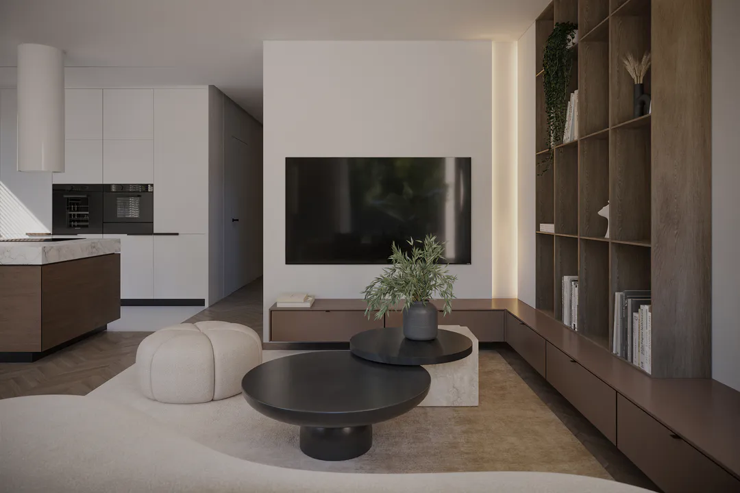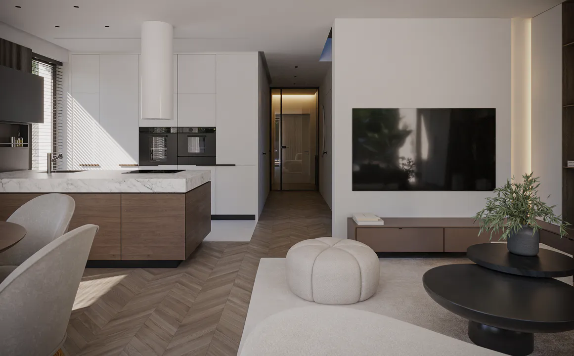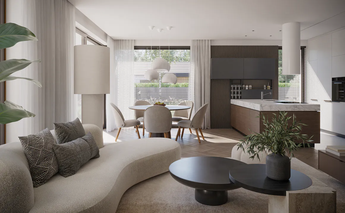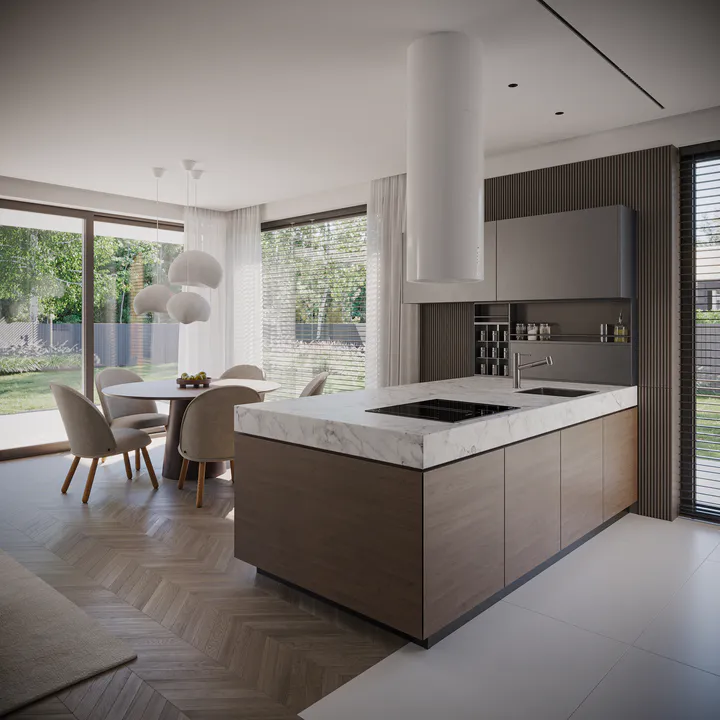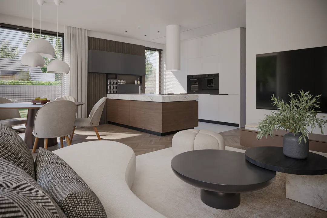 Простую форму дома украшает столь же простой фасад, оформленный с использованием белой штукатурки и натурального дерева. Задняя часть дома дополнена большим остеклением, которое позволит домочадцам наслаждаться видом ближайших окрестностей.