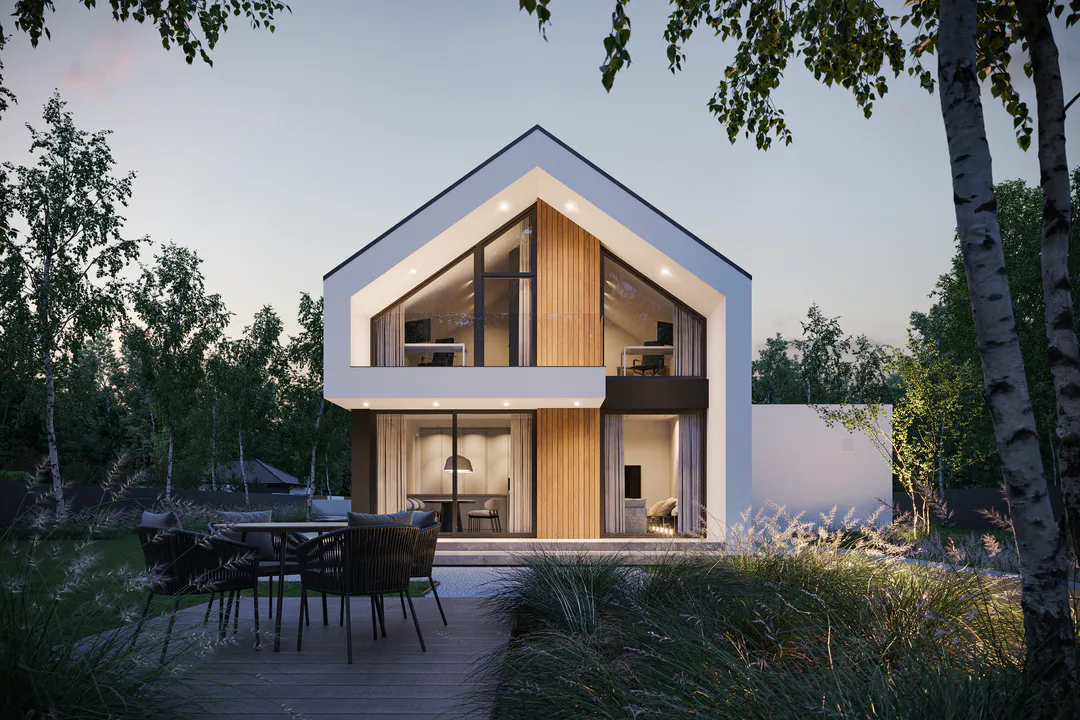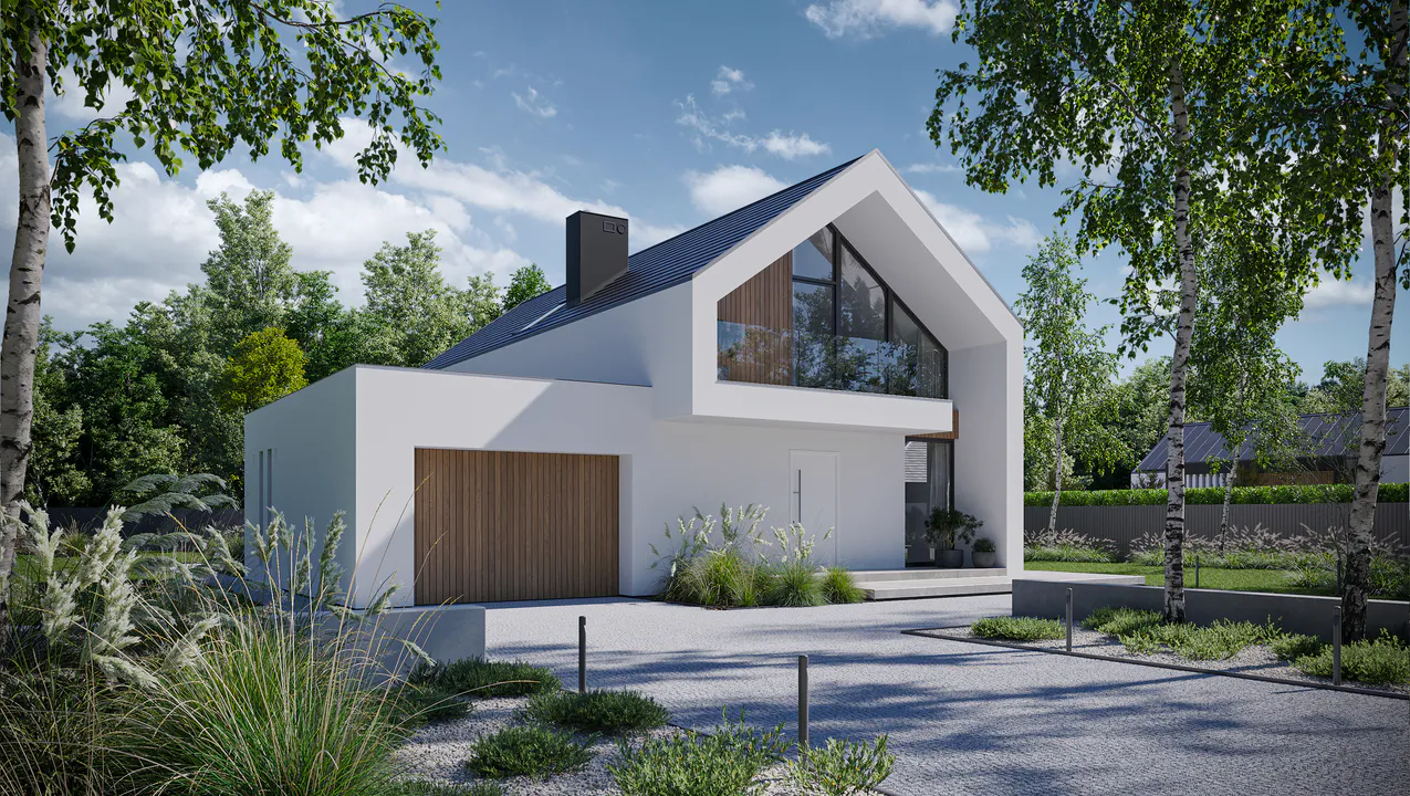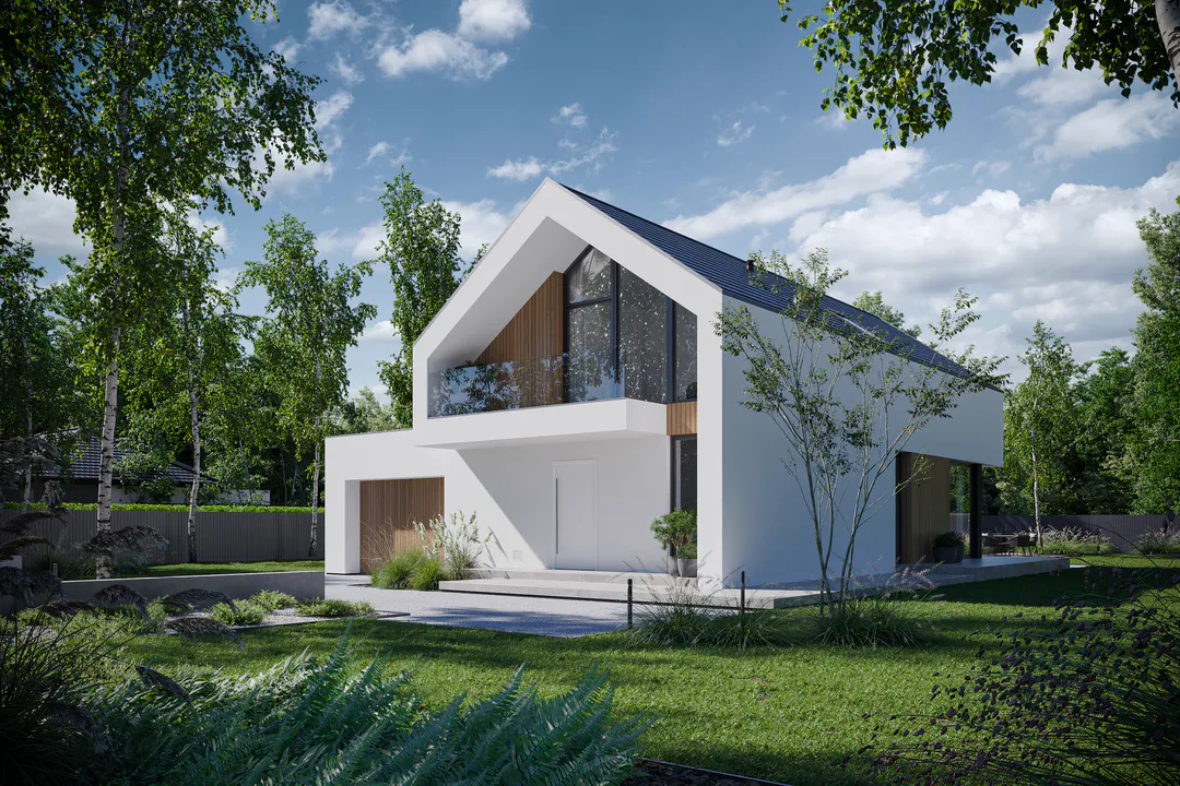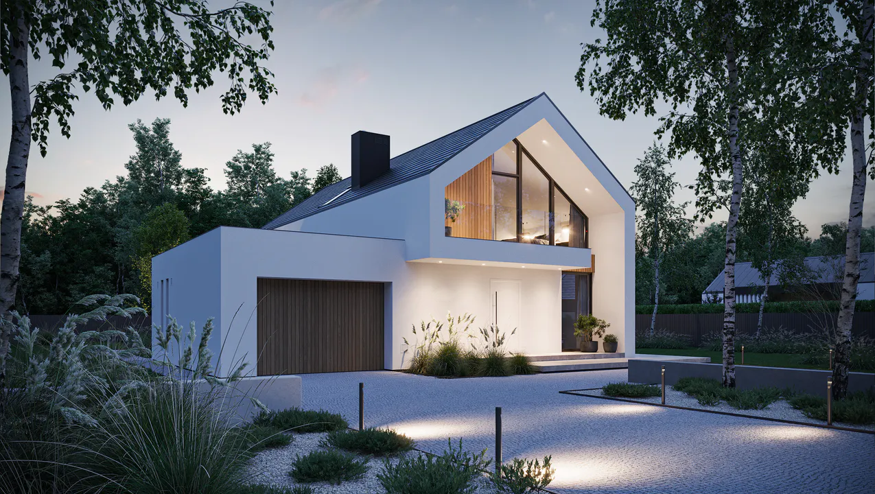 Проект современного двухэтажного дома в Скандинавском стиле с гаражом и террасой.