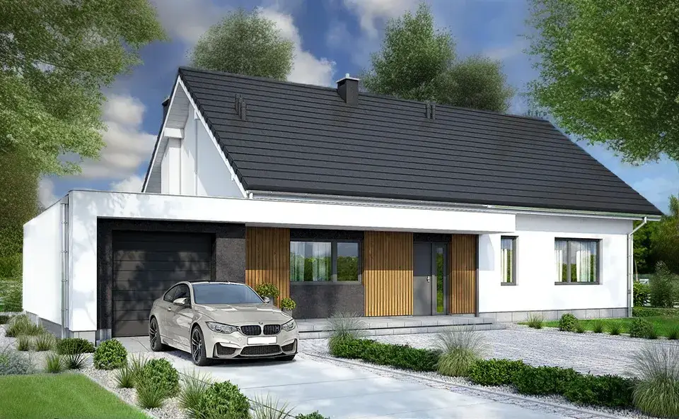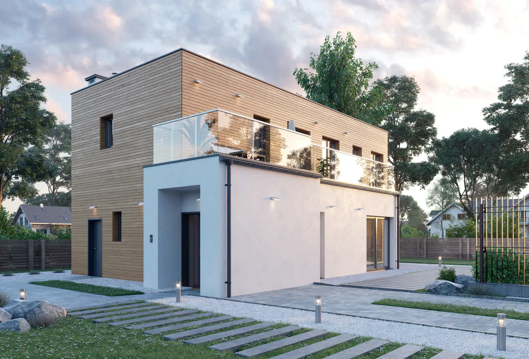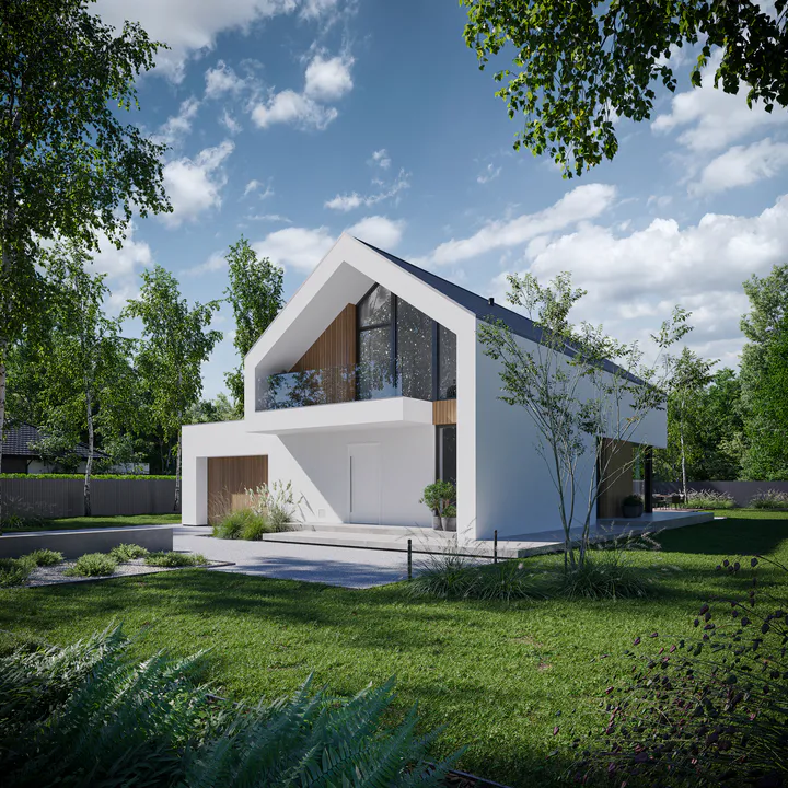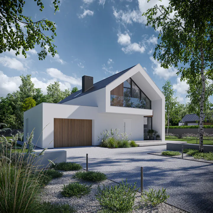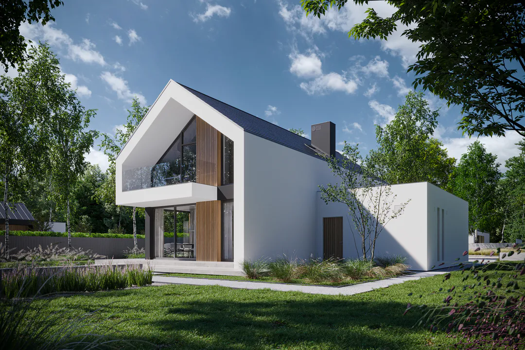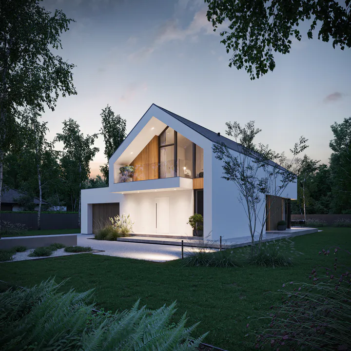 Проект современного двухэтажного дома в Скандинавском стиле с гаражом и террасой.