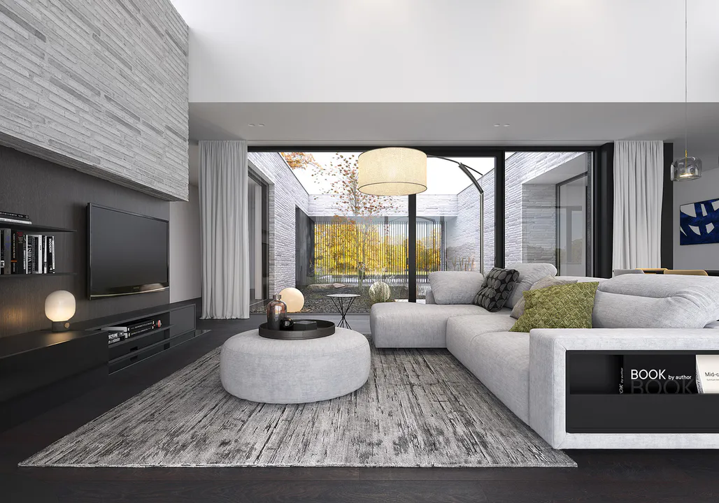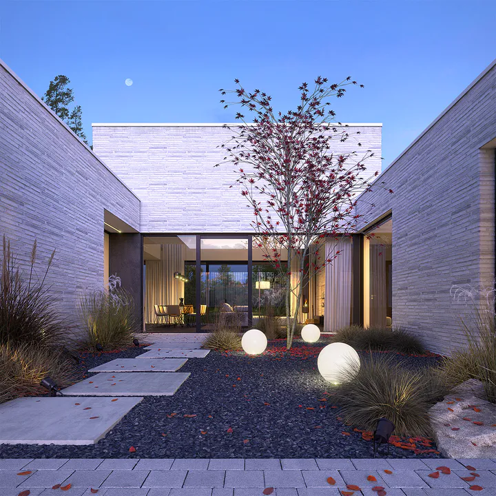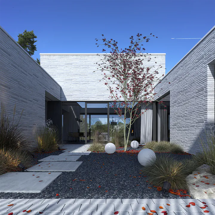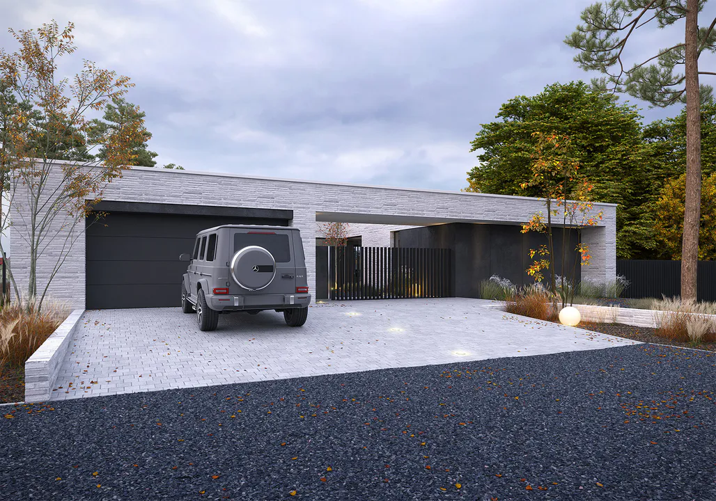 Кубовидную форму дома создают три крыла, окружающие внутренний двор. Современный характер дома подчеркивают современные отделочные материалы – длинная серая клинкерная плитка ручной формовки и темные фиброцементные плиты.
