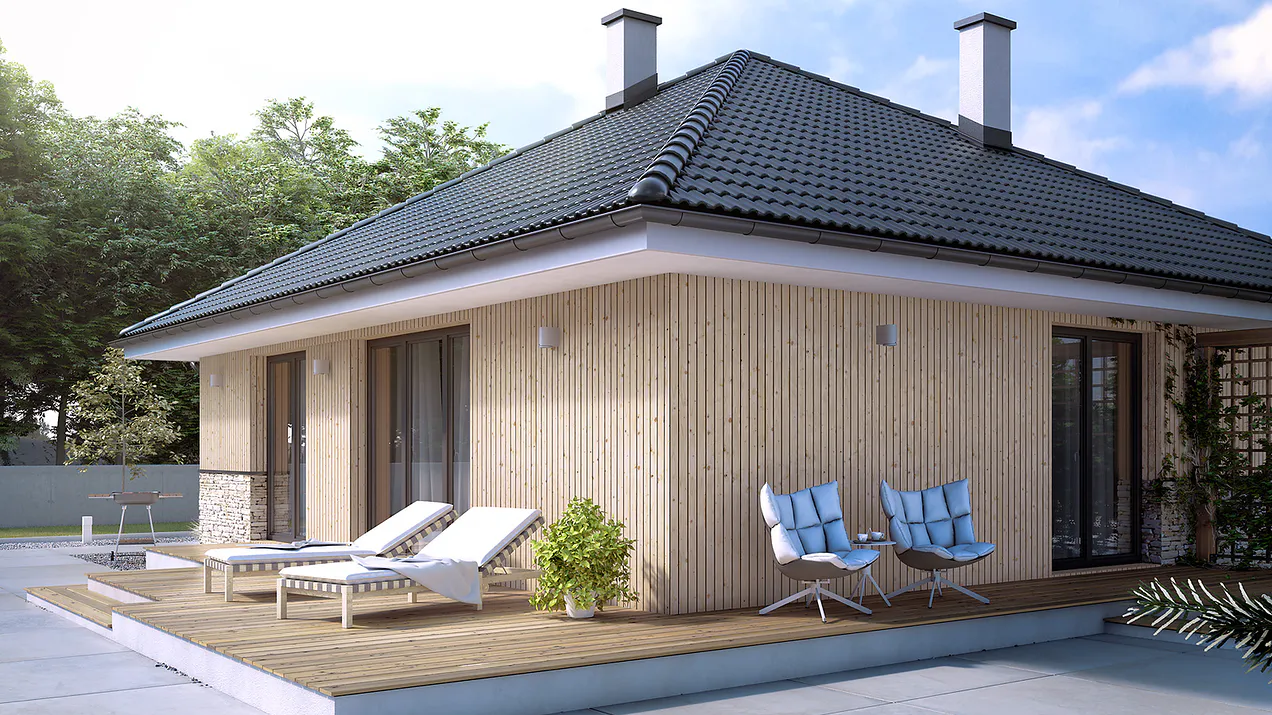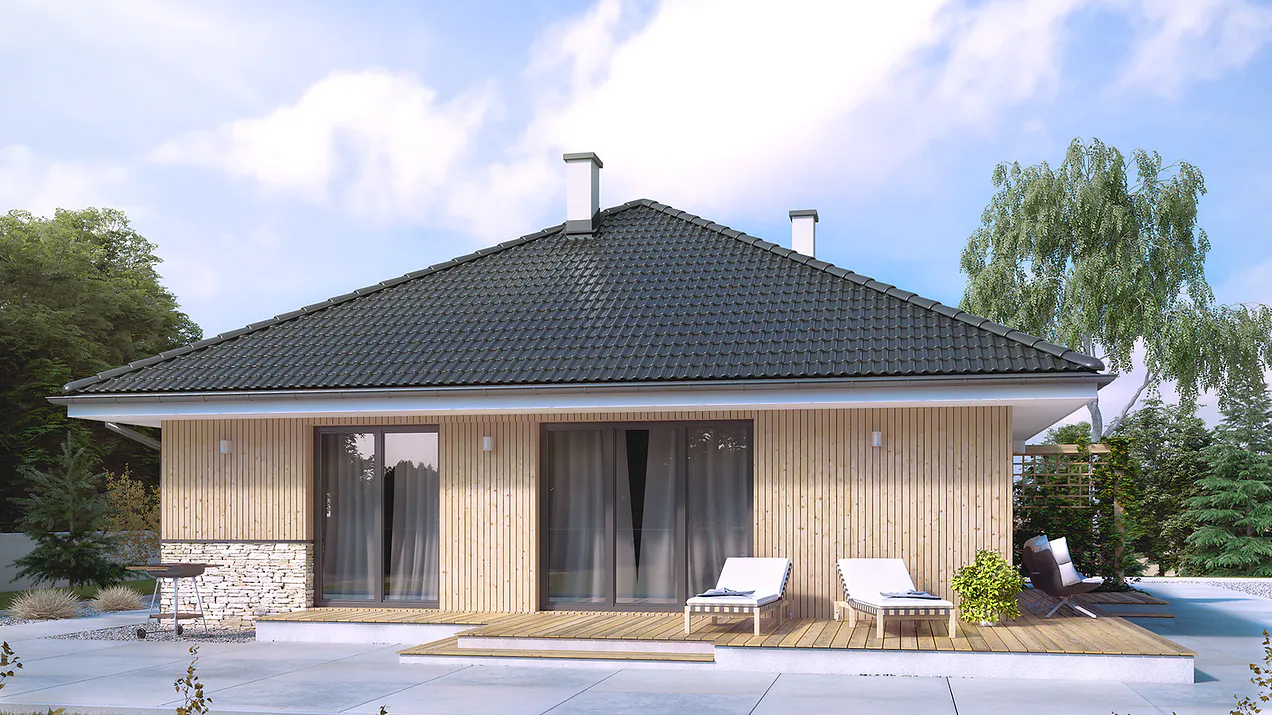 Крыша дома четырехскатная, покрытая керамической черепицей черного цвета. Фасады отделаны светлыми деревяными панелями и декоративным камнем, что создает ощущение уюта и современности общему виду дома.
