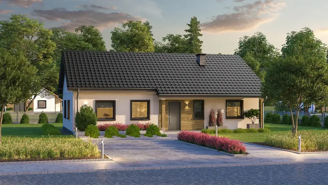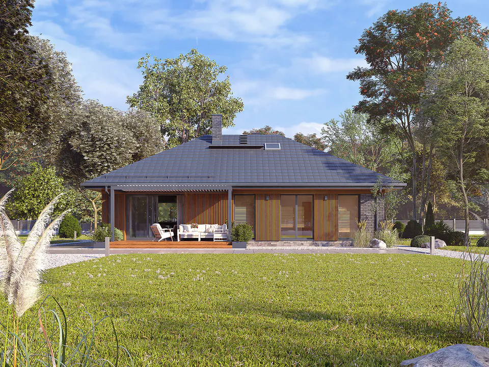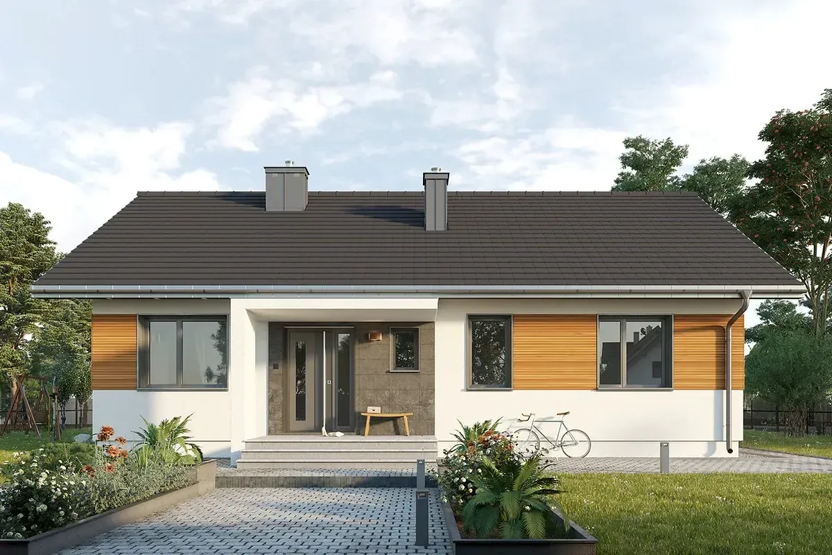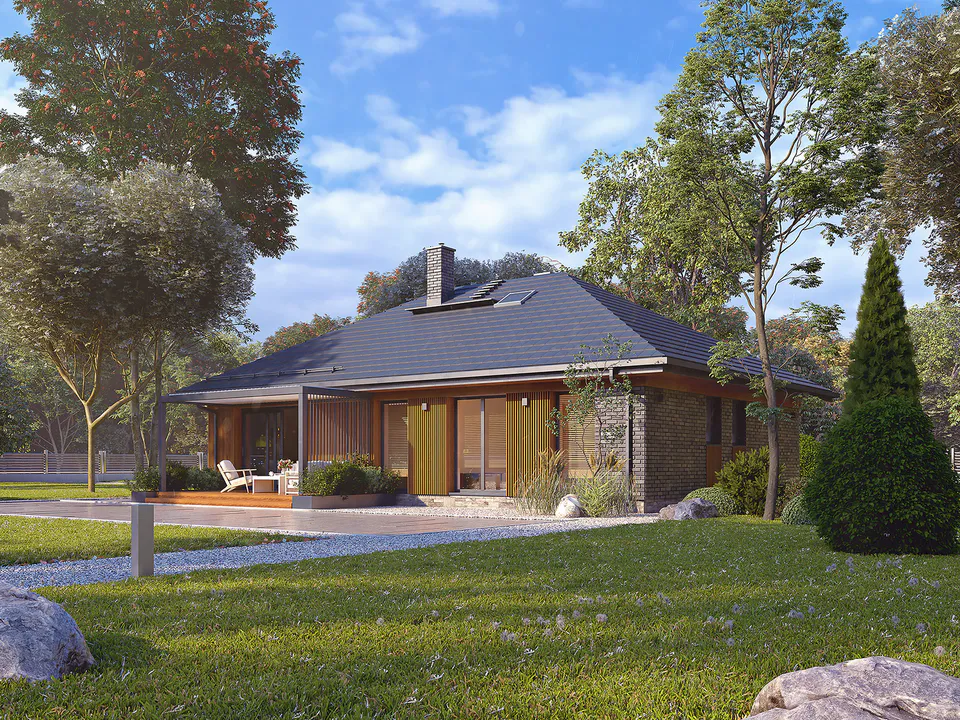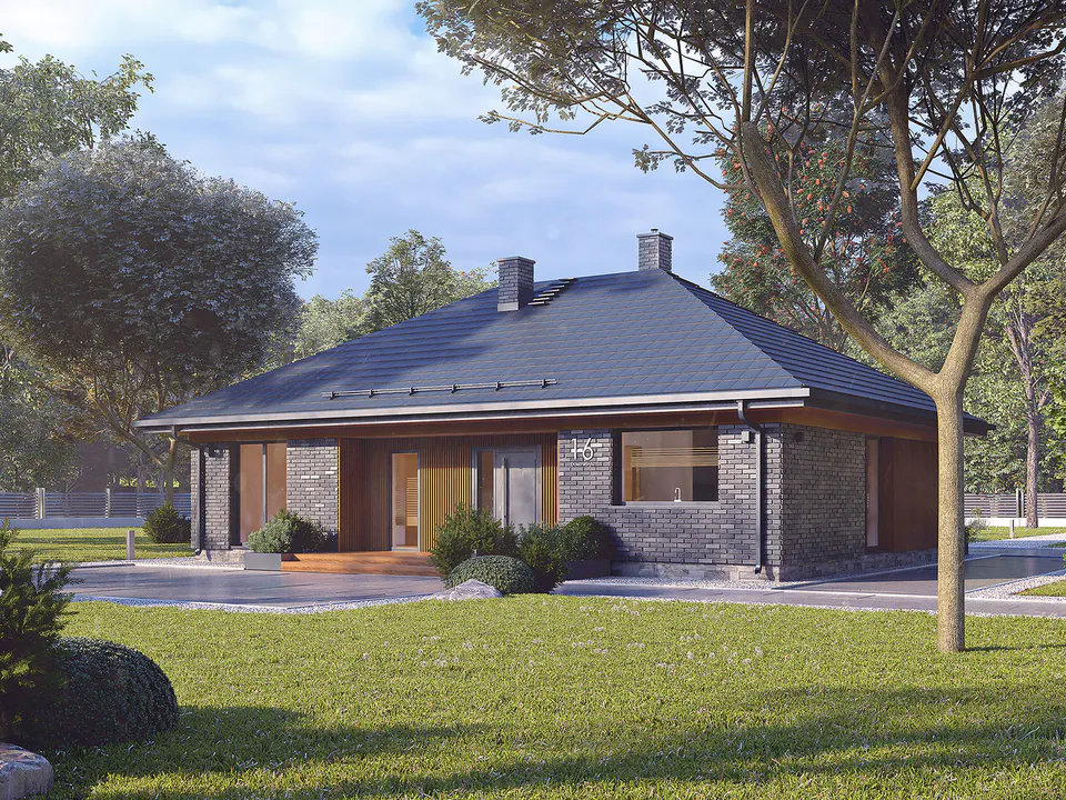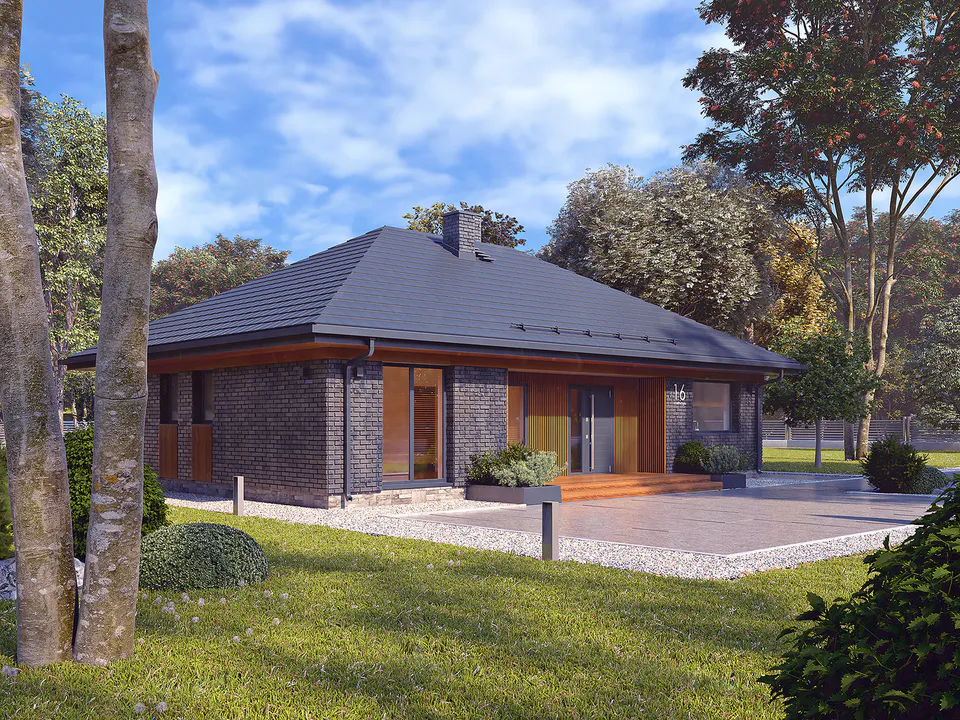 Фасад выполнен из темного кирпича, что придает дому стильный и элегантный вид. Крыша четырехскатная, покрыта керамической черепицей, что обеспечивает хорошую защиту от погодных условий. Вход в дом и терраса украшены деревянными панелями, добавляющими теплоты и уюта в дизайн.
