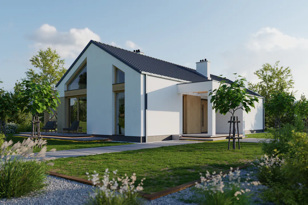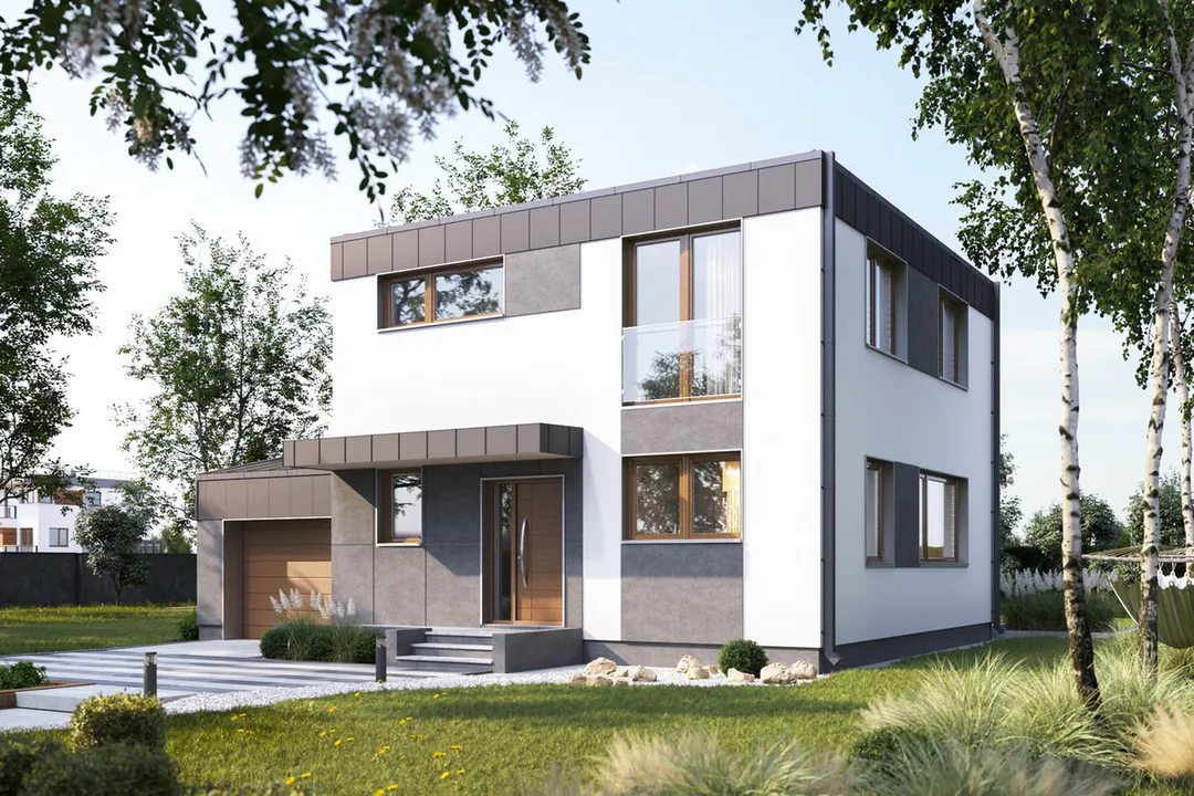 Проект представляет собой современный дом с чистыми, простыми линиями. В доме большие окна, которые обеспечивают обилие естественного освещения и великолепный вид на окружающую природу.