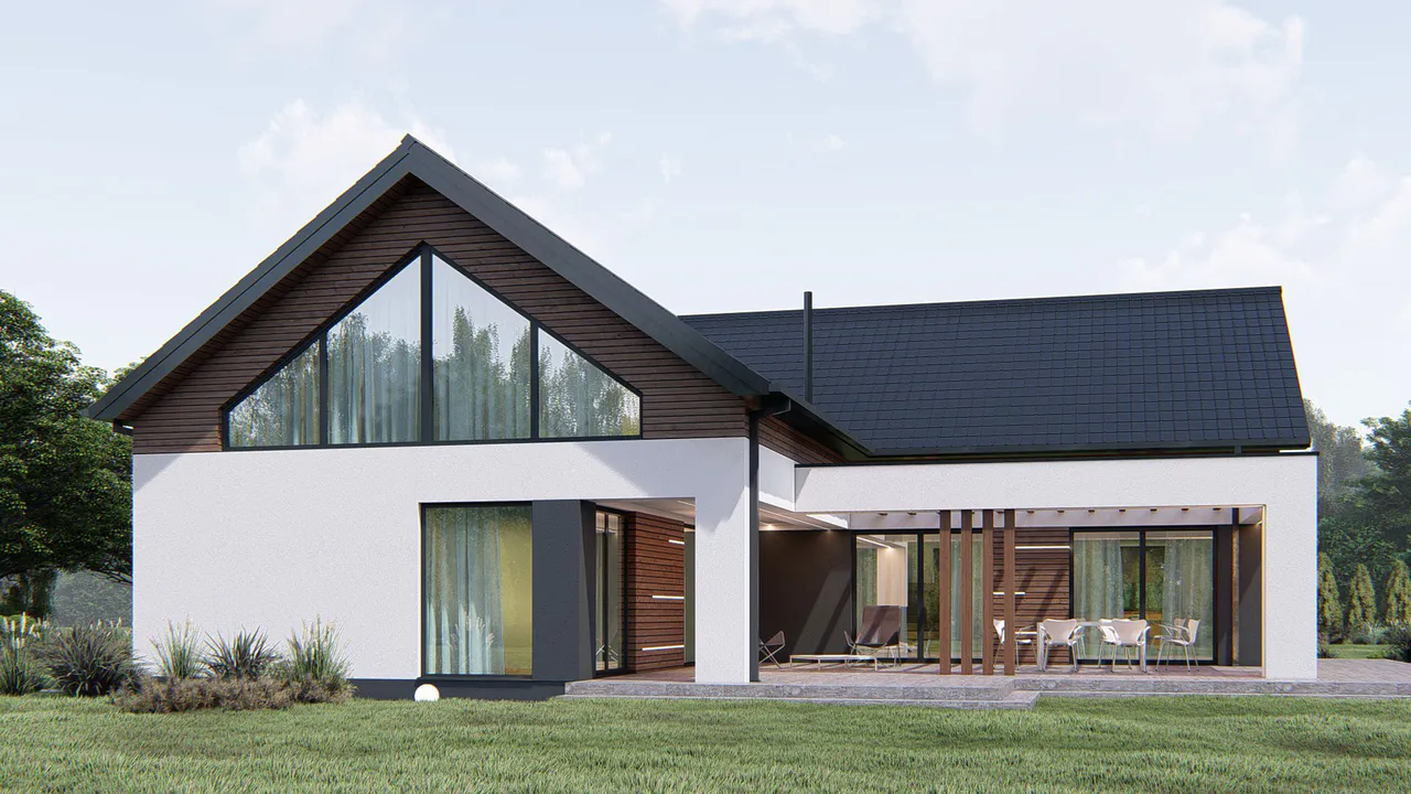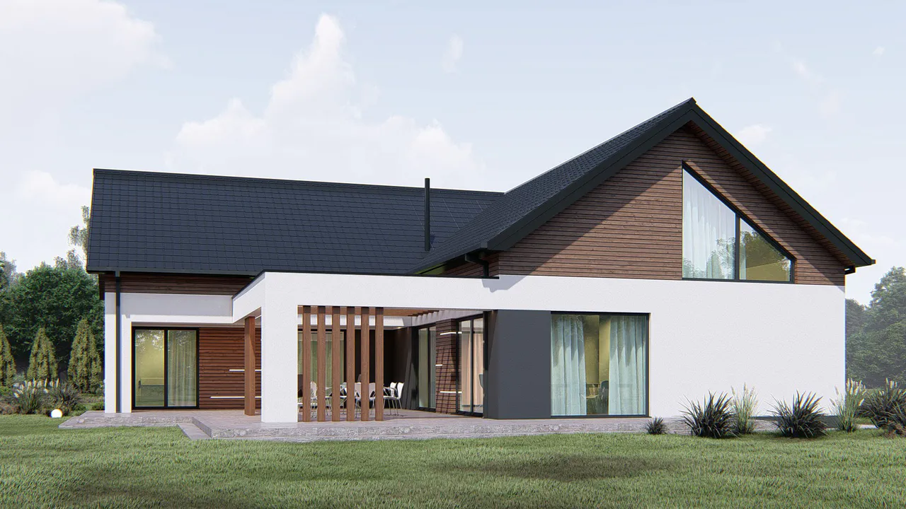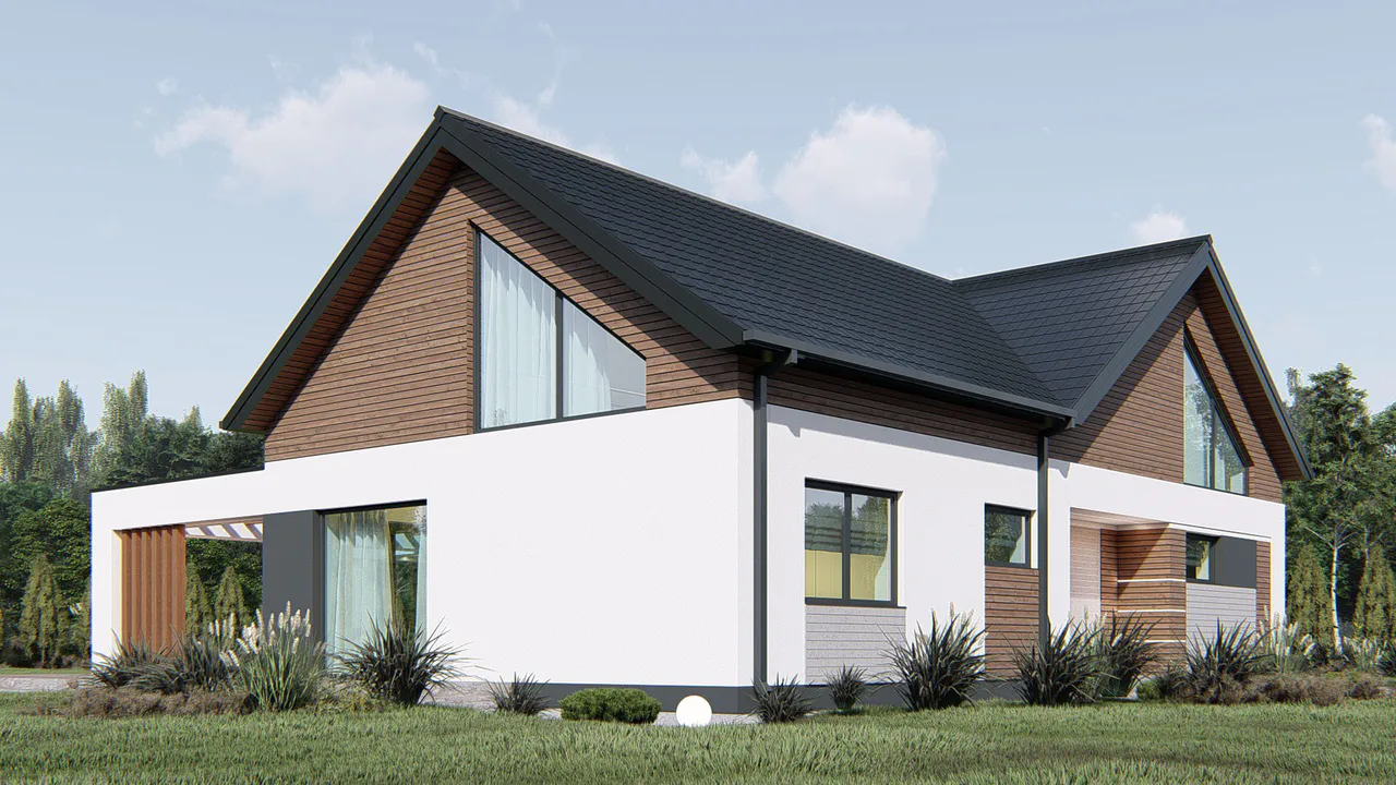 Фасад дома сочетает в себе современные линии и минималистичный дизайн. Внешние стены отделаны белой силиконовой штукатуркой и темно-коричневой облицовкой из деревянных панелей, создавая контрастный и элегантный вид.