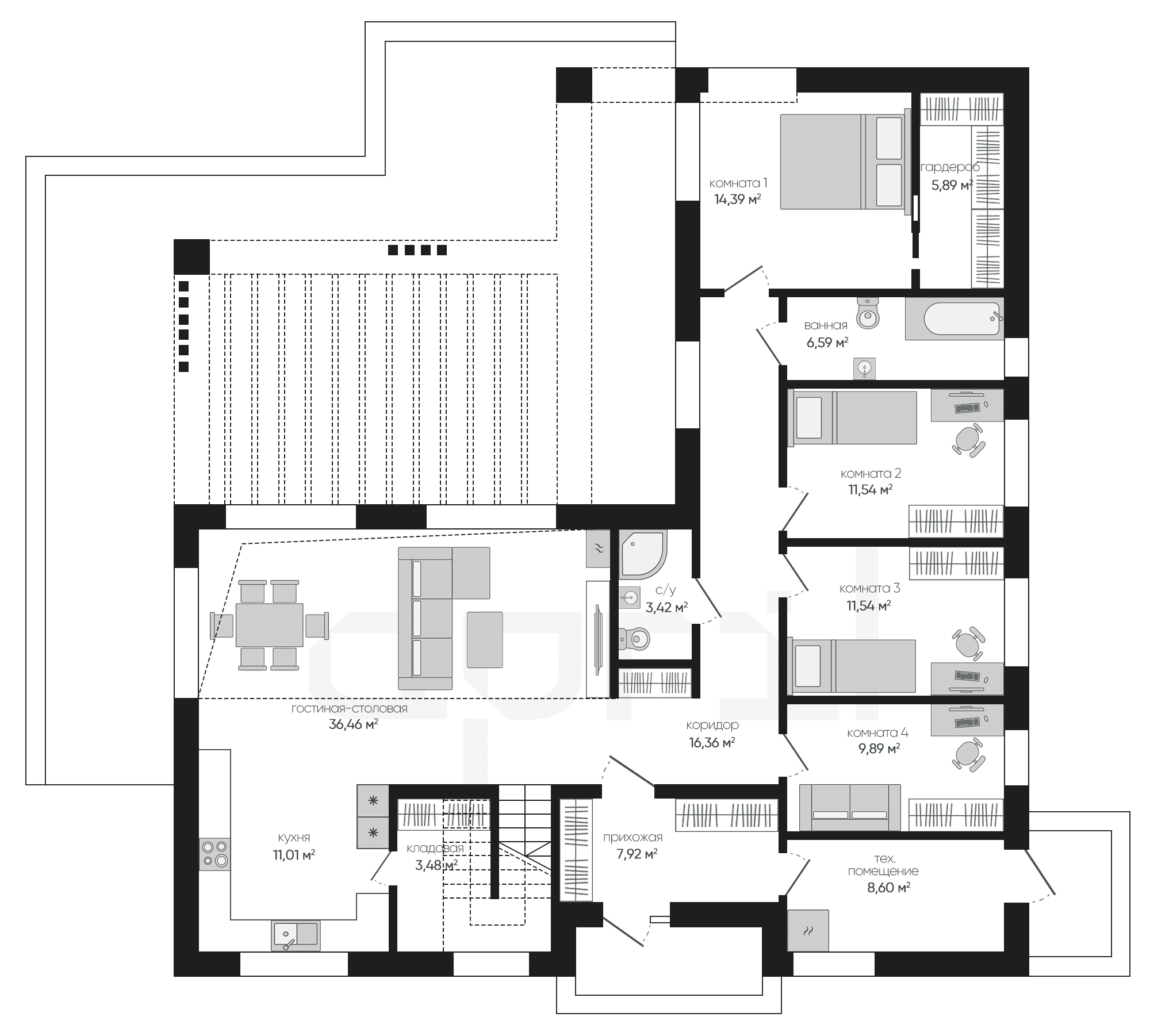 Четырехскатная крыша дома с металлочерепицей не только эстетически привлекательна, но и практична, обеспечивая надежную защиту от погодных условий. А большие окна, безусловно, служат не только источником естественного света, но и создали ощущение простора в интерьере.