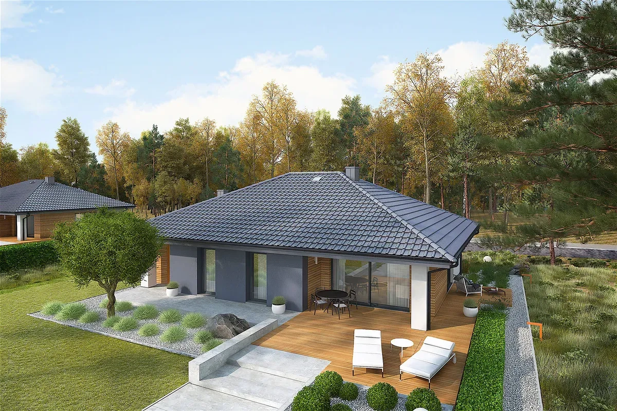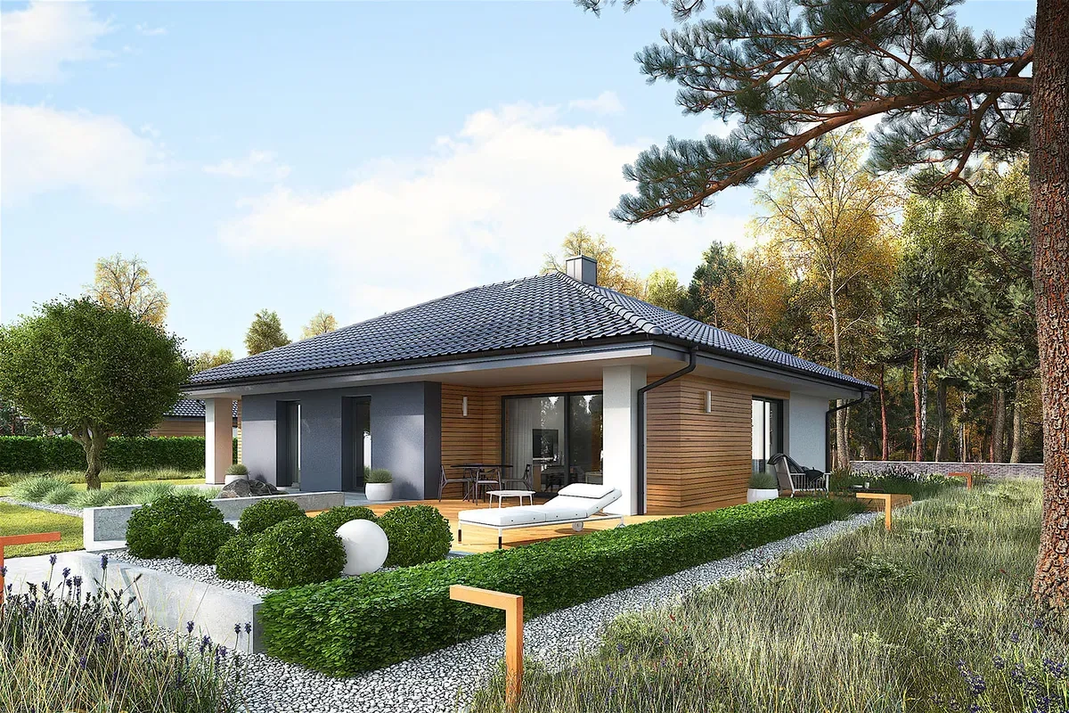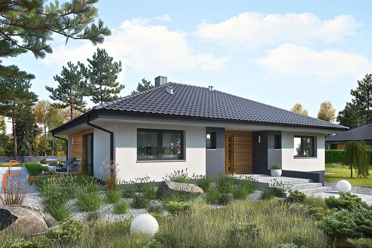 Яркий современный фасад с деревянными элементами и декоративной штукатуркой отлично сочетается с четырехскатной крышей, покрытой серой металлочерепицей.