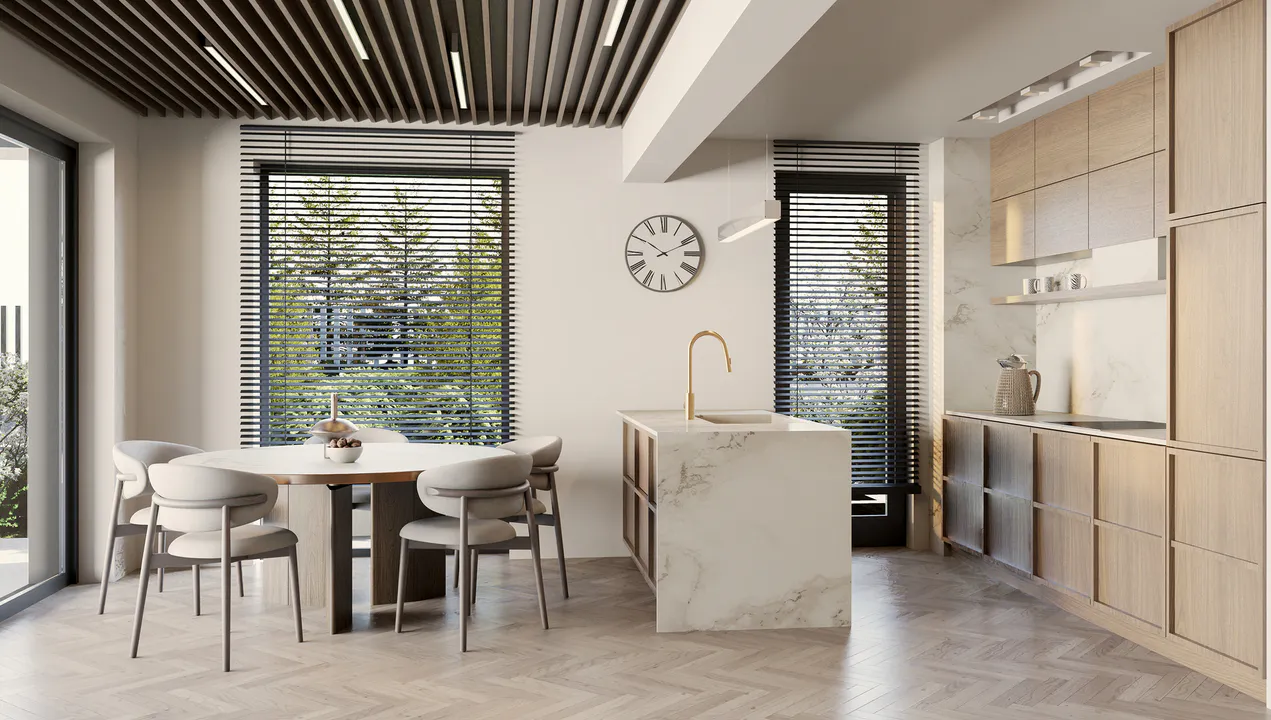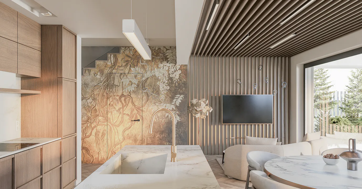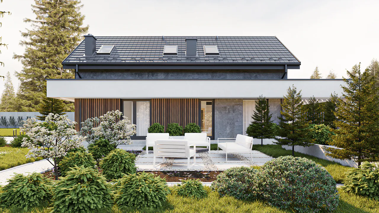Фасады покрыты белой и серой штукатуркой в сочетании с деревянными панелями. Крыша дома двускатная, покрытая керамической черепицей. Большое остекление добавляет современности и уникальности.