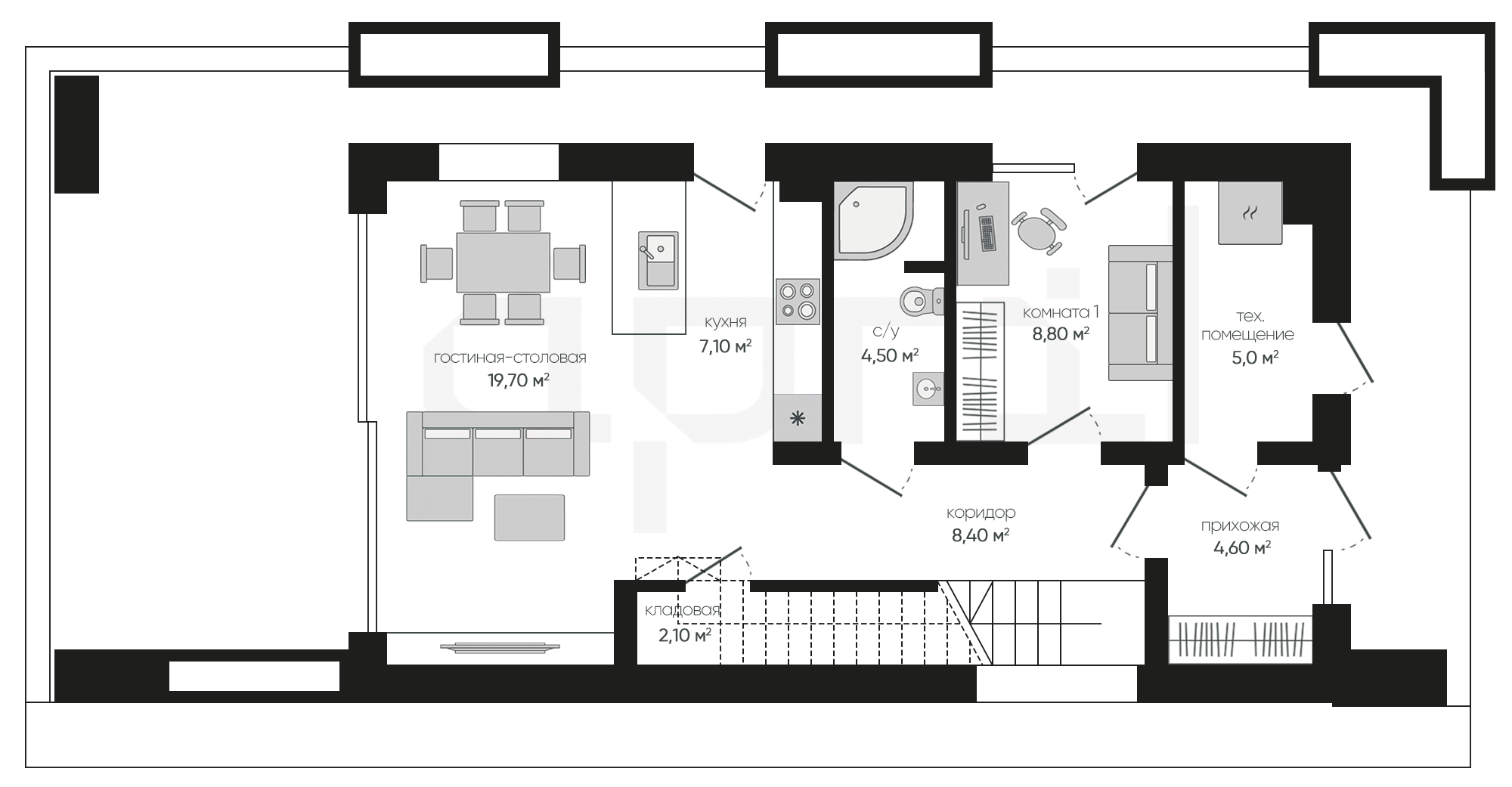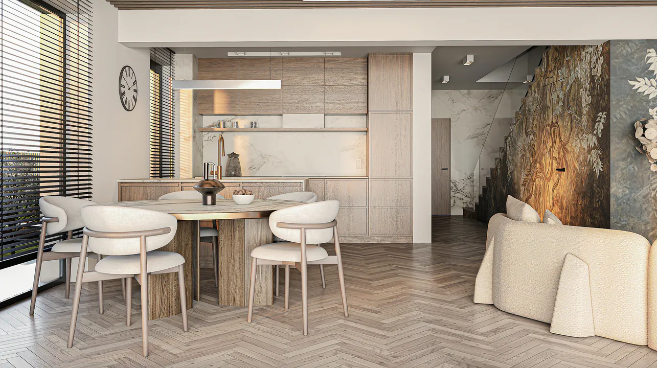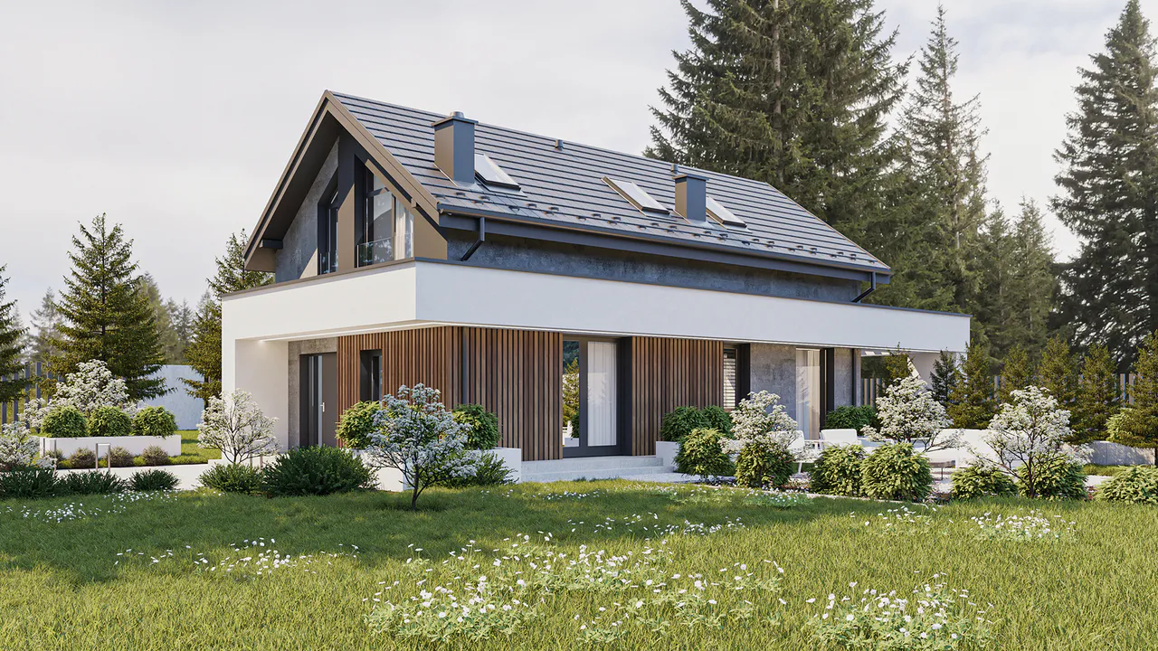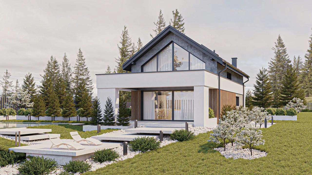 Проект небольшого дома, балансирующий между эстетикой и функциональностью. Планировка грамотно разделена между первым и мансардным этажами, обеспечивая комфортный дом для семьи из 4-5 человек.