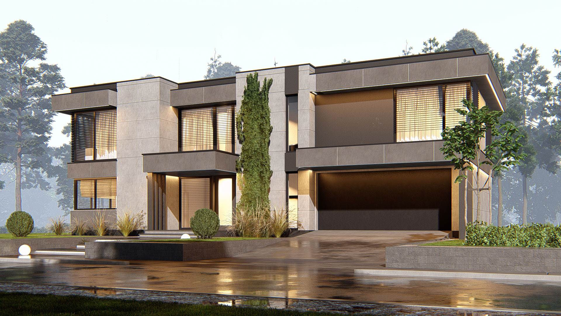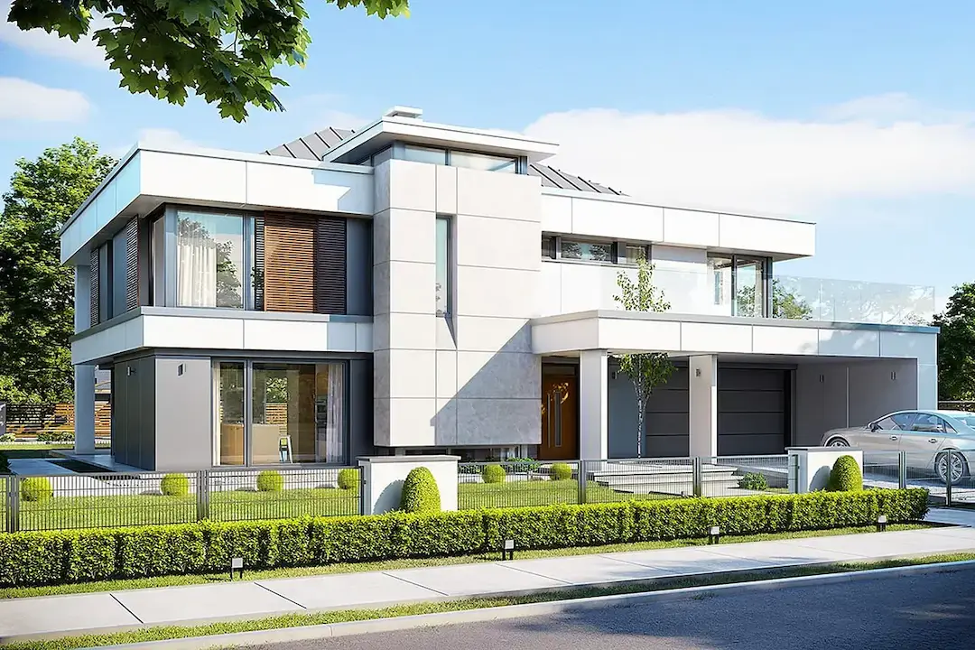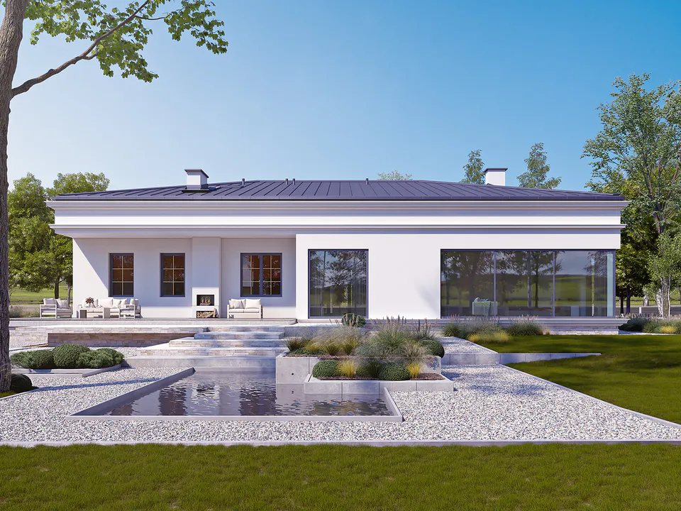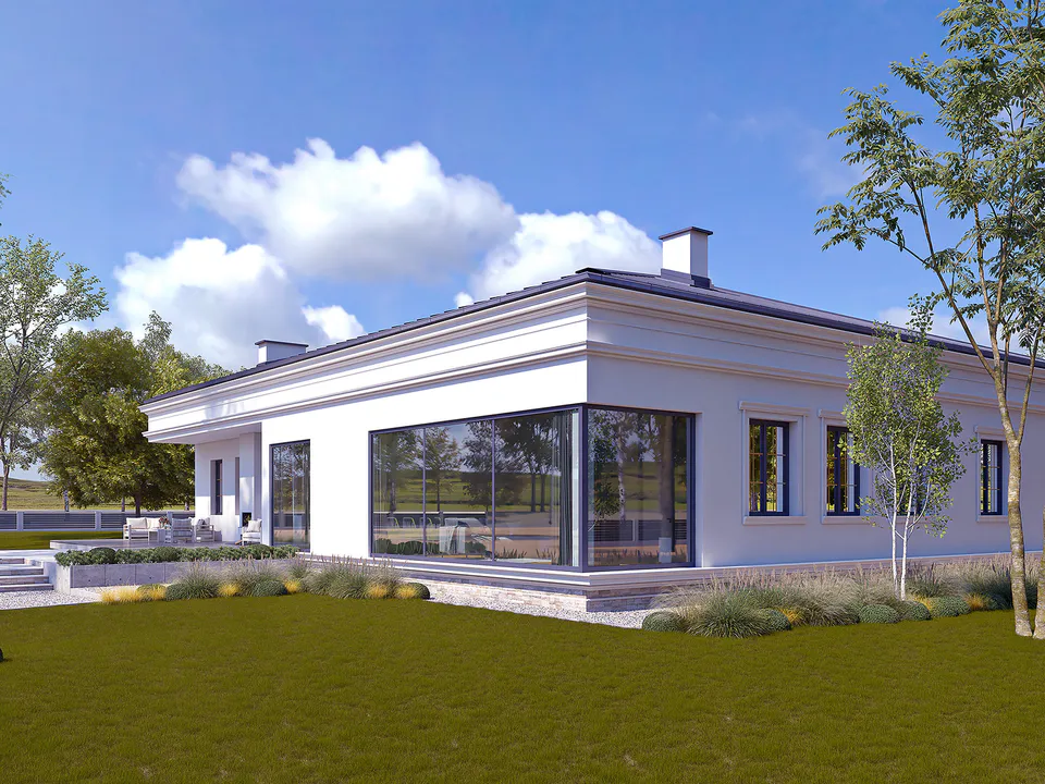 Дом прямоугольной формы, с белой фасадной отделкой. Он оснащён высокими окнами с рамами, которые добавляют зданию элегантности. Центральный вход украшен колоннами, придающими дому особую изысканность.