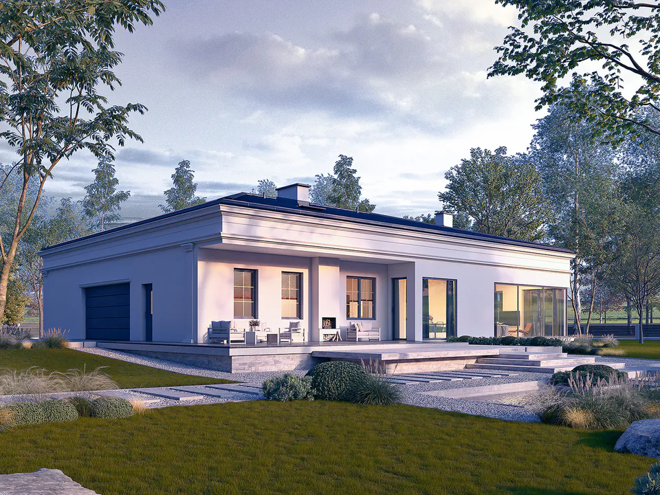 Проект одноэтажного дома с просторным гаражом, четырехскатной крышей и террасой в классическом стиле.