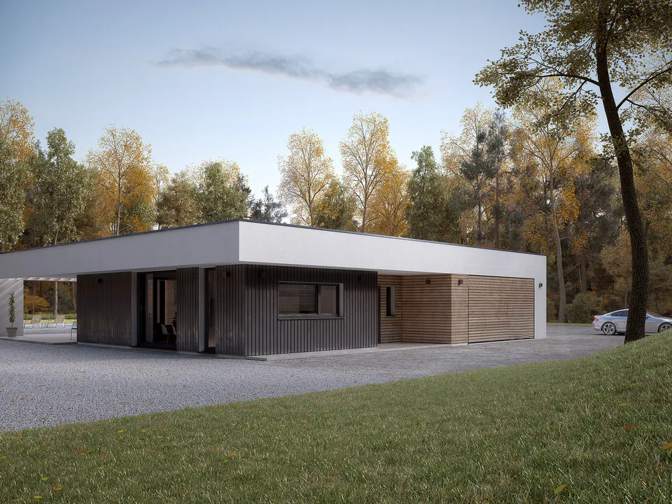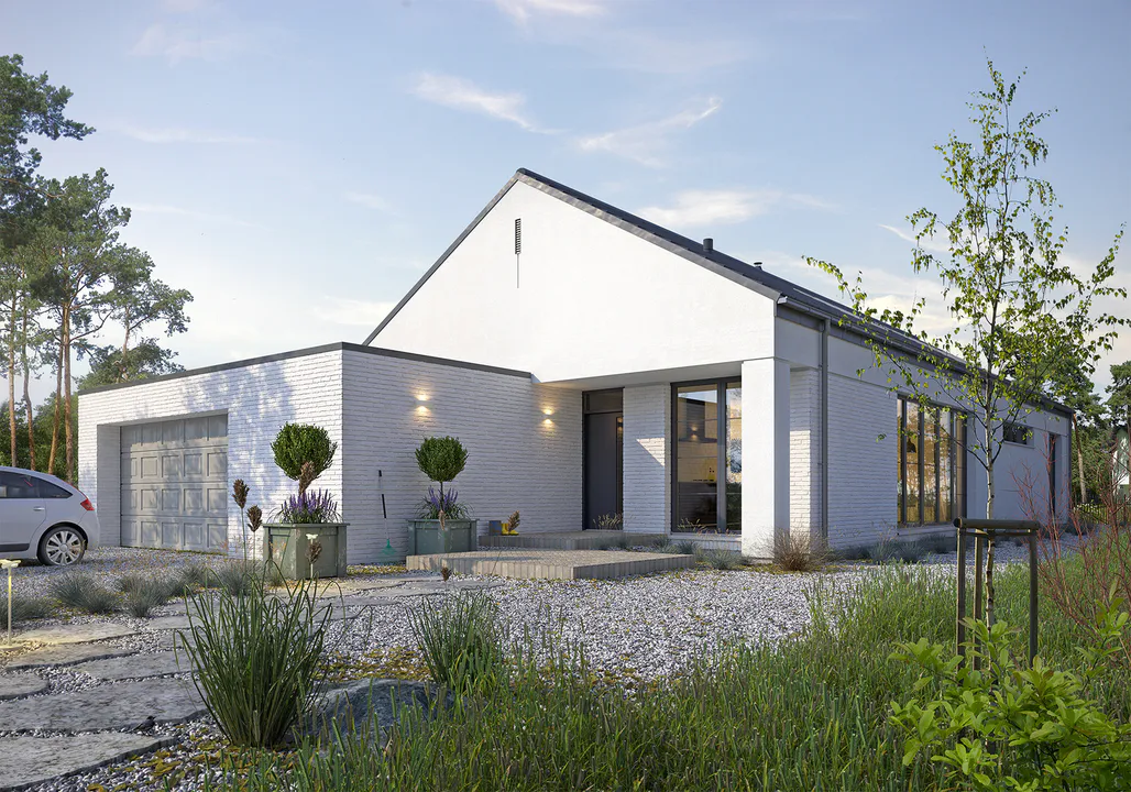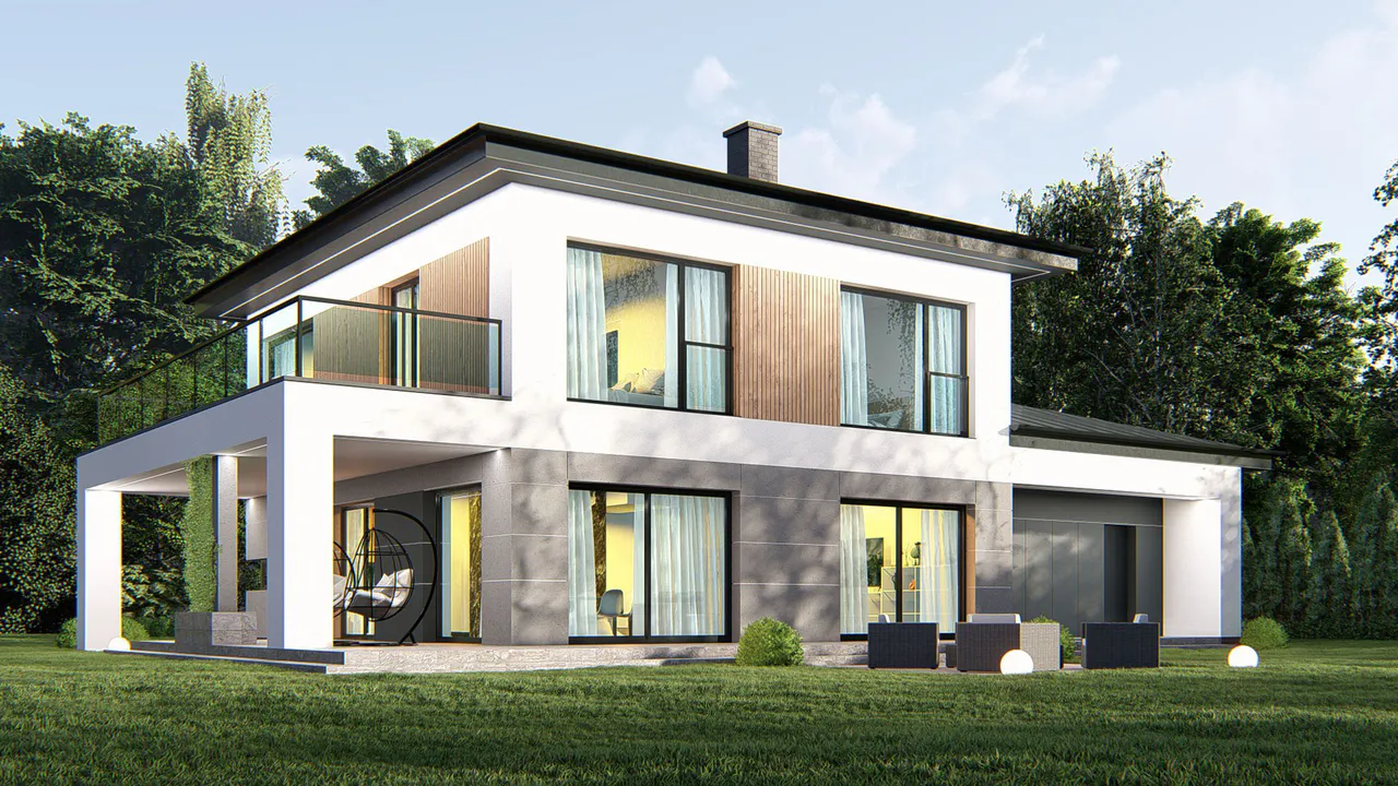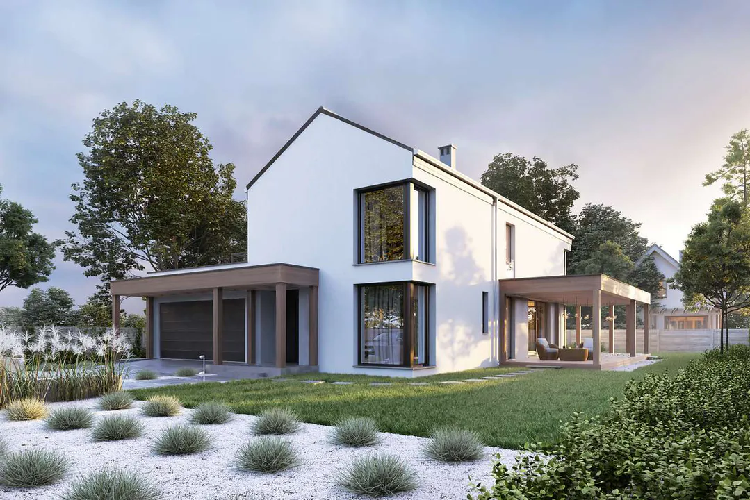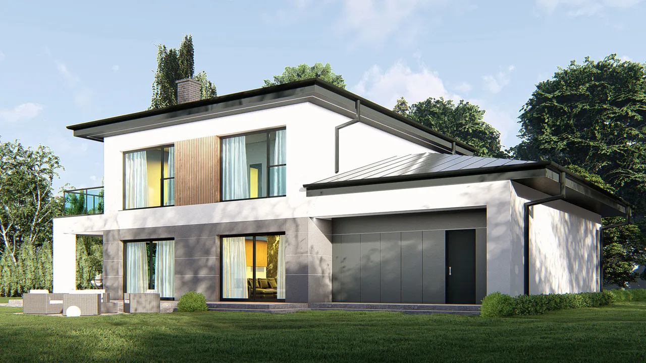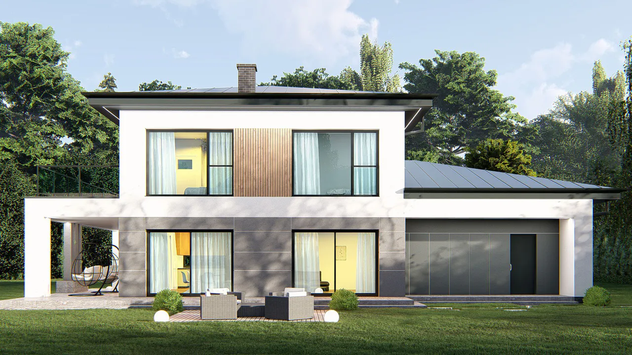 Фасад покрыт белой штукатуркой с элементами фасадной деревянной доски, серой плитки и кирпича. Простую форму дома дополняет четырехскатная крыша, покрытая фальцевым листом.