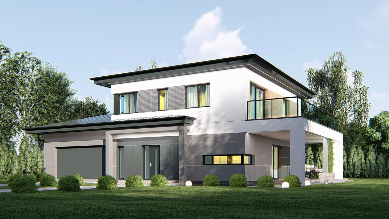 Проект двухэтажного современного дома в стиле Райт с гаражом и террасой.